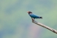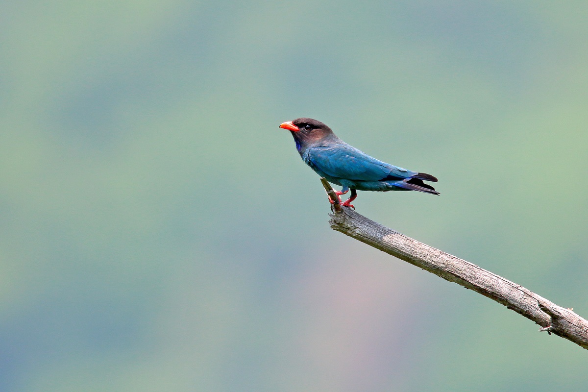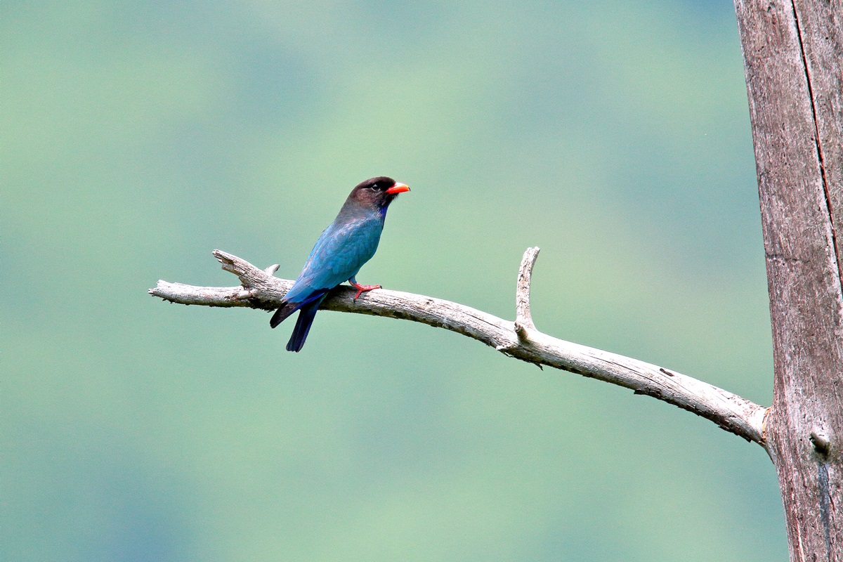 ブッポウソウ ( 仏法僧 ) Eurystomus orientalis Bload-billed Roller L=30cm W=71cm ( 名前の由来 ) 仏教の霊地の森林で繁殖しているのを観察され、 平安時代以来ブッポウソウ( 仏法僧 )と鳴く霊鳥と思われてきた。 そのまま 鳴き声が名前となったが間違いであり、 「ブッポウソウ」と鳴くのはフクロウ目のコノハズクである。 ブッポウソウは「 グェッ・グェッ 」と鳴く。