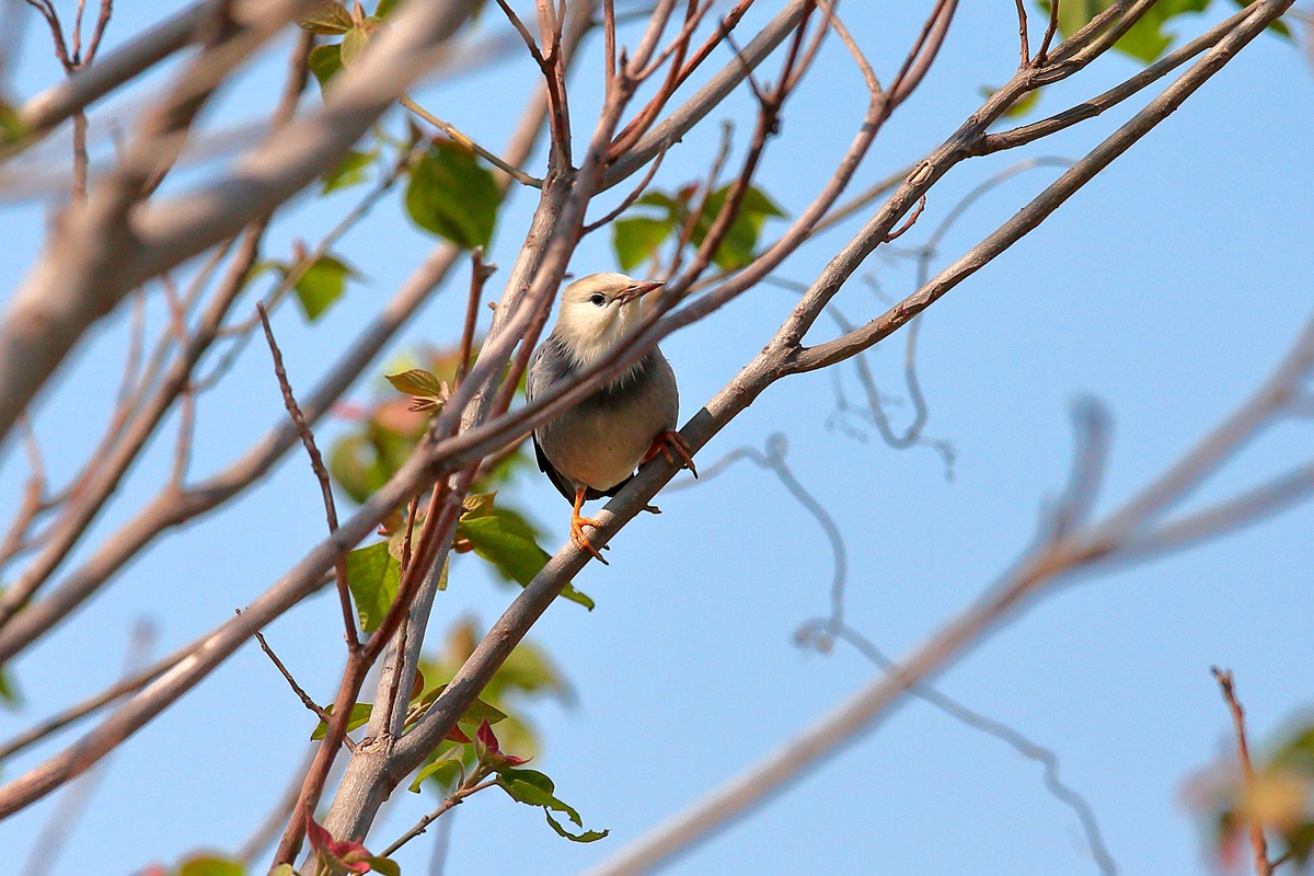 ギンムクドリ ( 銀椋鳥 ) Sturnus sericeus Red-billed starling L=24cm W=40cm ( 名前の由来 ) 頭から背 胸にかけて青味のある灰褐色であり、 それが銀色に見えることによる。