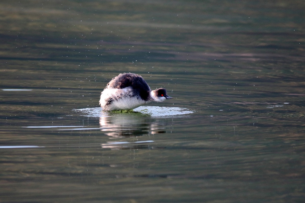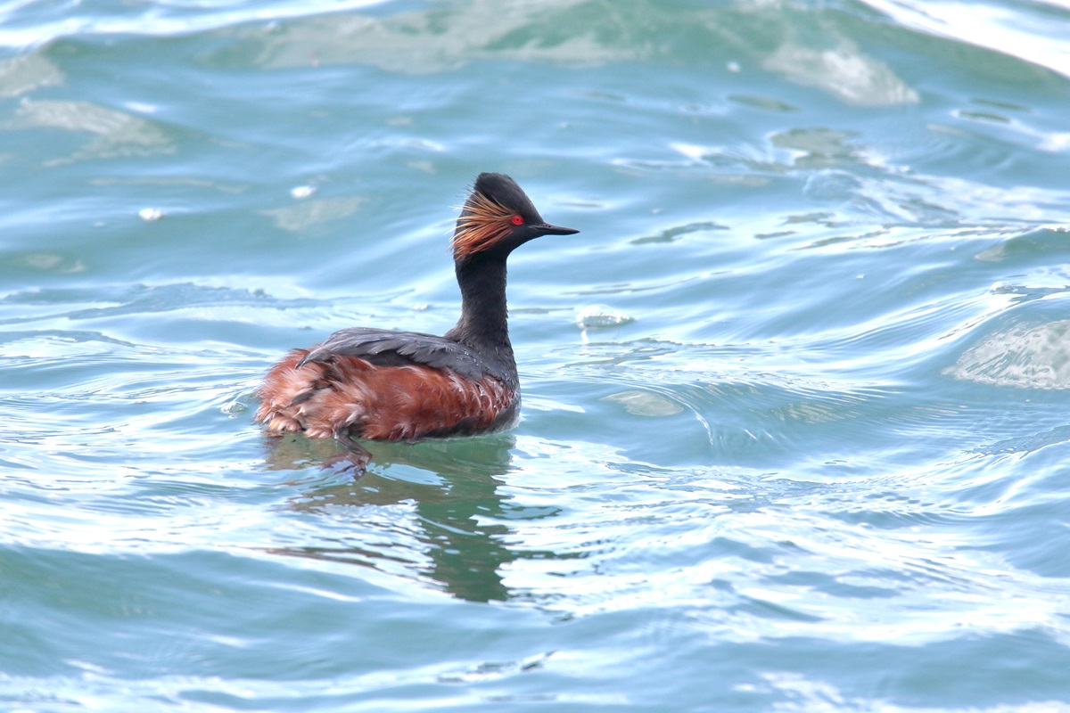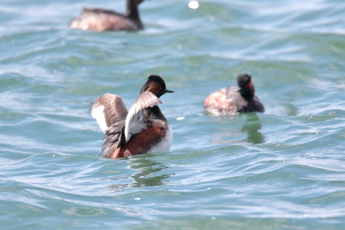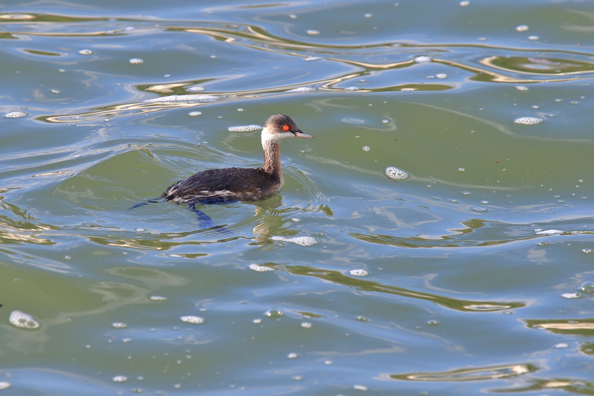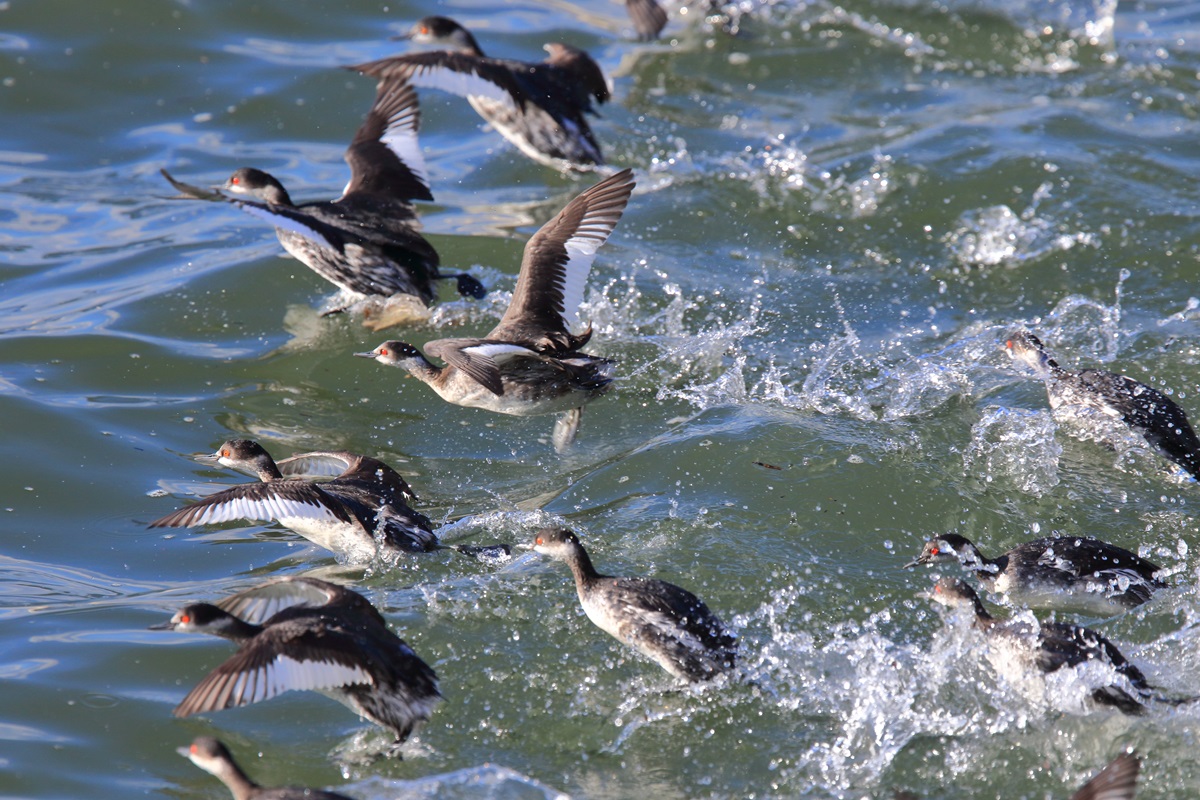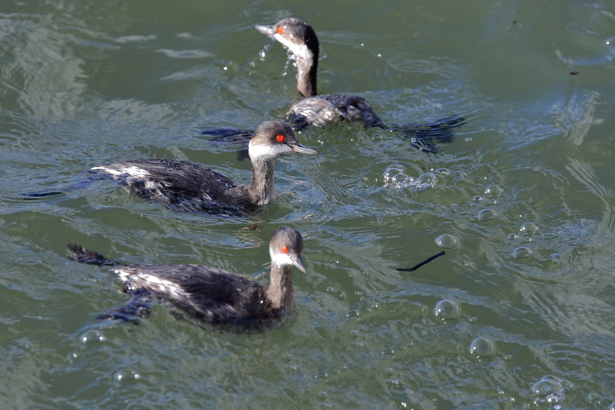 ハジロカイツブリ ( 羽白鳰 ) Podiceps nigricollis Black-necked Grede L=33cm W=56cm ( 名前の由来 ) 飛びたつと羽の内側に白い部分が見え、これが名前の由来になっている。 カイツブリとは その昔 動きを見て・・・掻き頭潜り( かきつぶり )と名付けた。