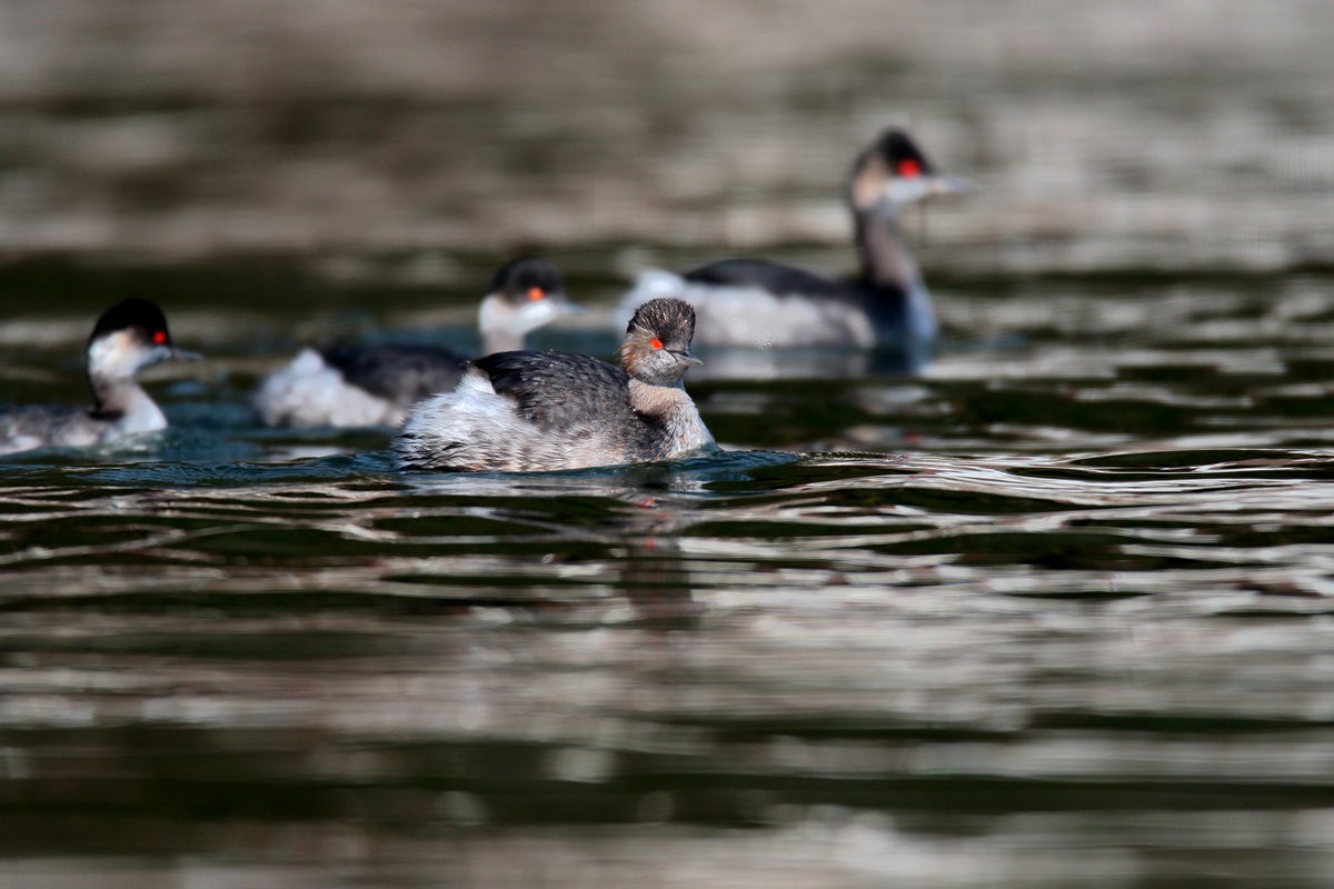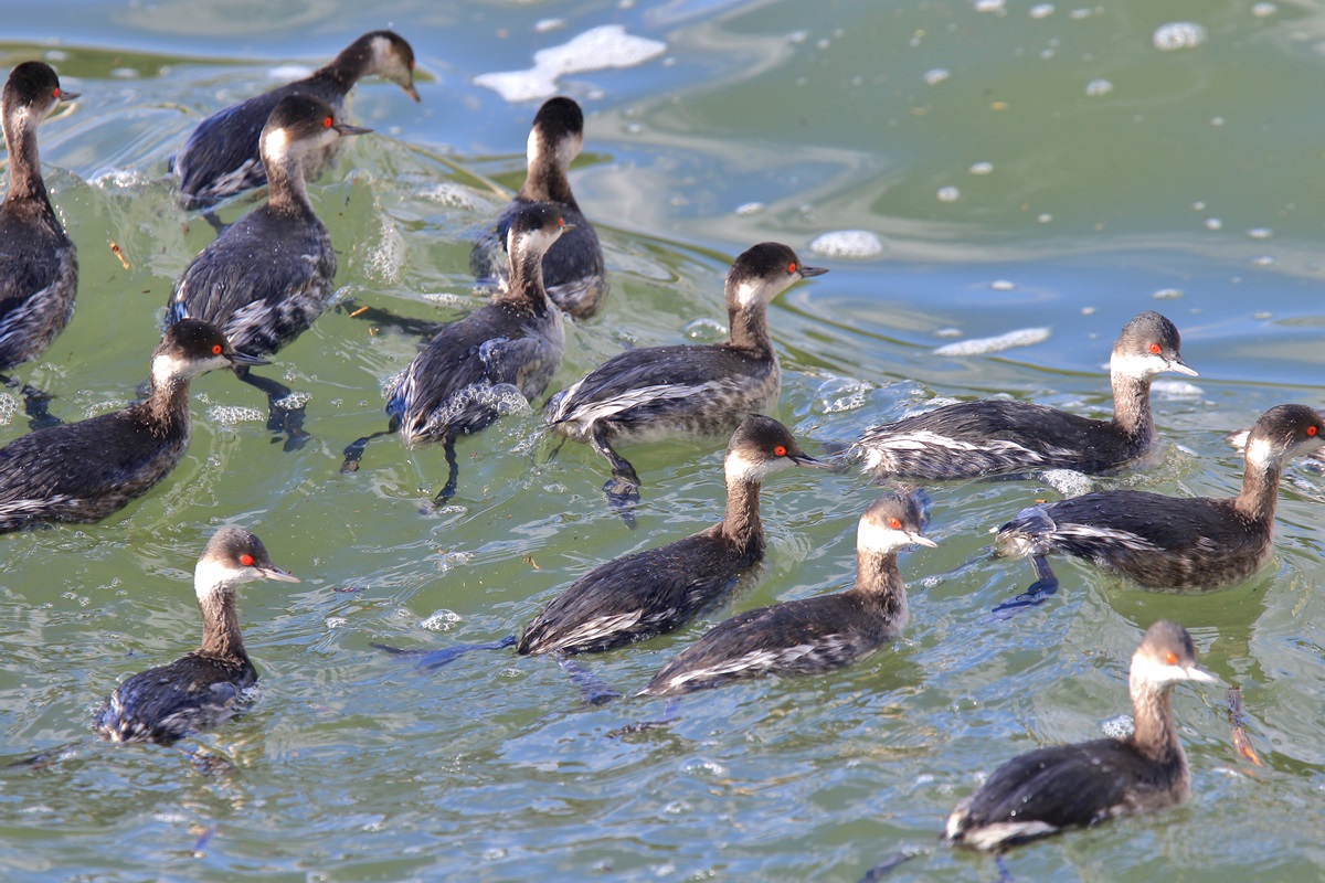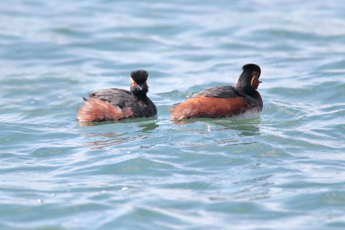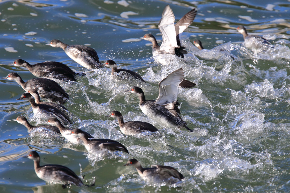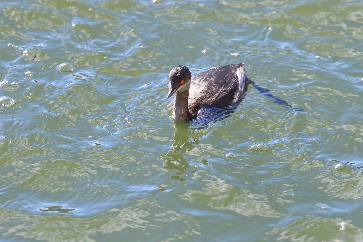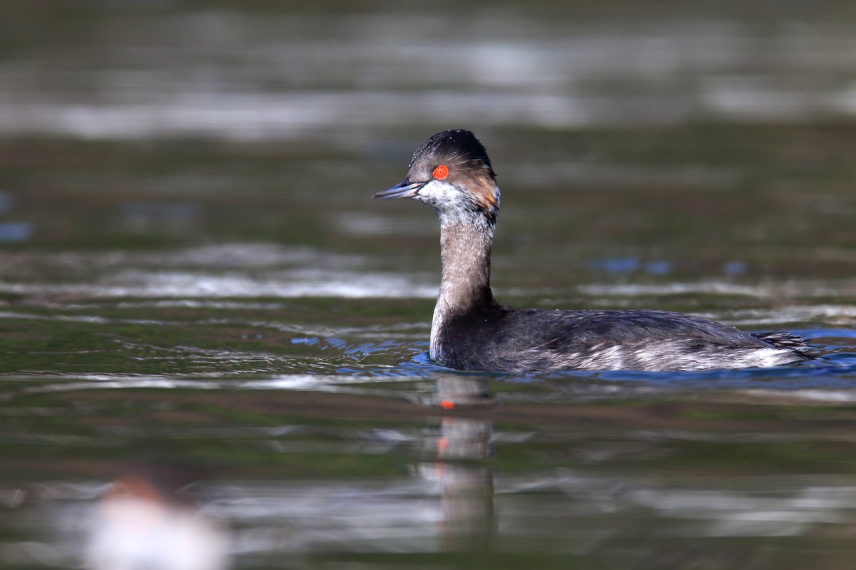 ハジロカイツブリ ( 羽白鳰 ) Podiceps nigricollis Black-necked Grede L=33cm W=56cm ( 名前の由来 ) 飛びたつと羽の内側に白い部分が見え、これが名前の由来になっている。 カイツブリとは その昔 動きを見て・・・掻き頭潜り( かきつぶり )と名付けた。