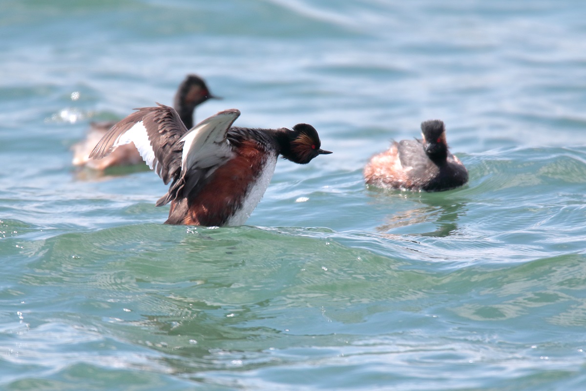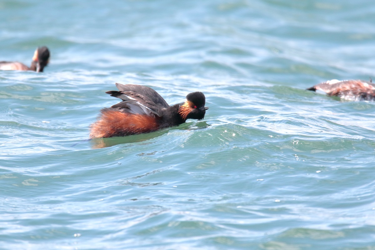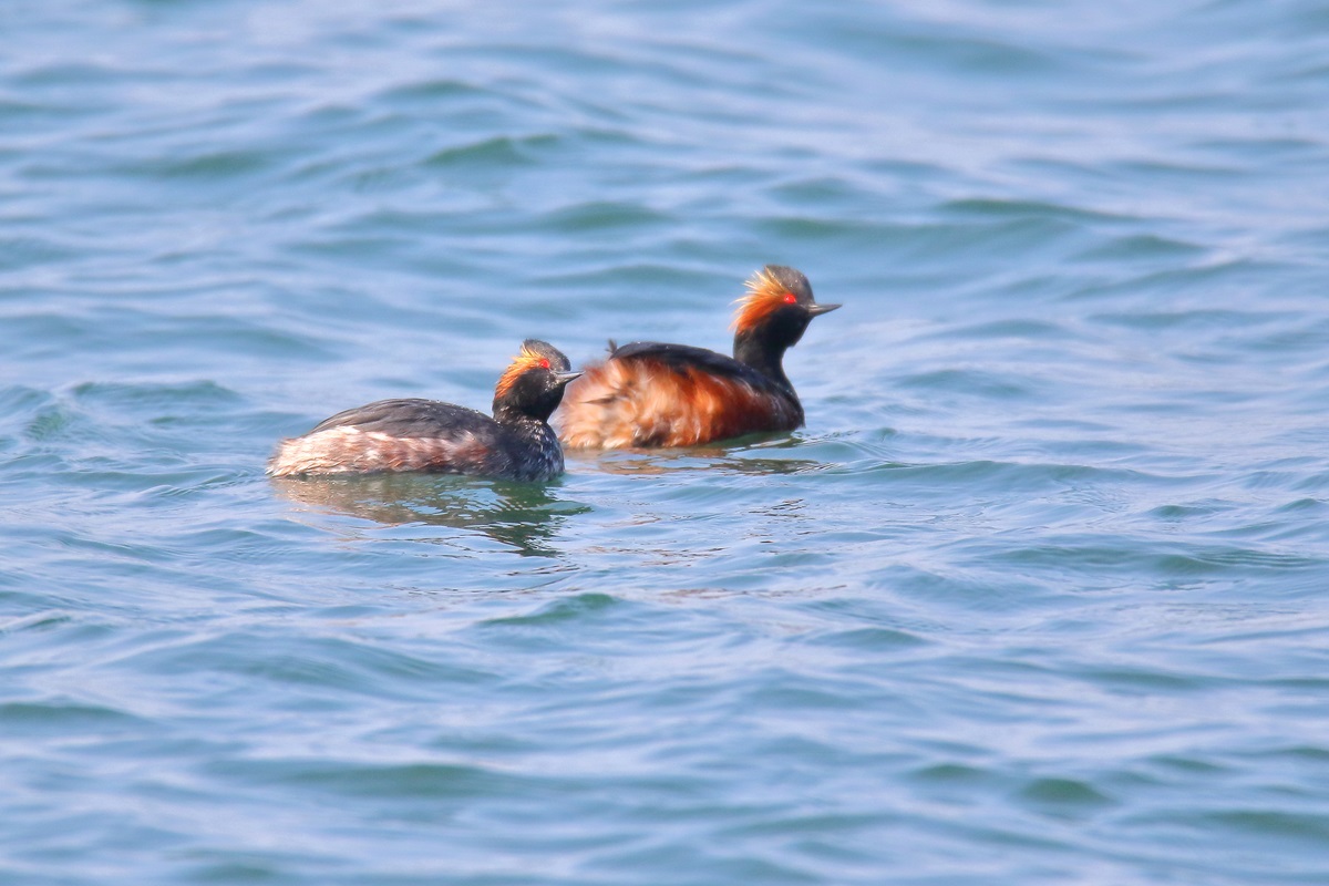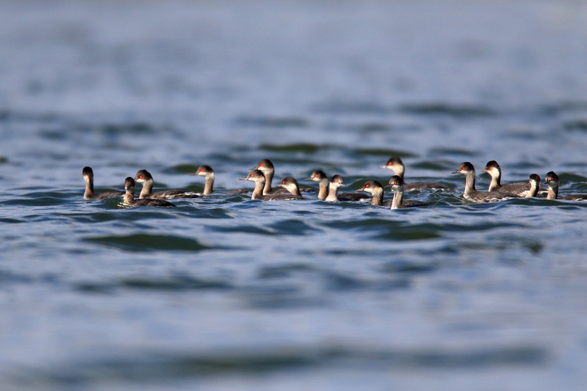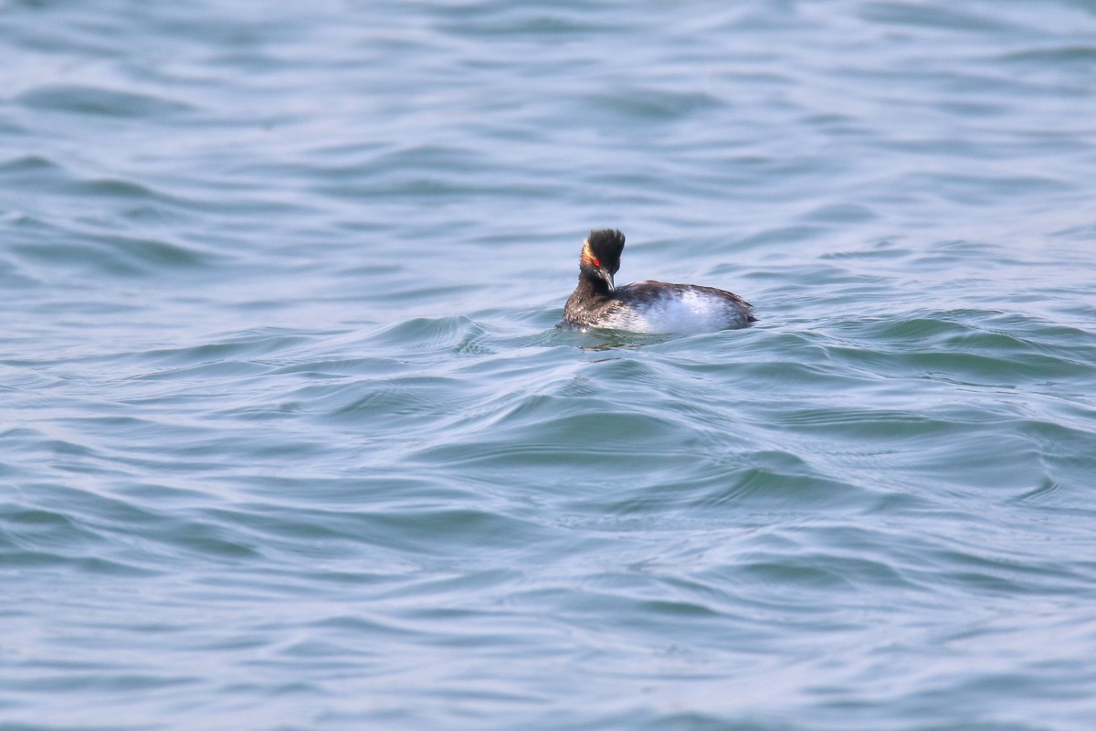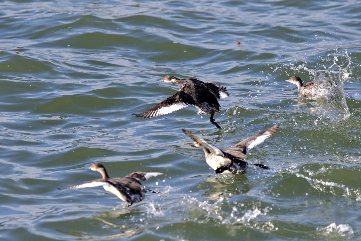 ハジロカイツブリ ( 羽白鳰 ) Podiceps nigricollis Black-necked Grede L=33cm W=56cm ( 名前の由来 ) 飛びたつと羽の内側に白い部分が見え、これが名前の由来になっている。 カイツブリとは その昔 動きを見て・・・掻き頭潜り( かきつぶり )と名付けた。