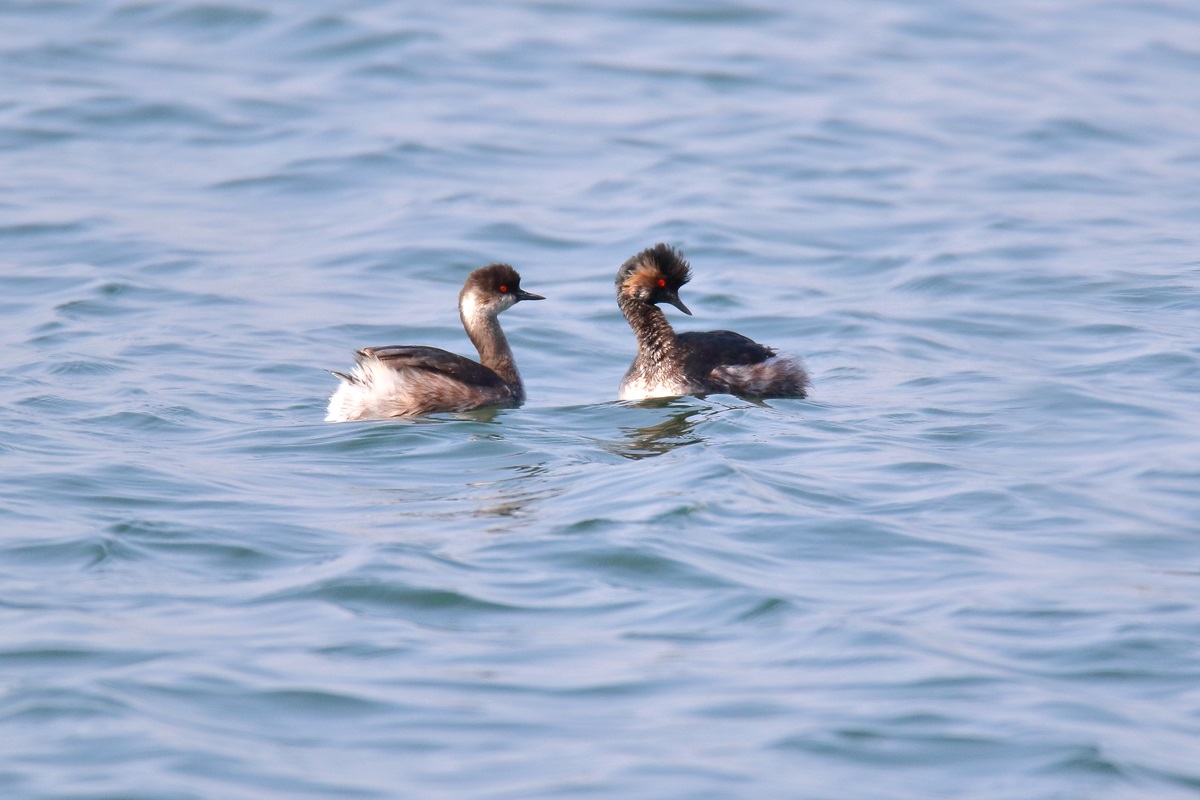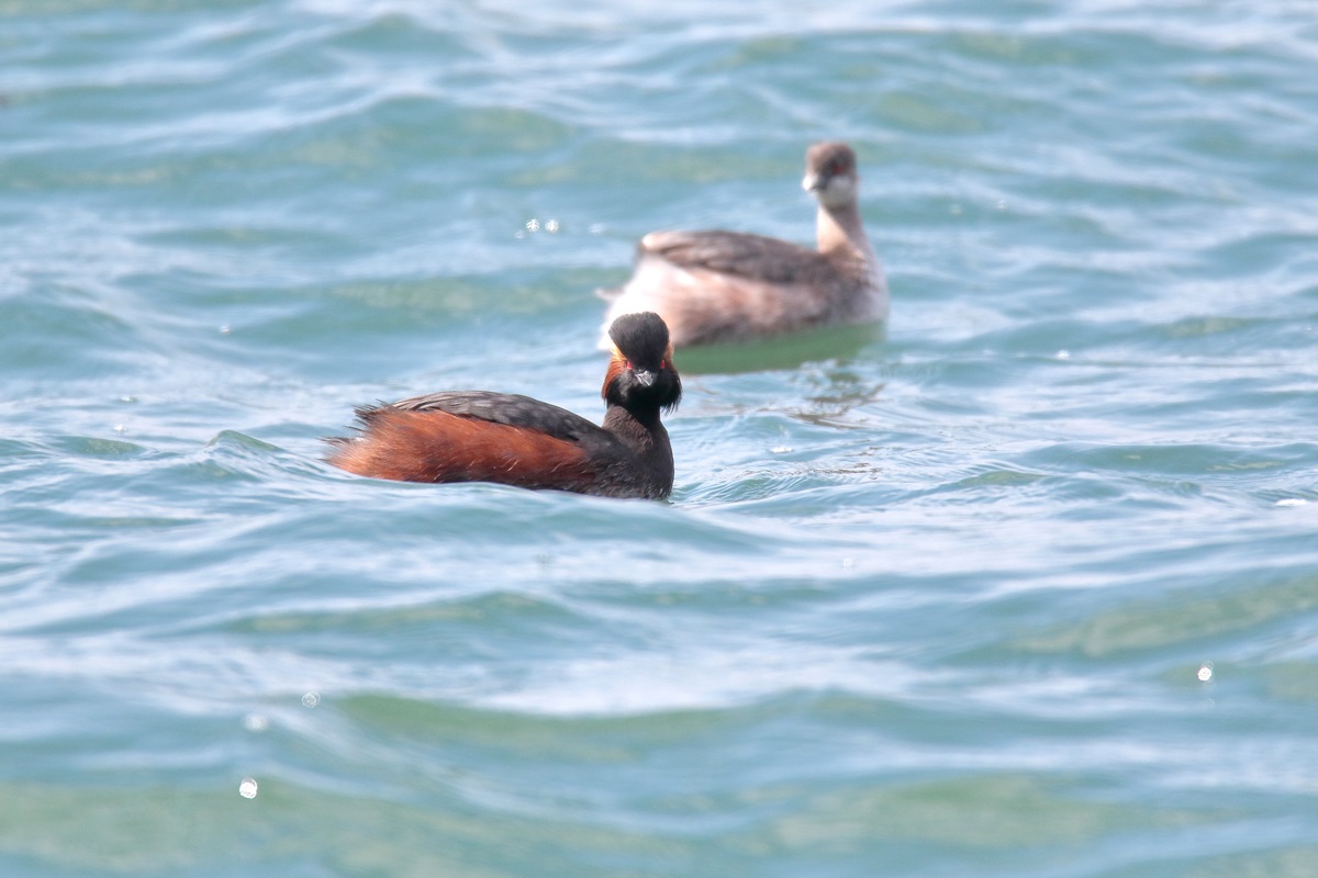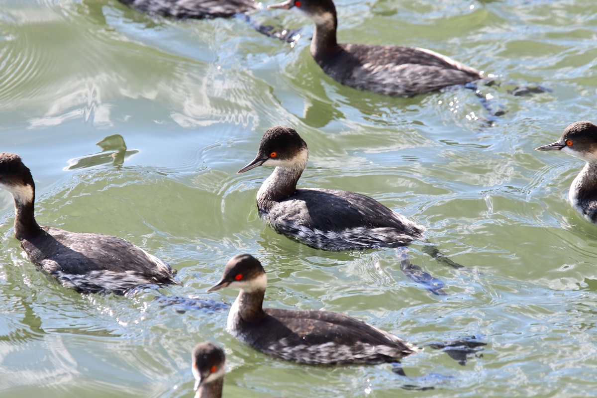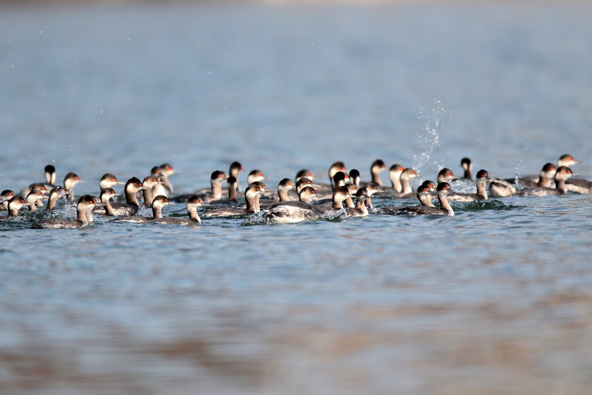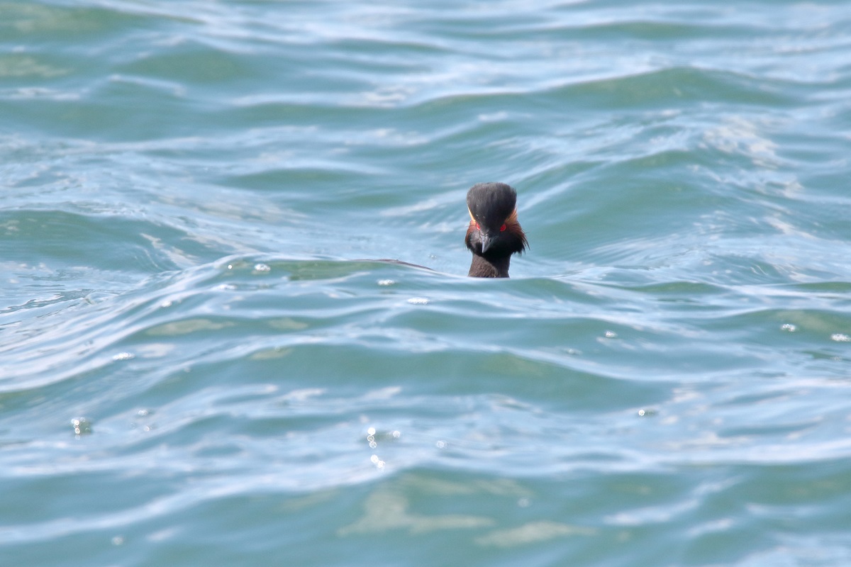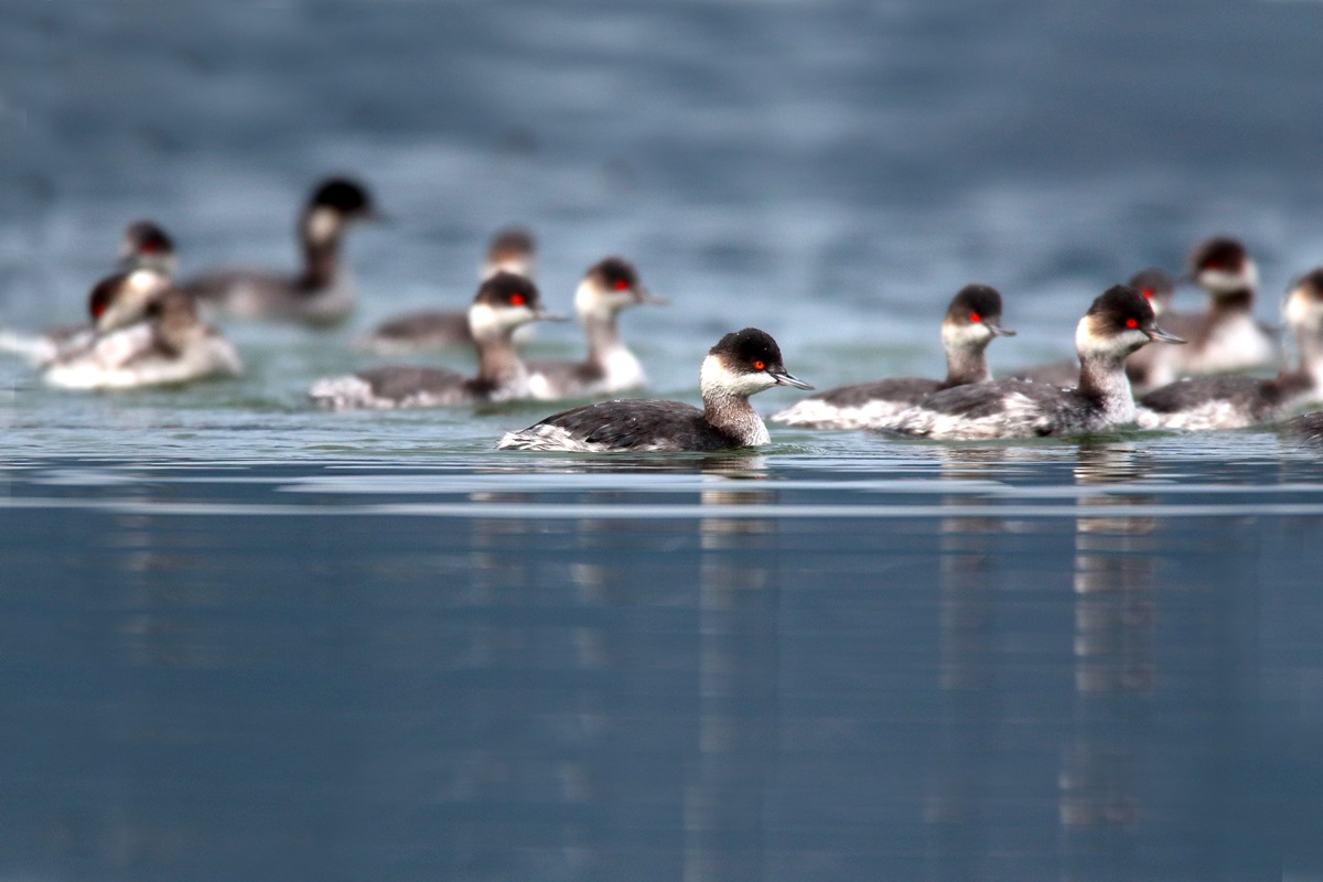 ハジロカイツブリ ( 羽白鳰 ) Podiceps nigricollis Black-necked Grede L=33cm W=56cm ( 名前の由来 ) 飛びたつと羽の内側に白い部分が見え、これが名前の由来になっている。 カイツブリとは その昔 動きを見て・・・掻き頭潜り( かきつぶり )と名付けた。