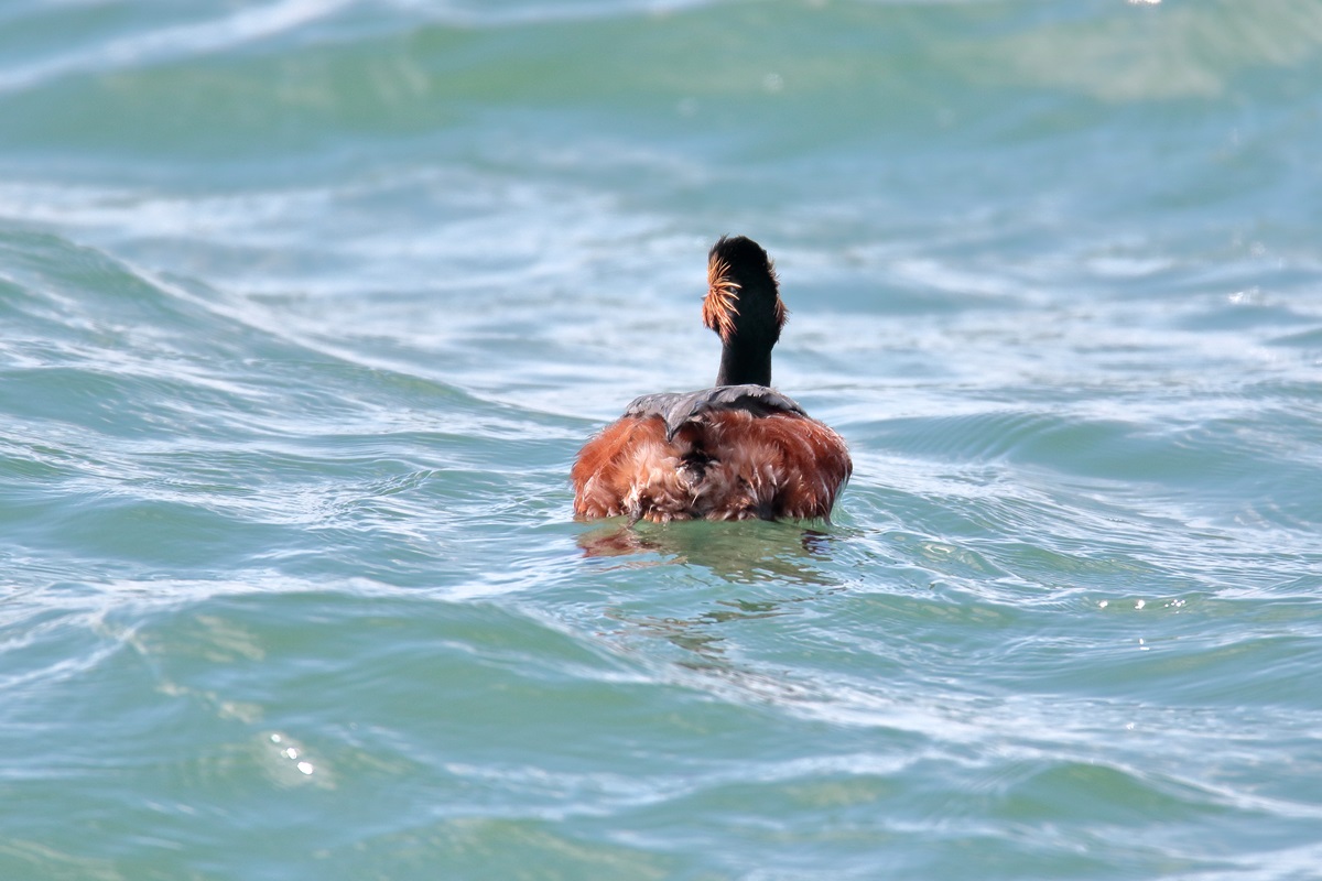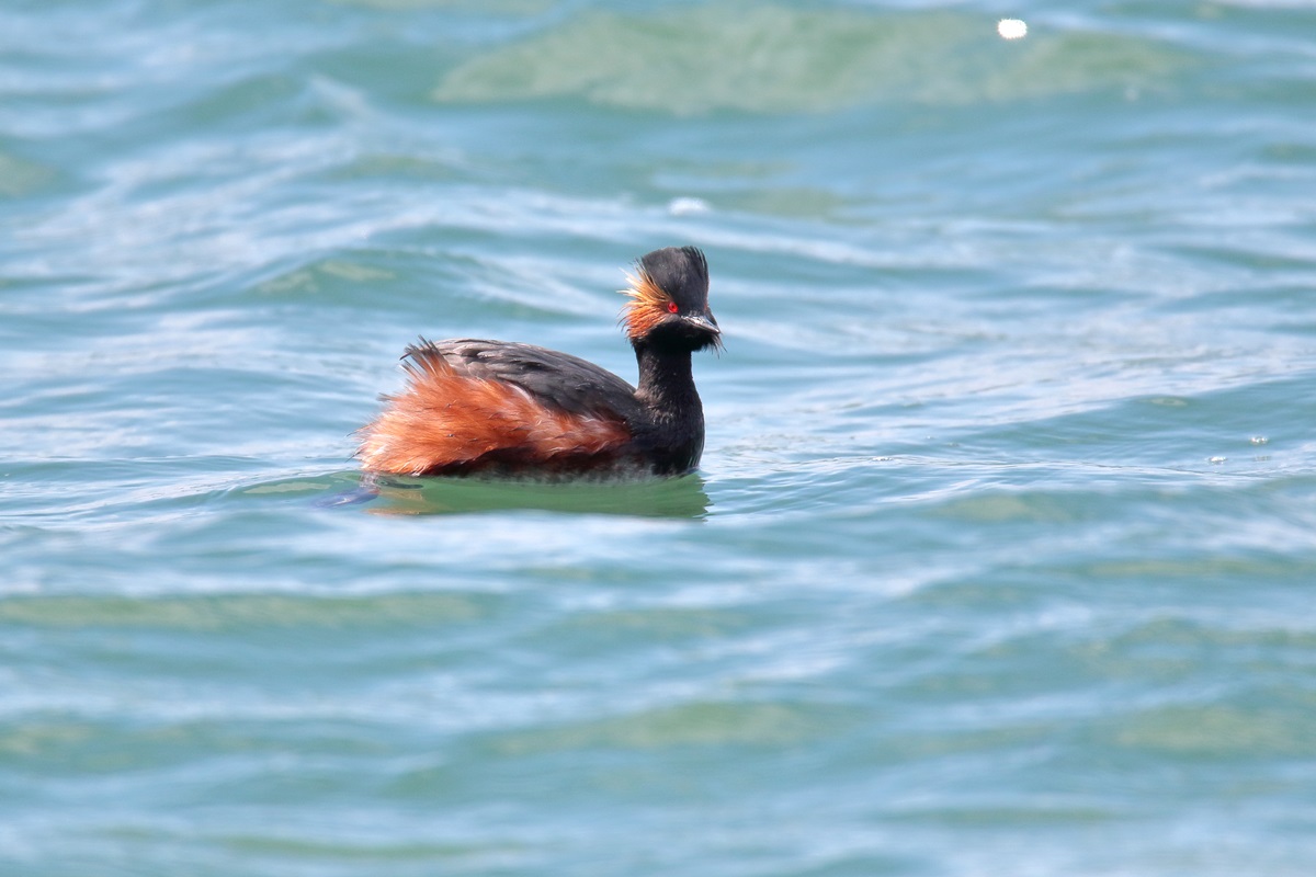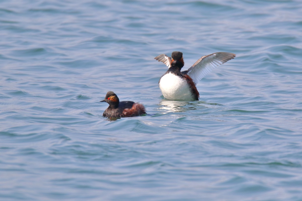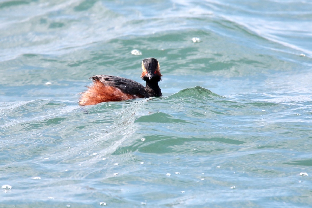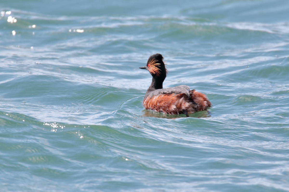 ハジロカイツブリ ( 羽白鳰 ) Podiceps nigricollis Black-necked Grede L=33cm W=56cm ( 名前の由来 ) 飛びたつと羽の内側に白い部分が見え、これが名前の由来になっている。 カイツブリとは その昔 動きを見て・・・掻き頭潜り( かきつぶり )と名付けた。