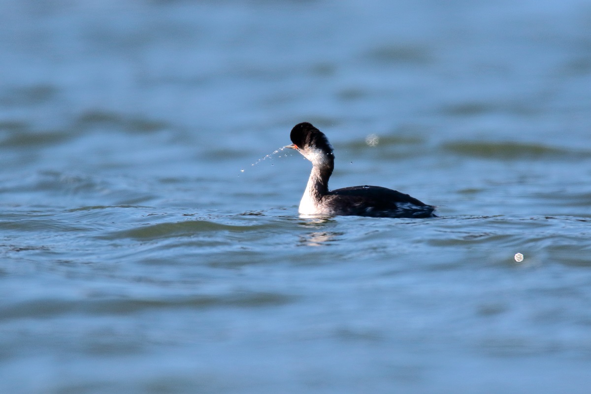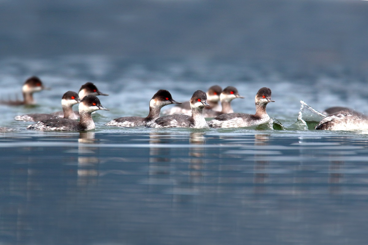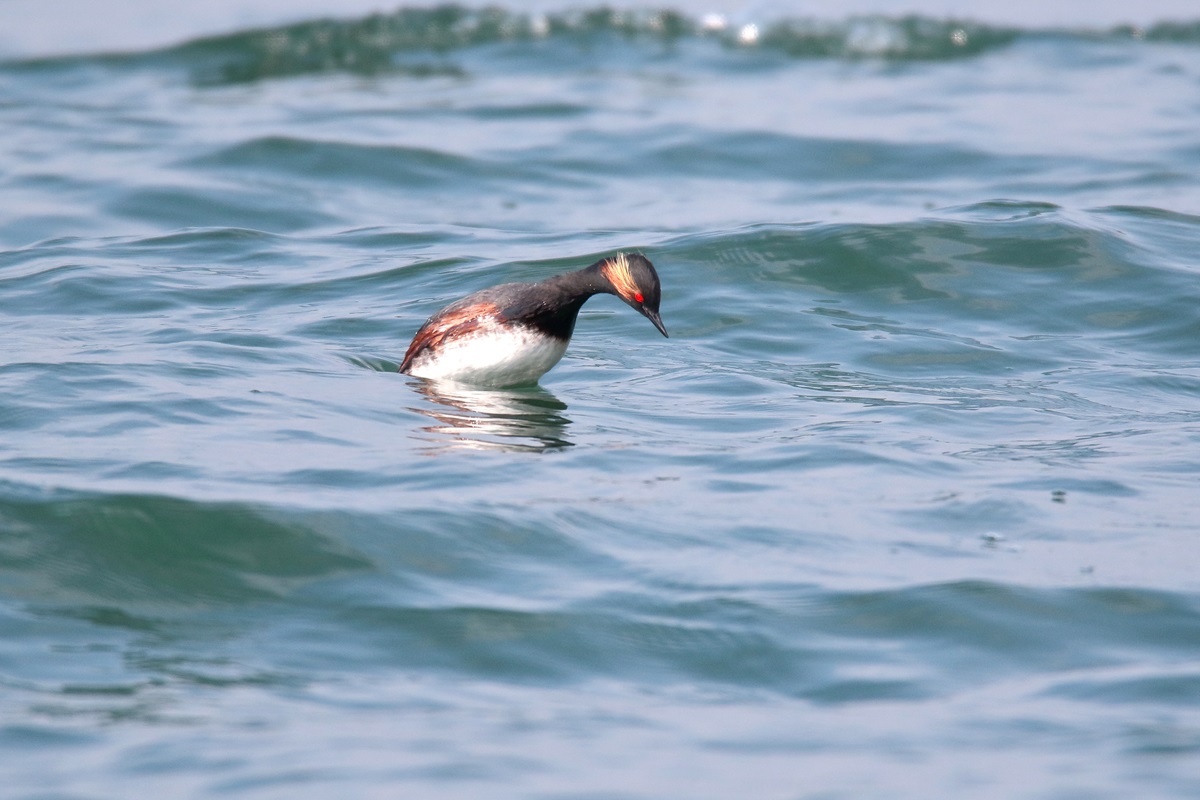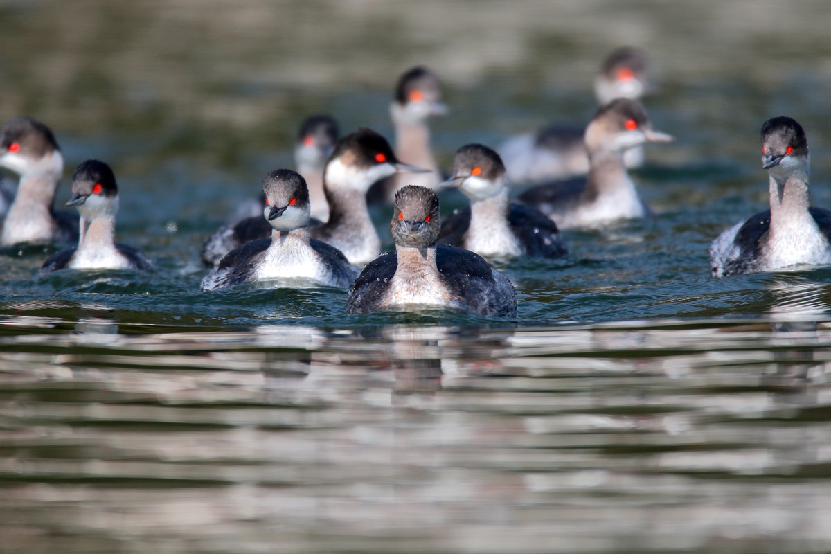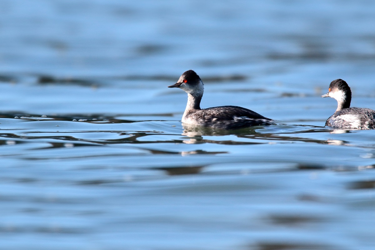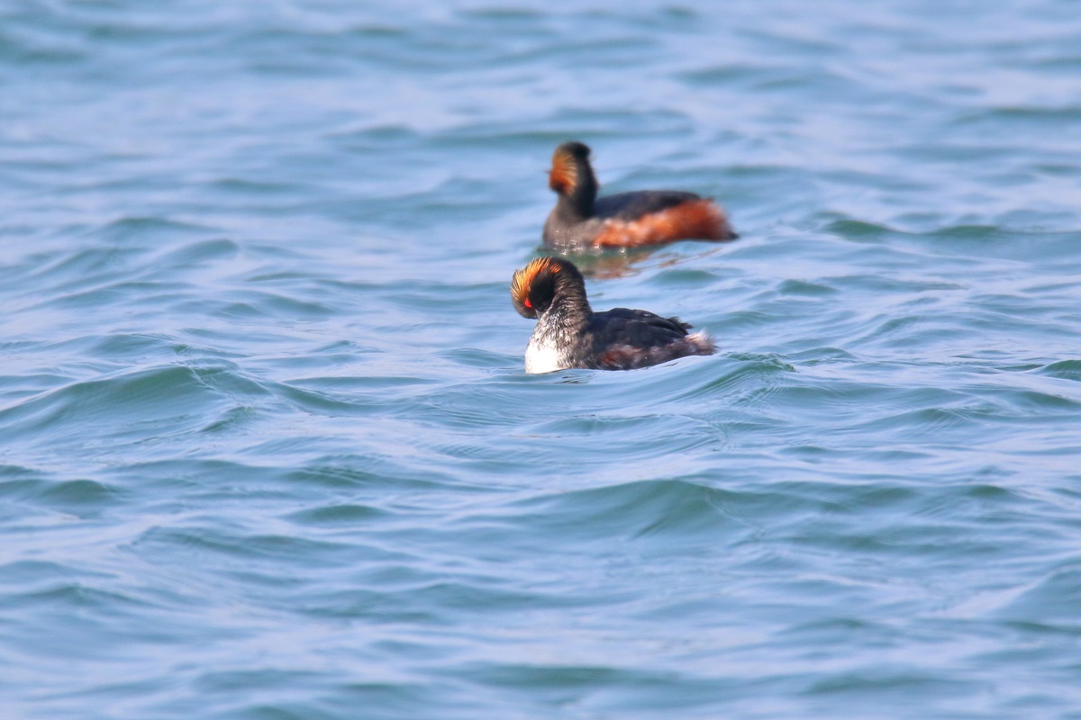 ハジロカイツブリ ( 羽白鳰 ) Podiceps nigricollis Black-necked Grede L=33cm W=56cm ( 名前の由来 ) 飛びたつと羽の内側に白い部分が見え、これが名前の由来になっている。 カイツブリとは その昔 動きを見て・・・掻き頭潜り( かきつぶり )と名付けた。