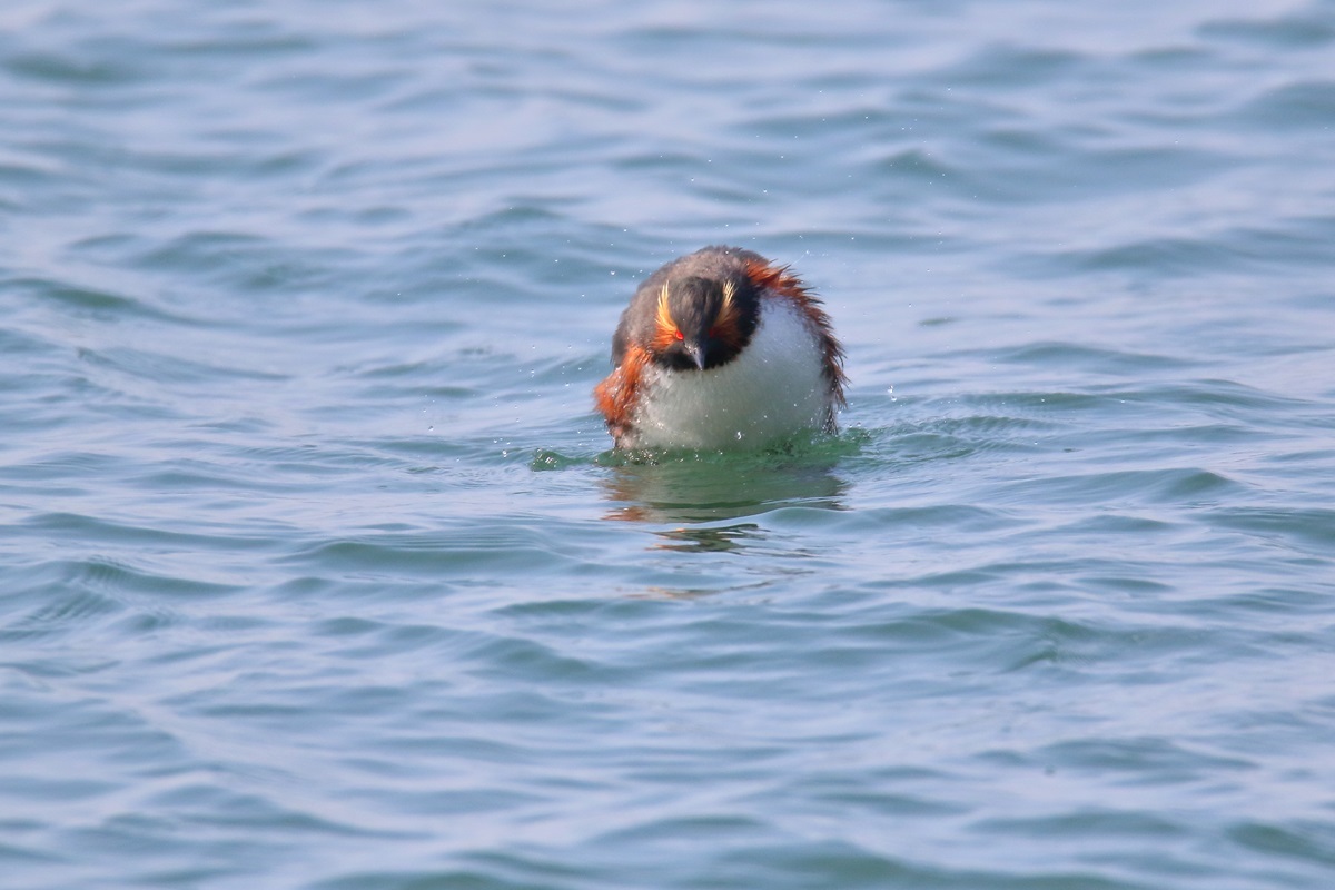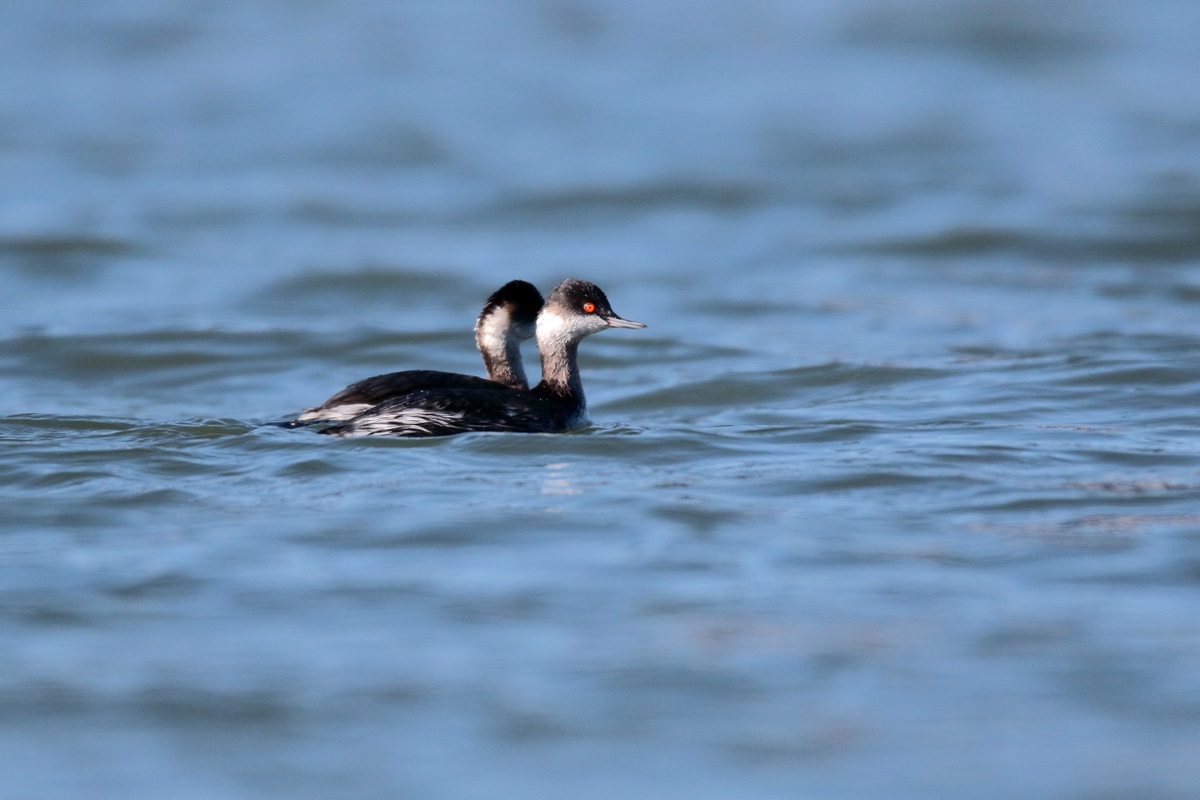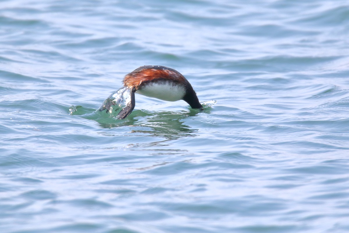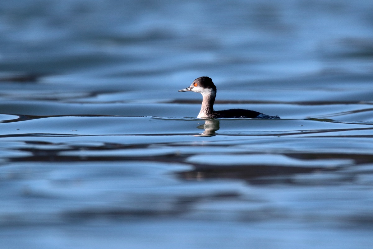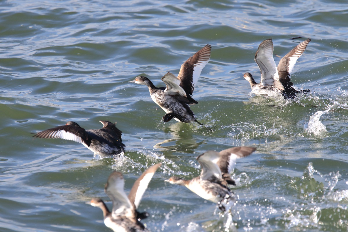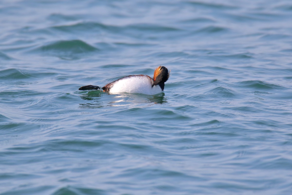 ハジロカイツブリ ( 羽白鳰 ) Podiceps nigricollis Black-necked Grede L=33cm W=56cm ( 名前の由来 ) 飛びたつと羽の内側に白い部分が見え、これが名前の由来になっている。 カイツブリとは その昔 動きを見て・・・掻き頭潜り( かきつぶり )と名付けた。