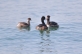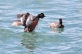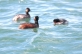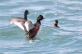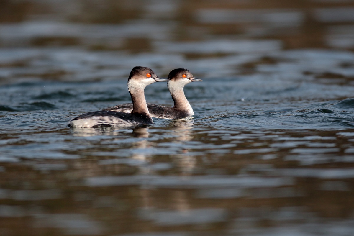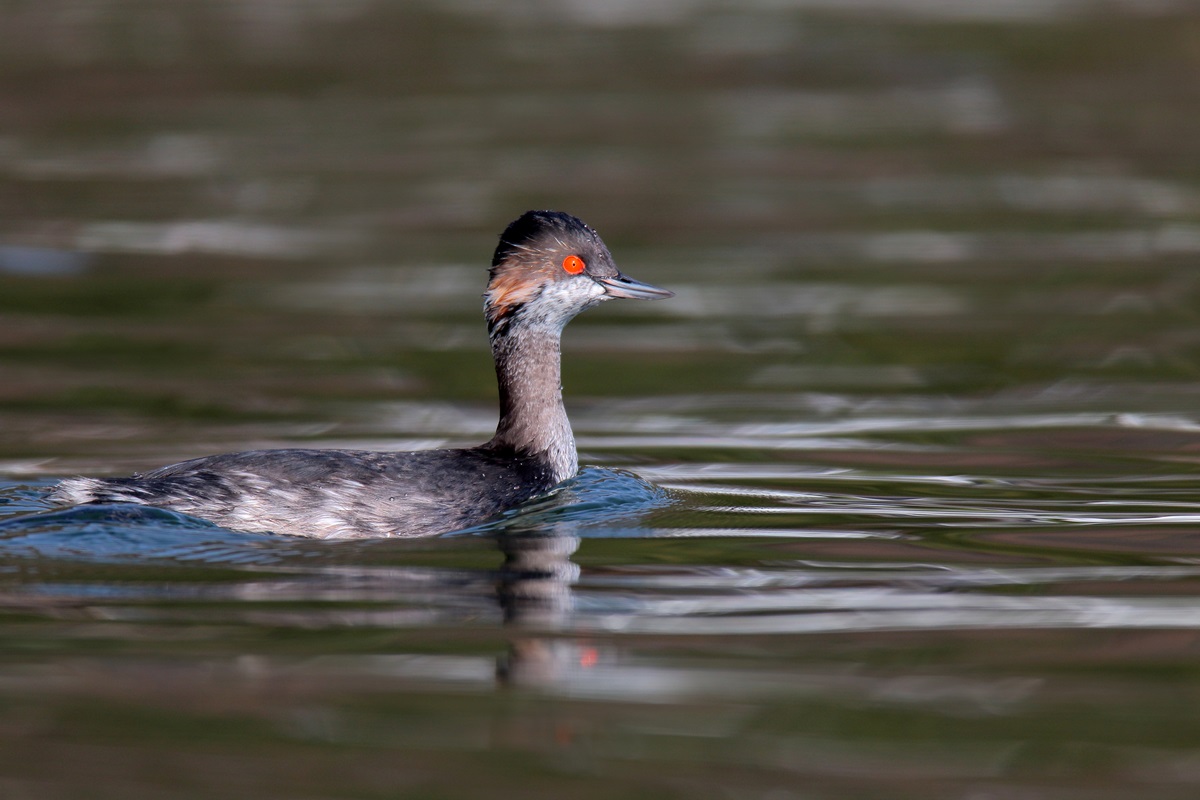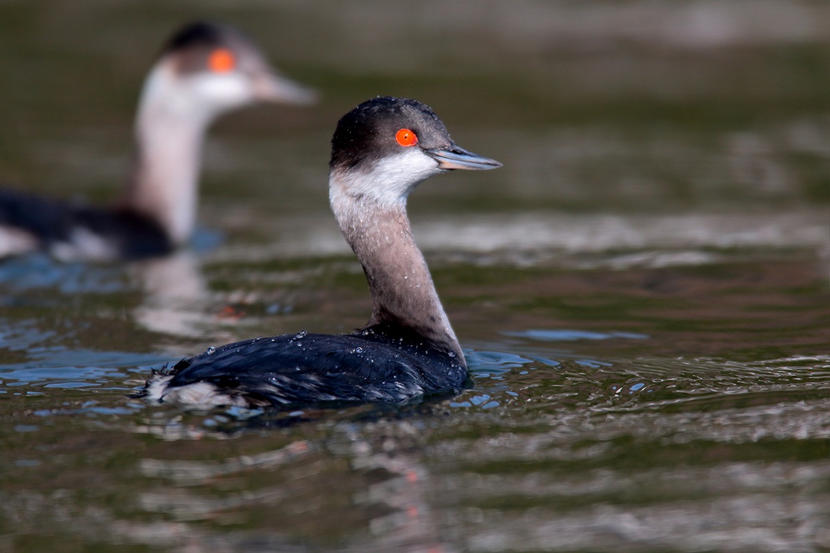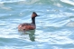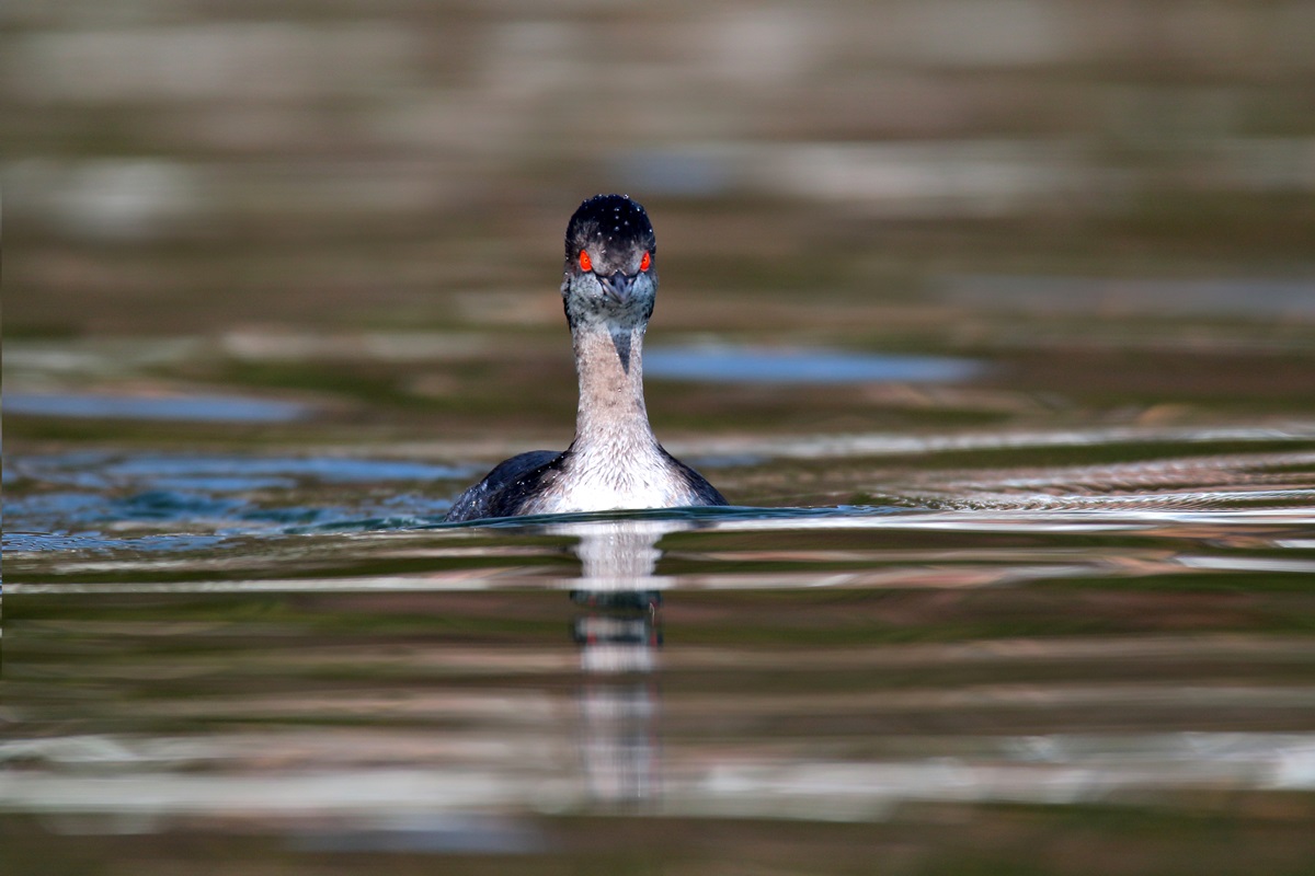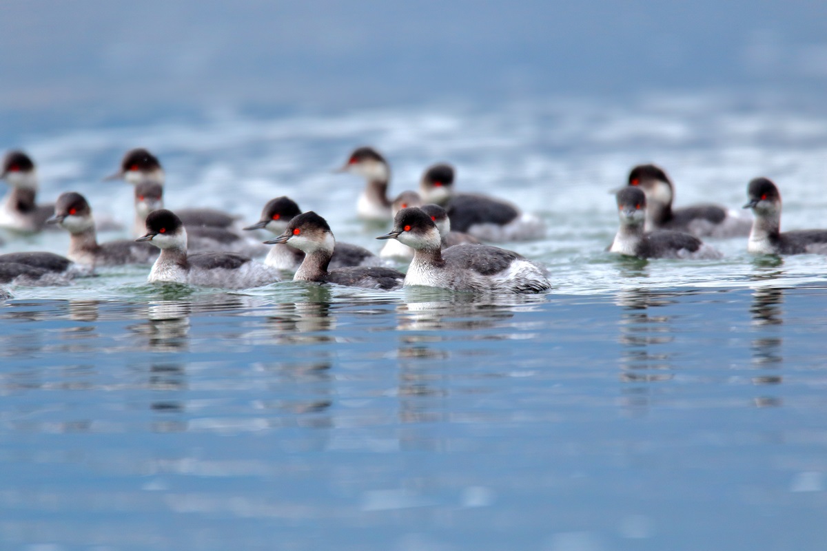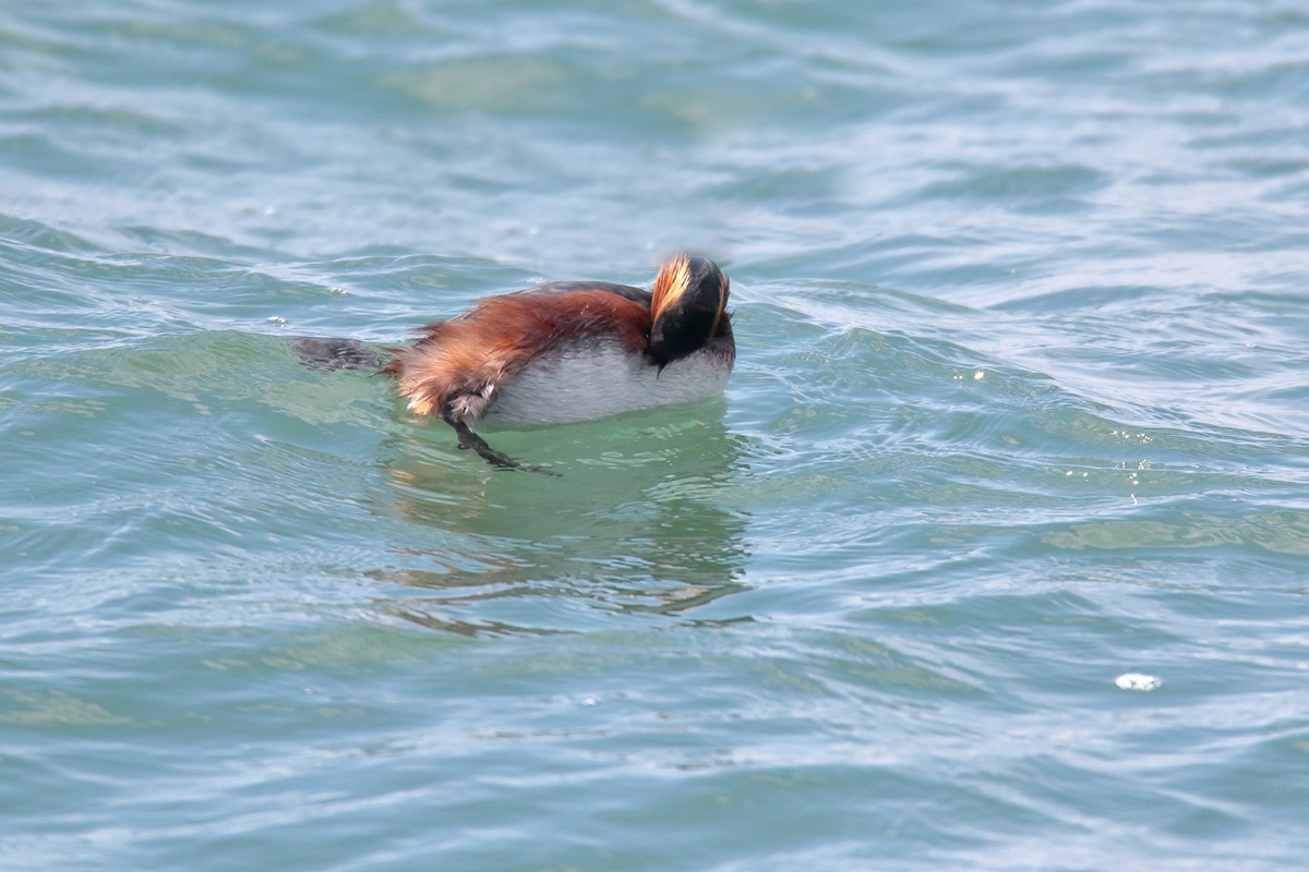 ハジロカイツブリ ( 羽白鳰 ) Podiceps nigricollis Black-necked Grede L=33cm W=56cm ( 名前の由来 ) 飛びたつと羽の内側に白い部分が見え、これが名前の由来になっている。 カイツブリとは その昔 動きを見て・・・掻き頭潜り( かきつぶり )と名付けた。