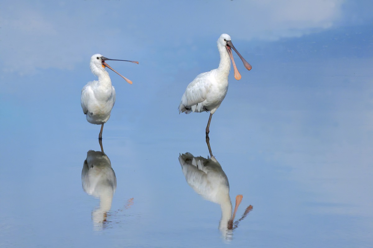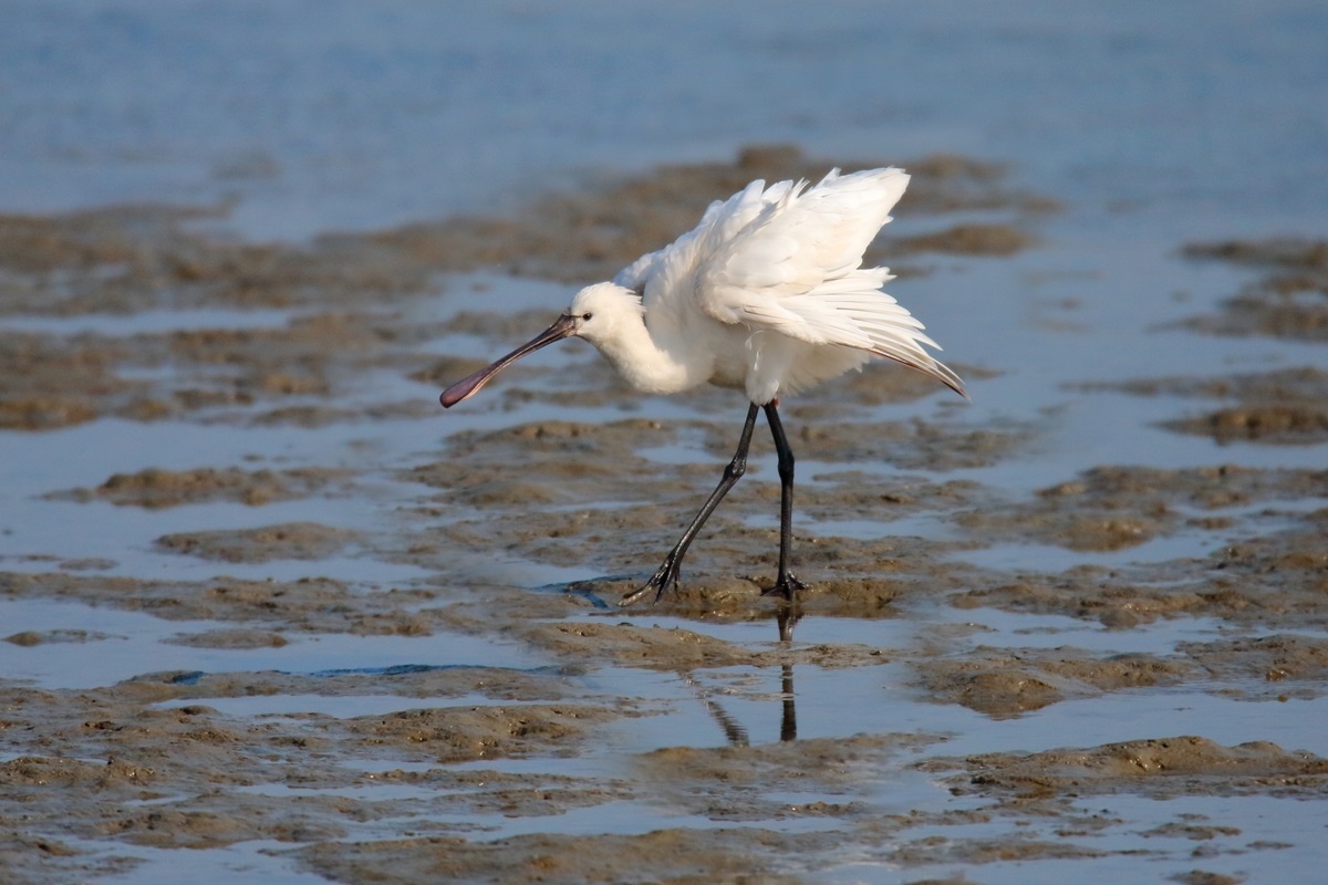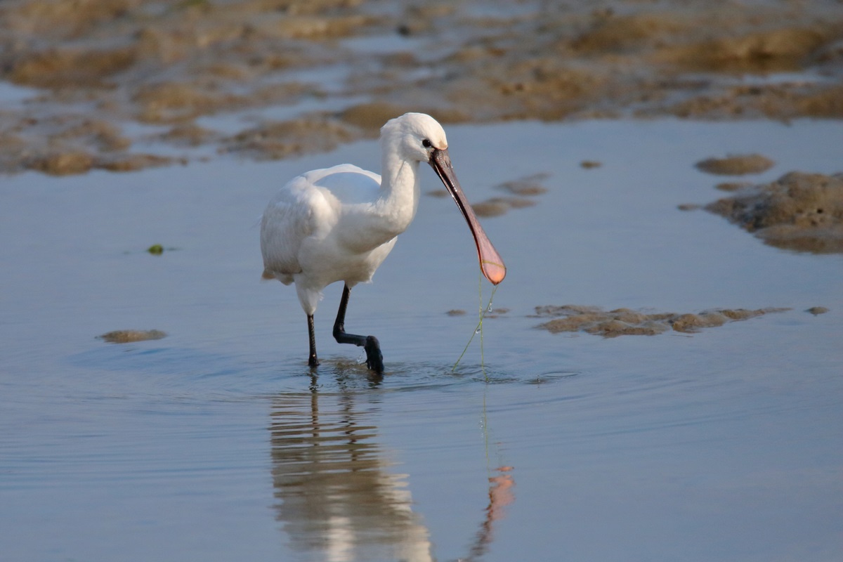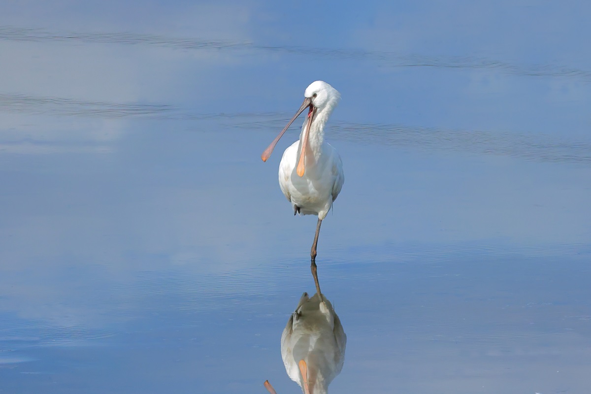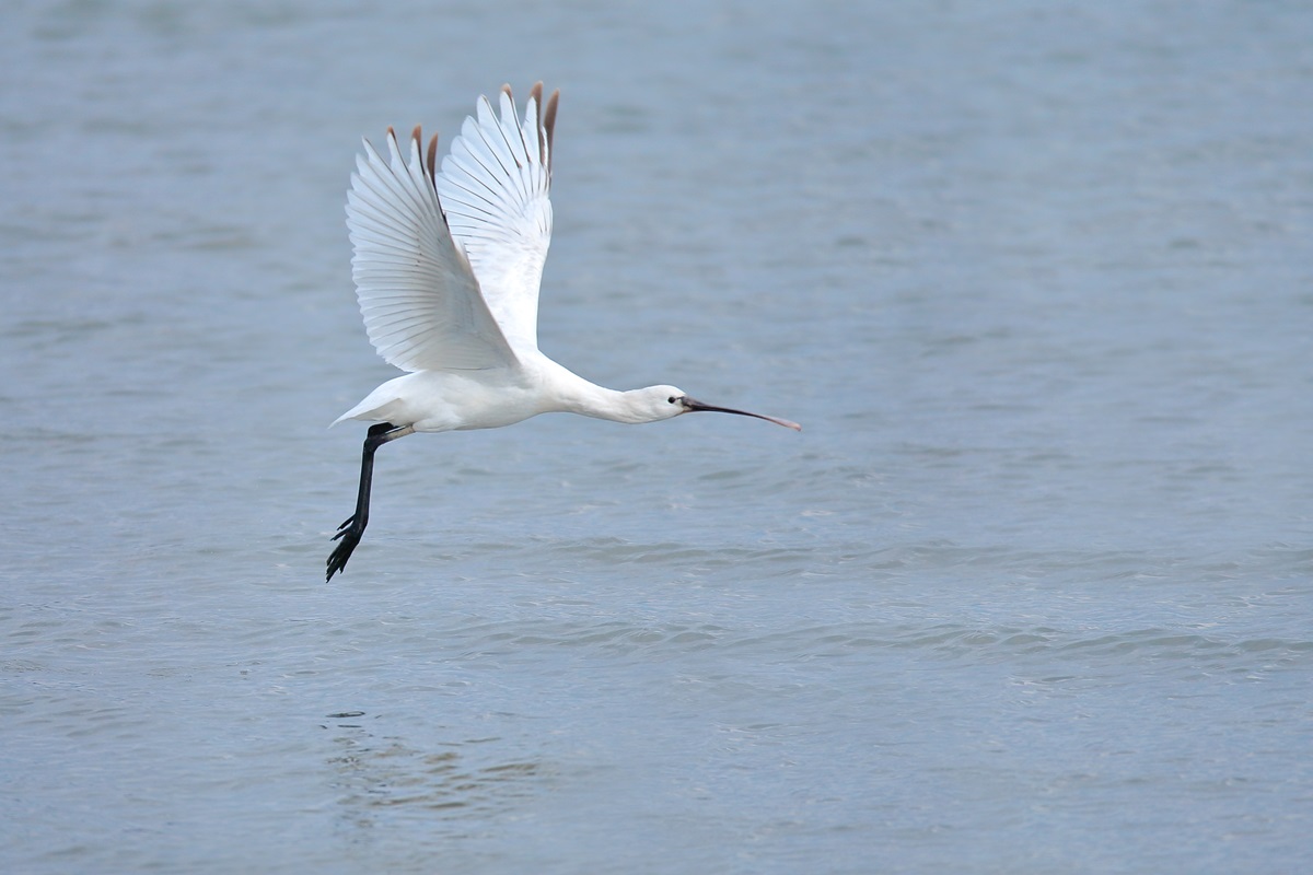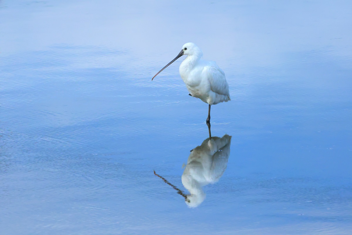 ヘラサギ ( 箆 鷺 ) Platalea leucorodia Spoonbill L=86cm W=123cm ( 名前の由来 ) 名の通りヘラ状の嘴のため、 異名として " 漫画 " かうかいさぎ " どろさぎ " えびすくひ " 等々、 漢名の " 漫画 " ( マンカク )は 、みだりに水を掻き回して、 魚を求めるから名付けたのでであろう。