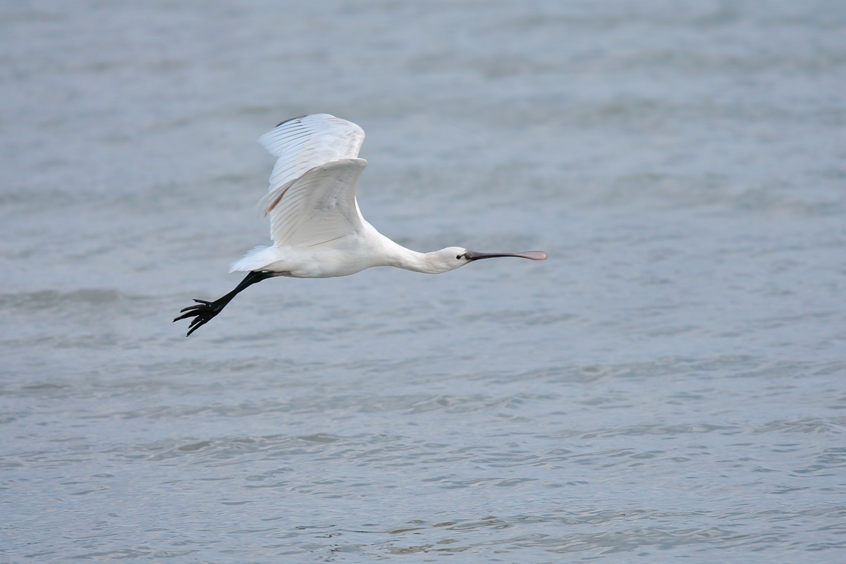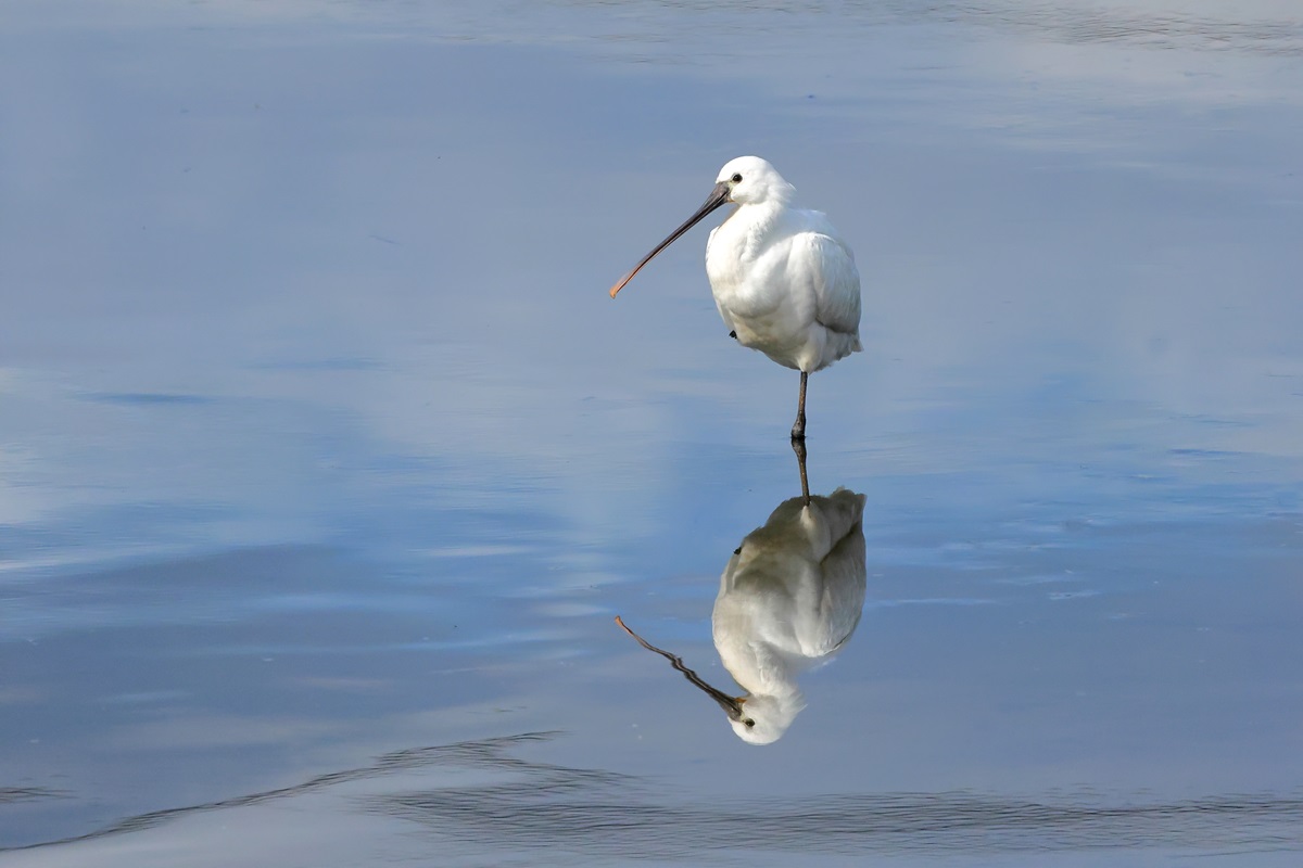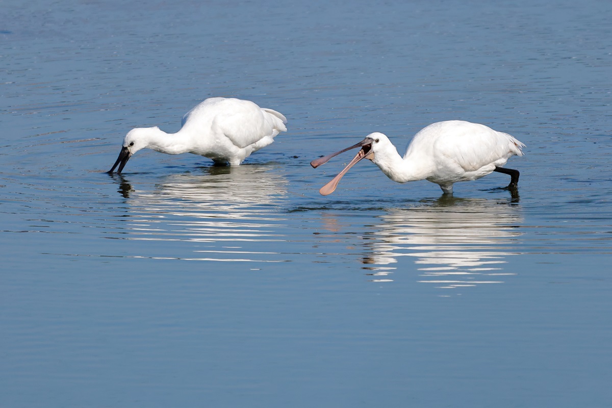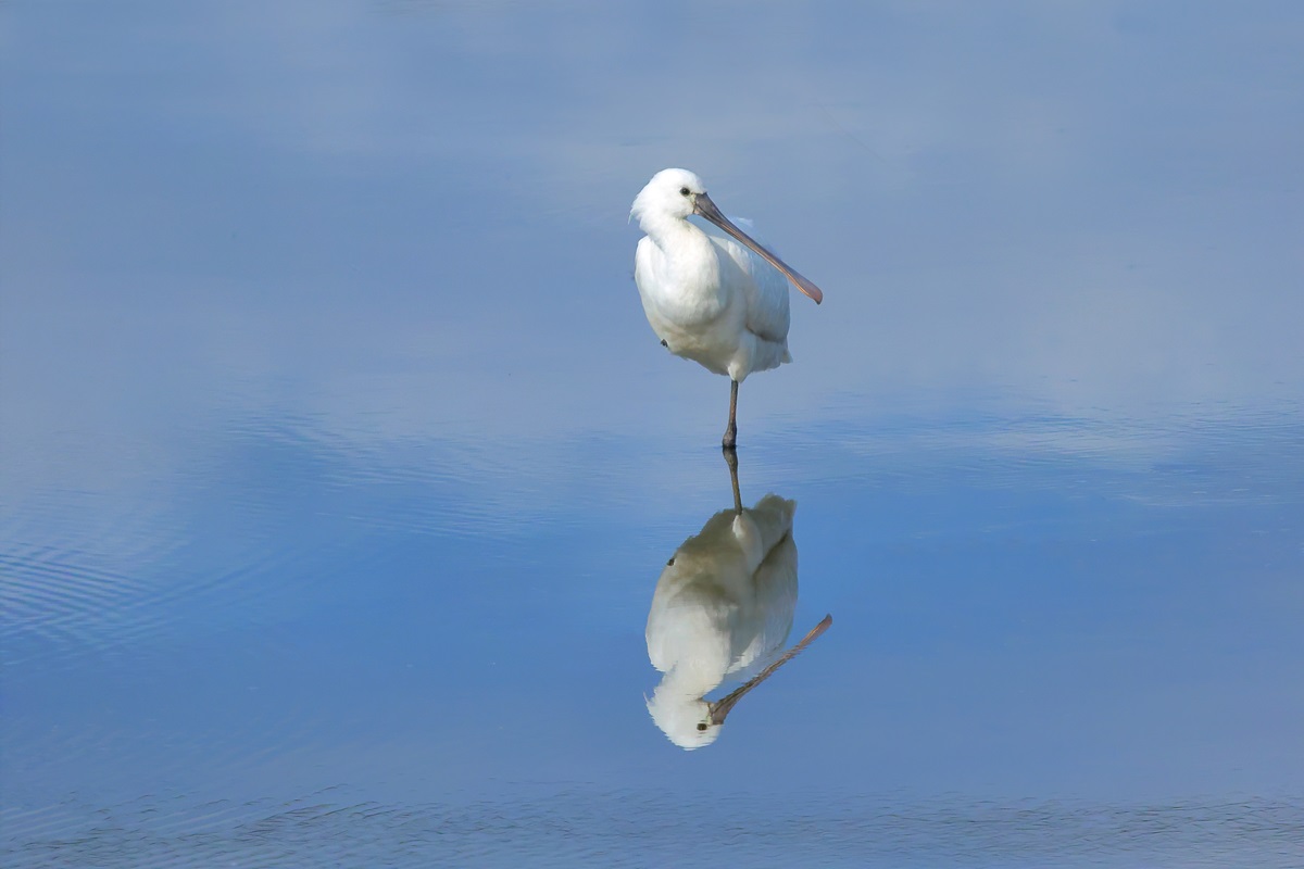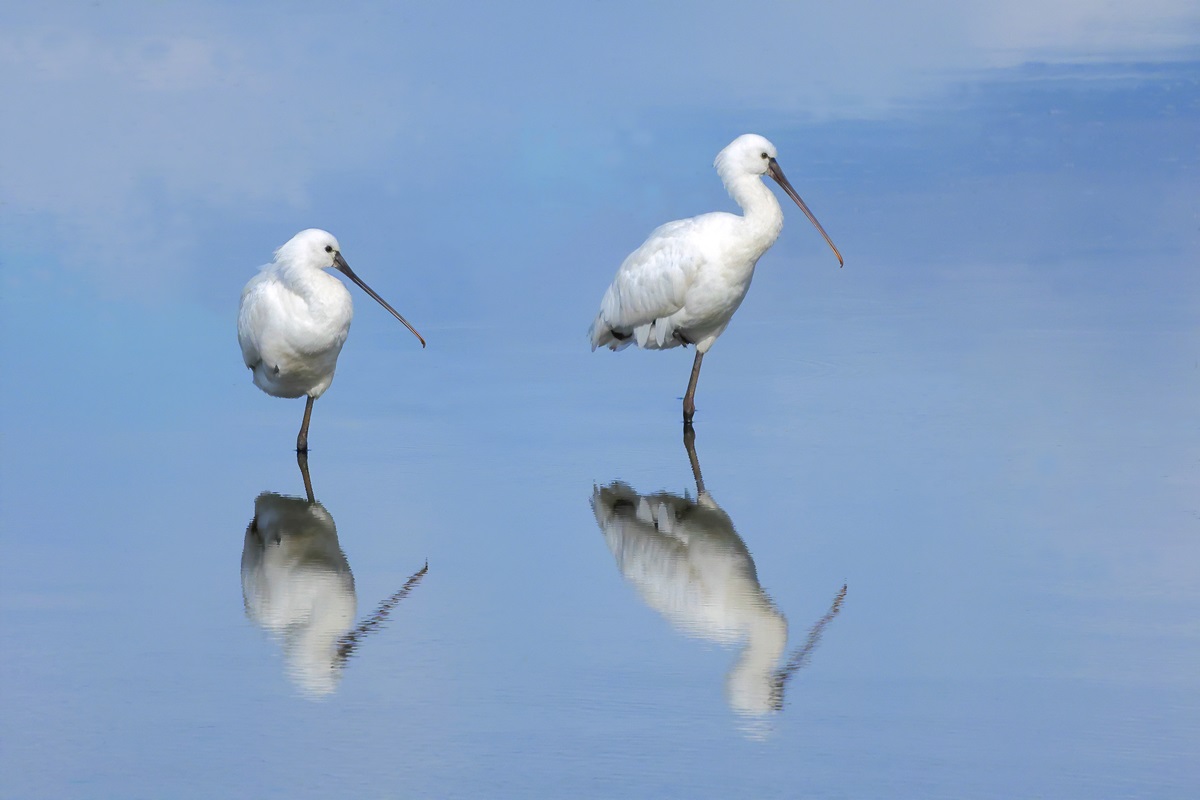 ヘラサギ ( 箆 鷺 ) Platalea leucorodia Spoonbill L=86cm W=123cm ( 名前の由来 ) 名の通りヘラ状の嘴のため、 異名として " 漫画 " かうかいさぎ " どろさぎ " えびすくひ " 等々、 漢名の " 漫画 " ( マンカク )は 、みだりに水を掻き回して、 魚を求めるから名付けたのでであろう。