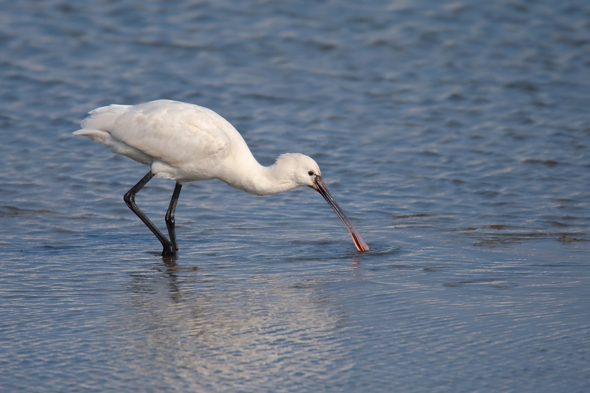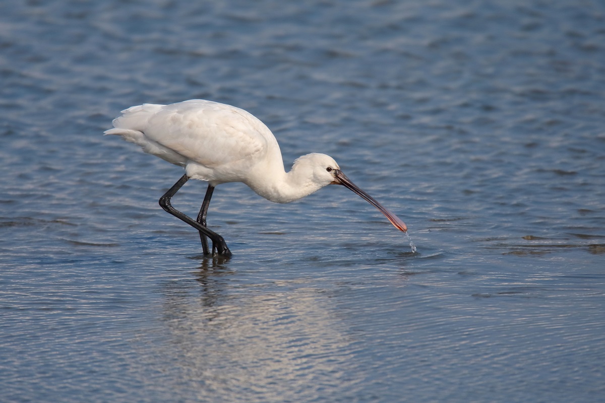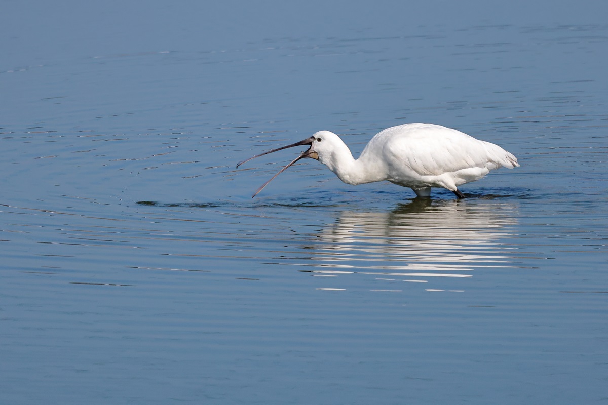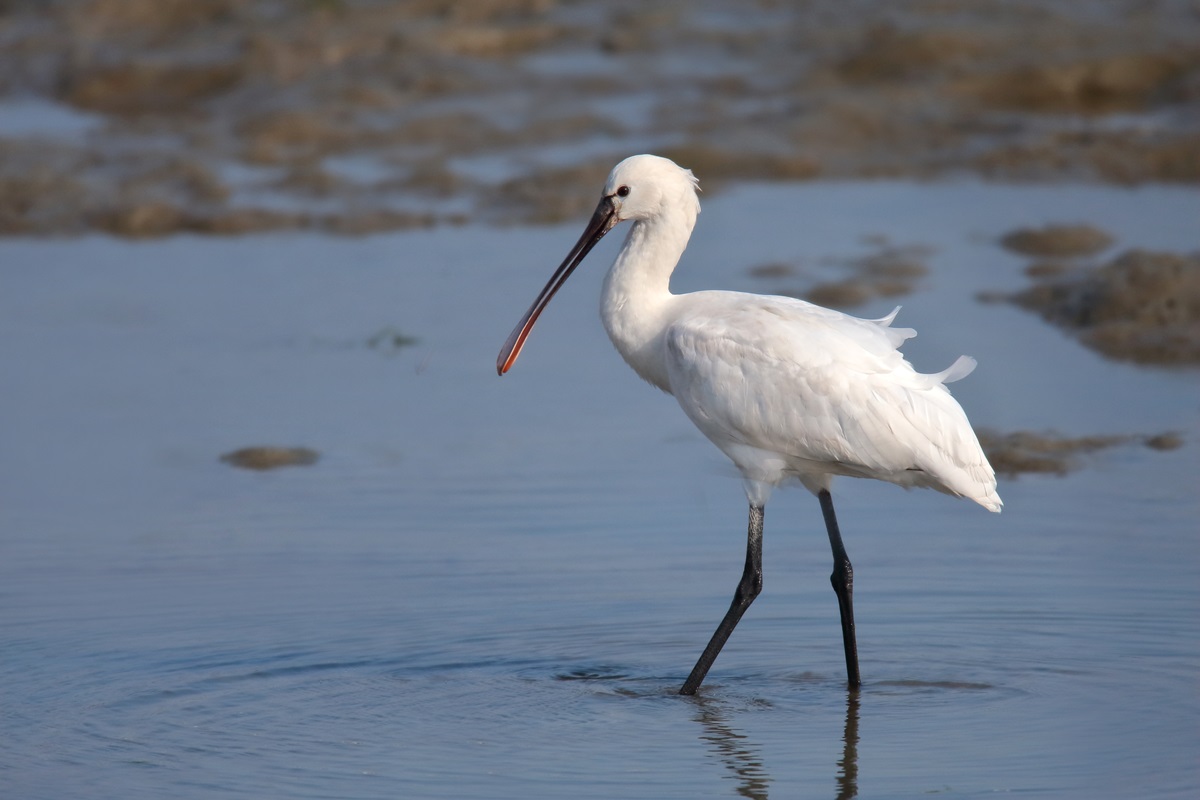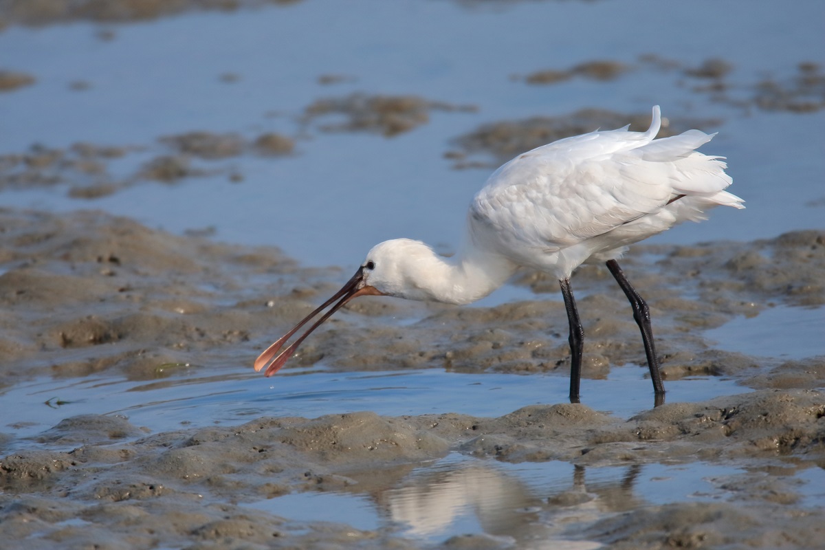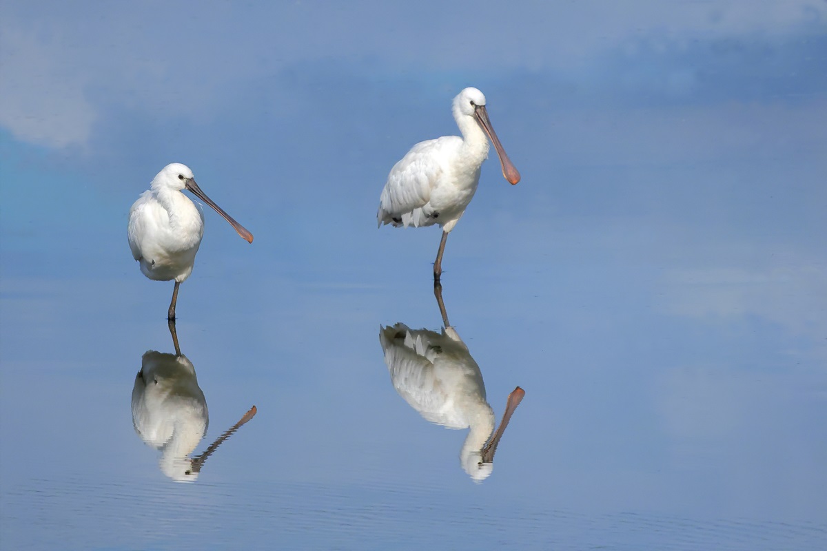 ヘラサギ ( 箆 鷺 ) Platalea leucorodia Spoonbill L=86cm W=123cm ( 名前の由来 ) 名の通りヘラ状の嘴のため、 異名として " 漫画 " かうかいさぎ " どろさぎ " えびすくひ " 等々、 漢名の " 漫画 " ( マンカク )は 、みだりに水を掻き回して、 魚を求めるから名付けたのでであろう。