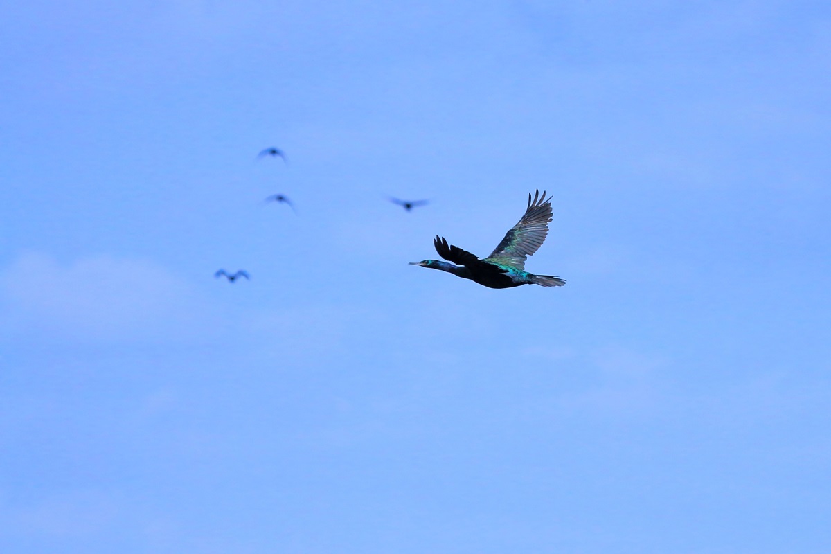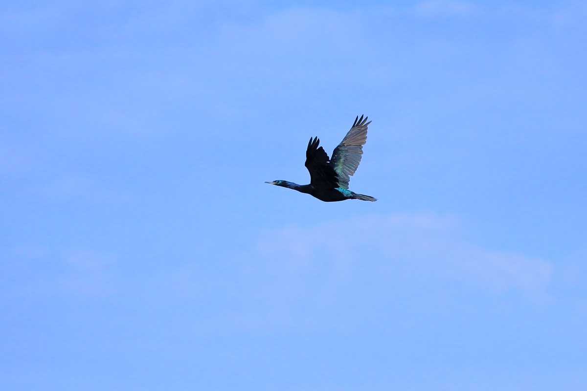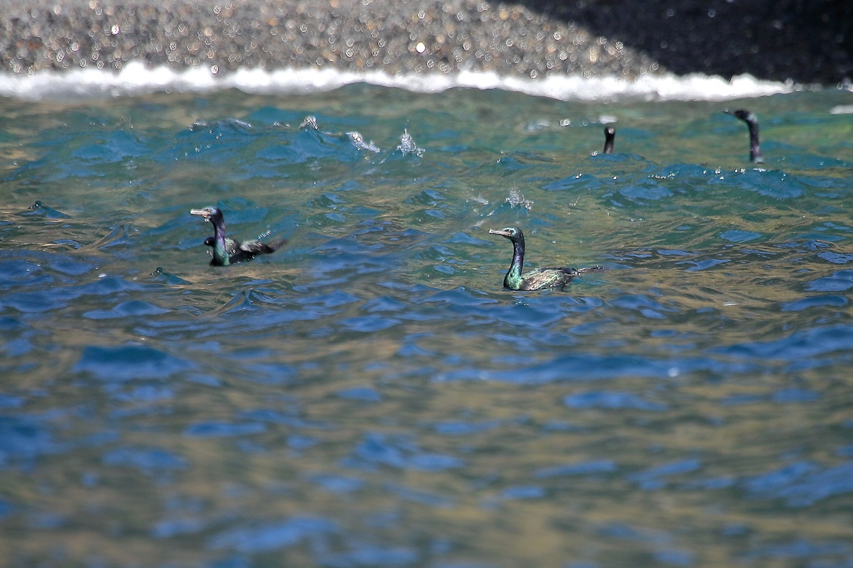 ヒメウ ( 姫 鵜 ) Phalacrocorax Pelagic Cormorant 、 Pelagic Shag L=72cm W=98cm ( 名前の由来 ) 鵜の類では最も小さく可愛いので姫と名付く ブレブレ画像で恐縮 ( なにしろ大揺れの小舟に乗っての撮影なもんで )