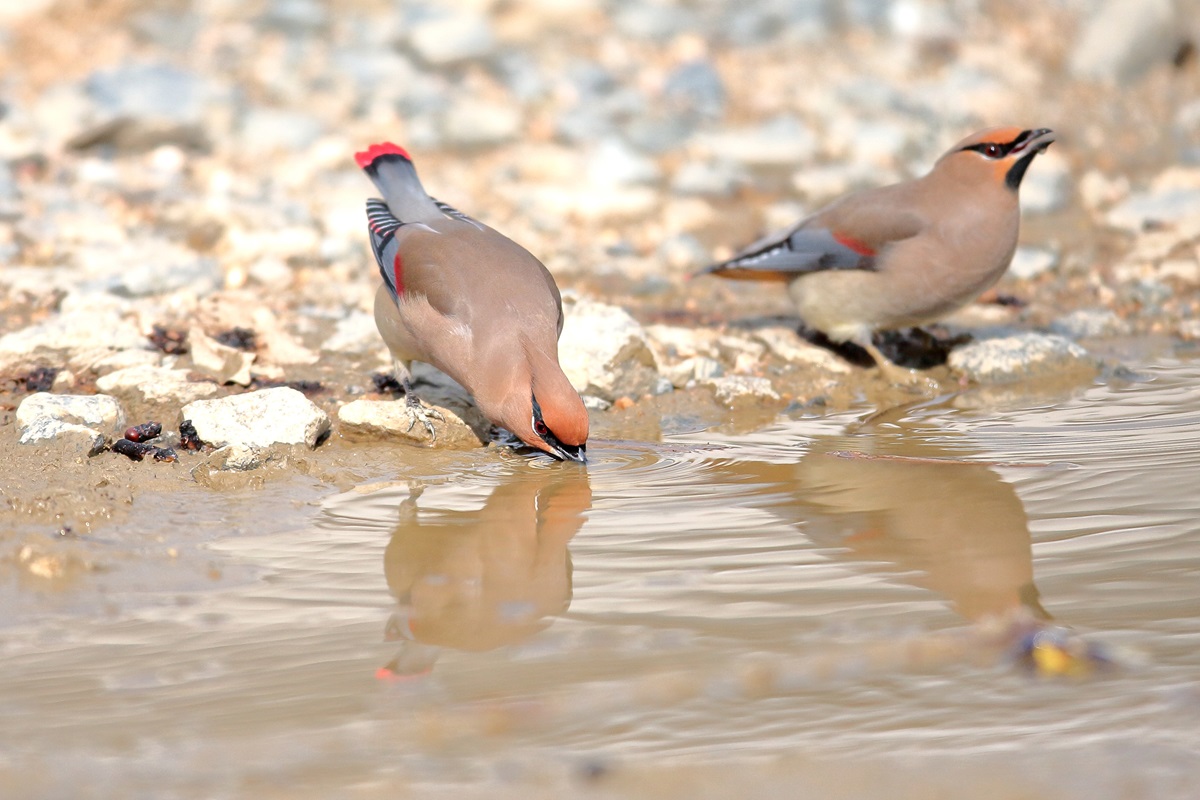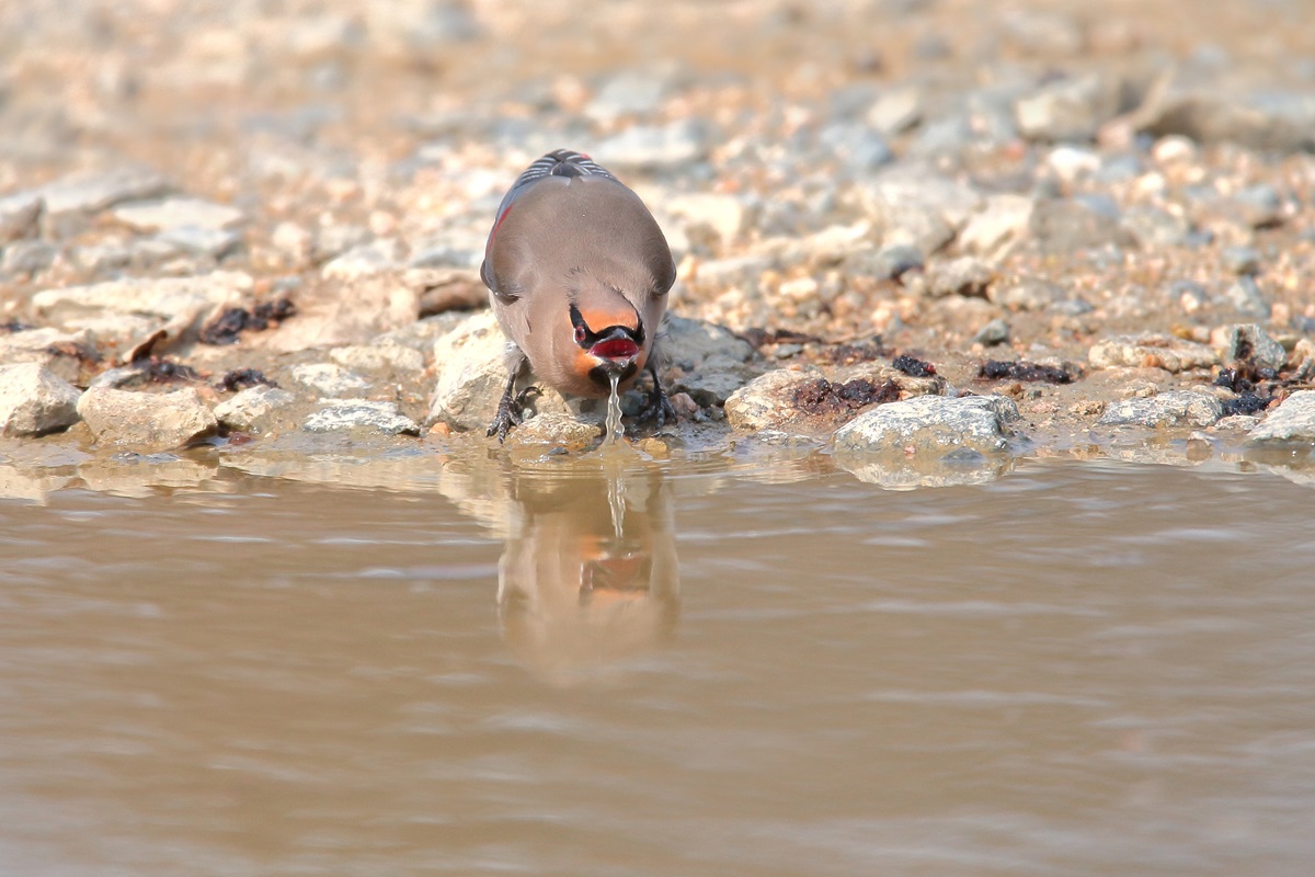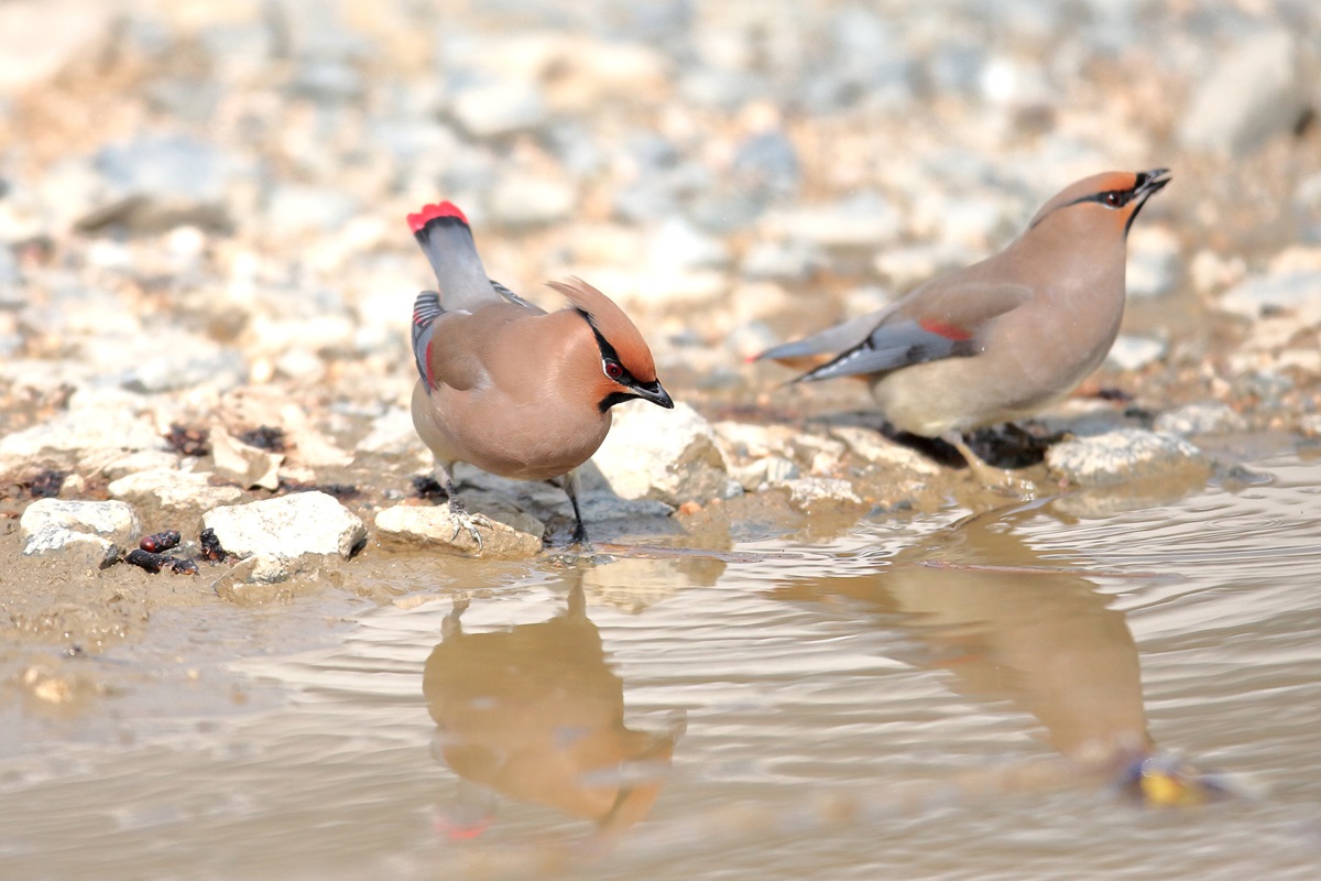 ヒレンジャク ( 緋連雀 ) Bombycilla garrulus Bohemian Waxwing L=17cm W=29cm ( 名前の由来 ) 尾羽の先端と初列風切外弁の先端が赤色のためであり、 スズメのように群れをなしているから連雀。 平安時代には " からすずみ " の名で知られている、 漢名の十二紅の由来では十二枚の尾羽の先端が紅色だからである。