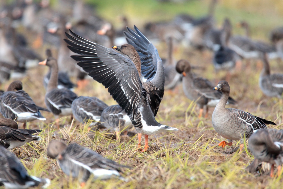 ヒシクイ ( 菱 喰 ) Anser fabalis Bean Goose L=83cm W=160cm ( 名前の由来 ) 特に菱の実を好んで食べるから 菱の実だけを食べるわけではない 稲の落穂や雑草類の種子なども食べる 平安時代から鎌倉時代には 「宇加利」(うかり)・「沼太郎」(ぬまたろう)・・・とか 「まひしくひ」・「まひし」・「やちひくし」などと呼ばれていた 。