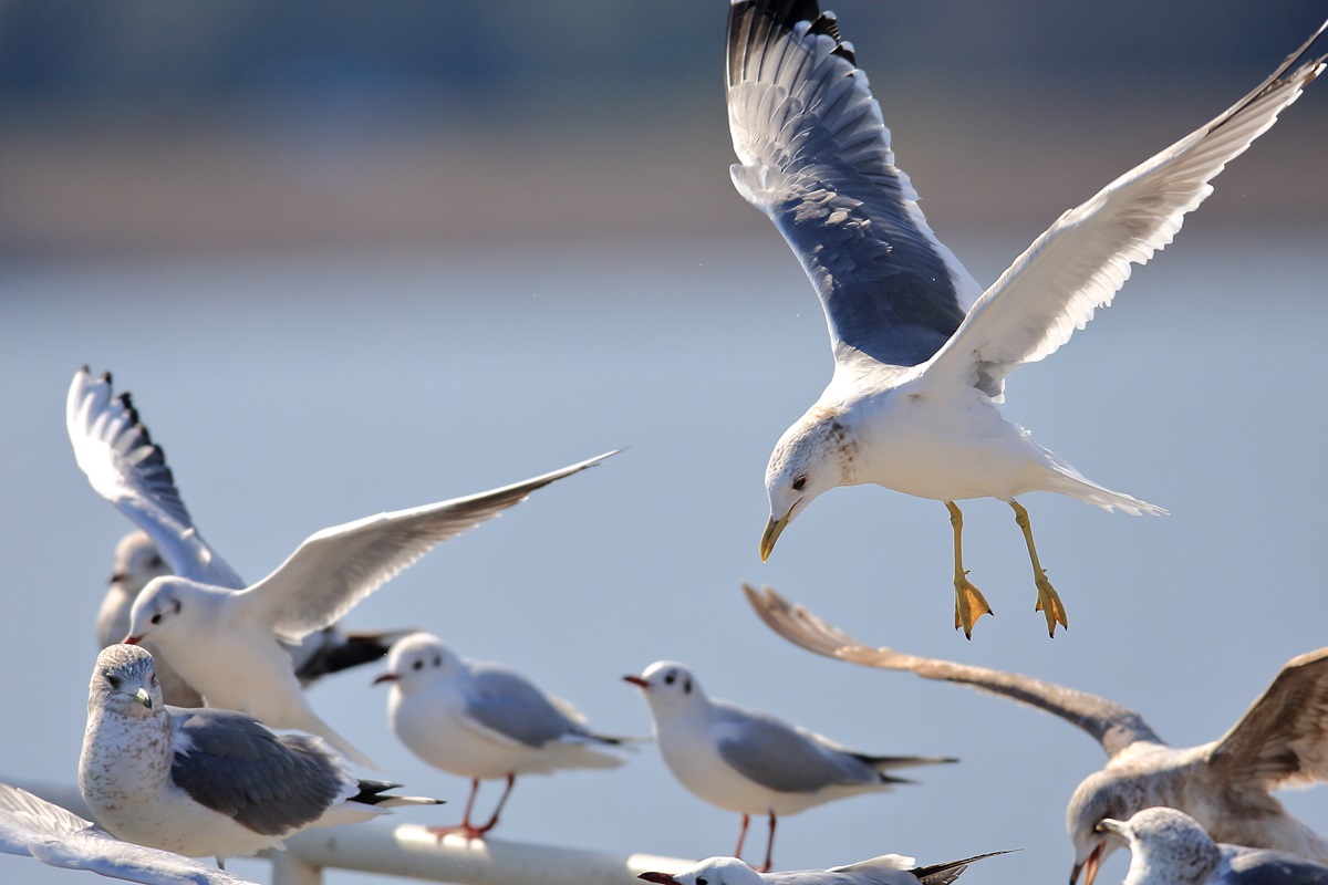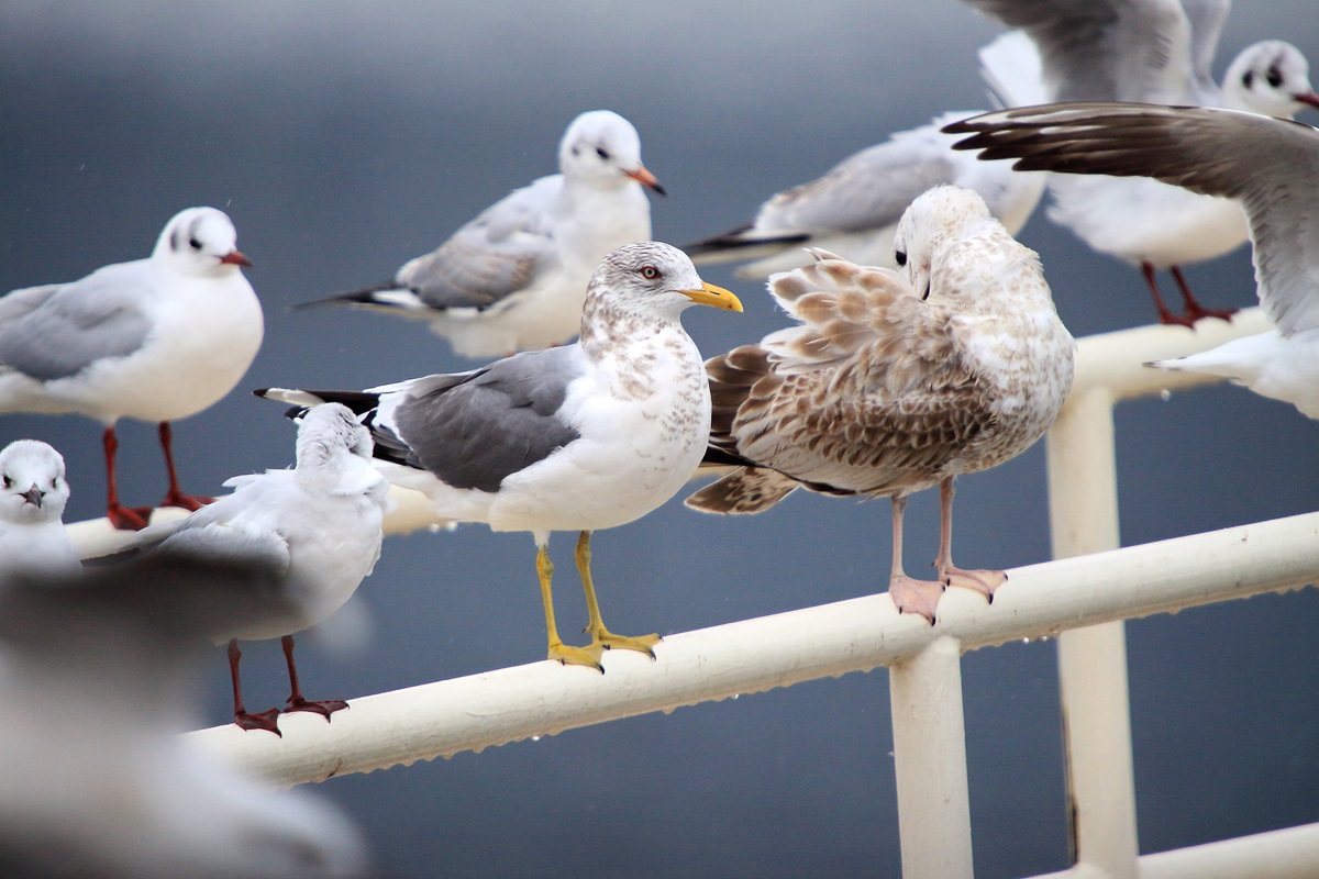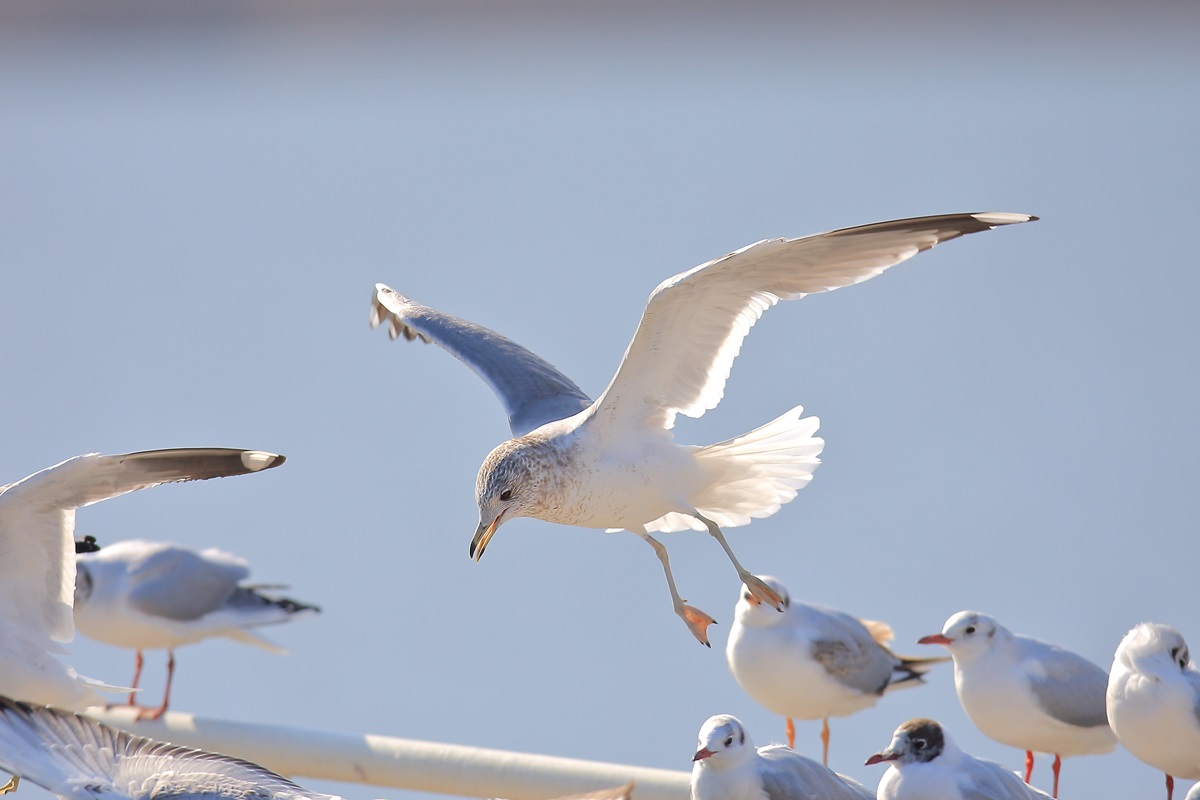 カモメ ( 鴎 ) Larus canus Common Gull , Mew Gull L=45cm W=115cm ( 名前の由来 ) 新井白石は”かも”に似て小さいので”かもめ”(鴨妻)とし、 大言海は”かも”に似て群れているから”かもめ”(鴨群)としている。 このような説もある、 幼鳥の羽衣が「籠の目」模様なのが語源、 喧しく(カマ)群れ(メ)で鳴くのが語源とも、 奈良時代に”かまめ”または”かもめ”の名で、 平安時代からは”かもめ”の名で知られている。
