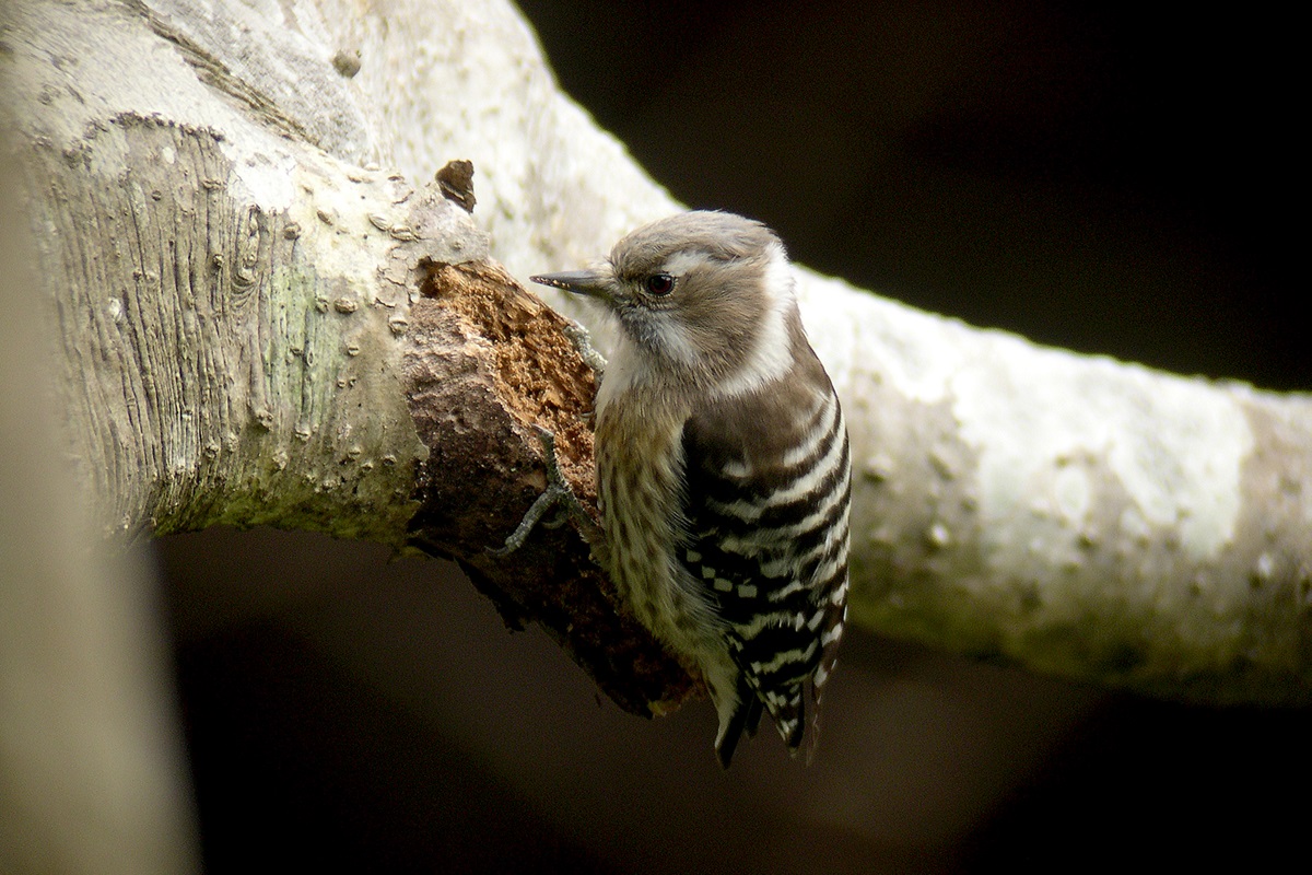 コゲラ ( 小啄木鳥 ) Dendrocopos kizuki Japanese Pygmy Woodpecker L=15cm W=27cm ( 名前の由来 ) 小型の " けら " の意で " けら " はキツツキの古名である。 江戸時代にオランダ人の医師シ−ボルトが 持ち帰った標本を基に命名されている。 種小名 Kizuki はキツツキをキズキと聴き取ったのだろう。 国内最小のキツツキでもある。