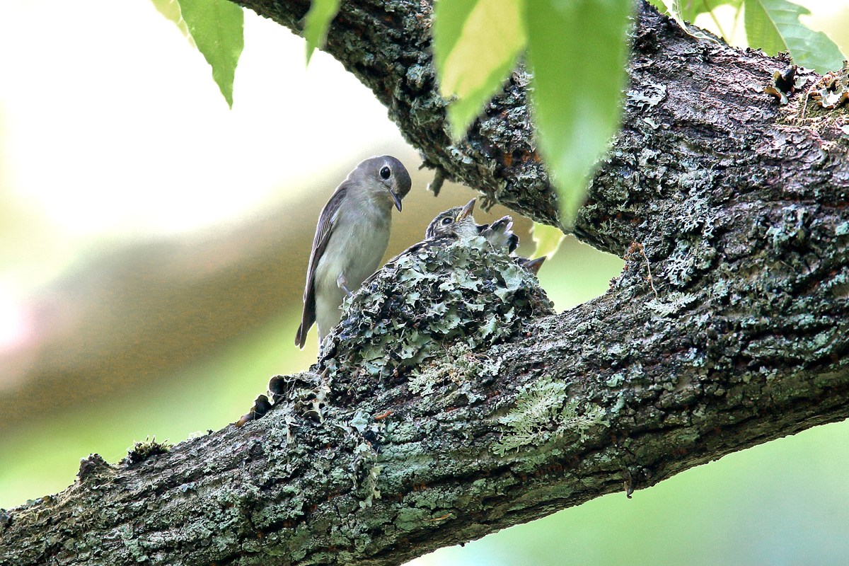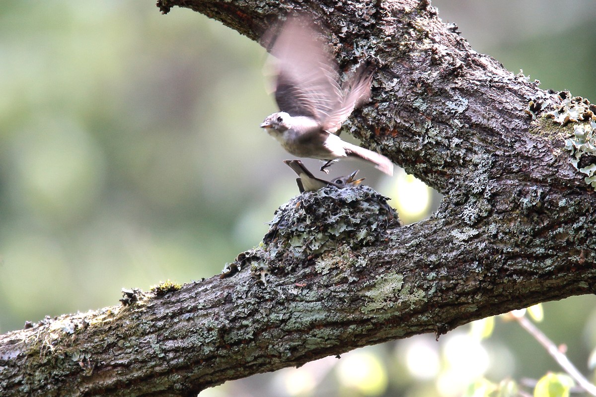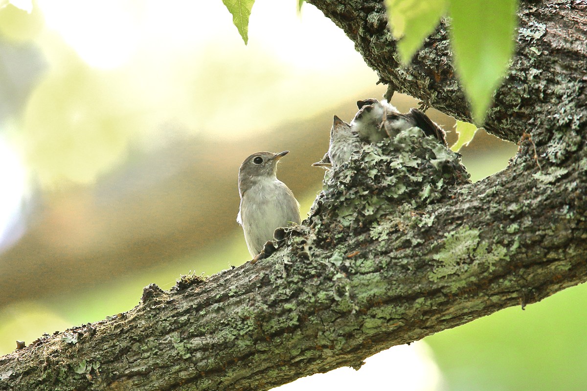 コサメビタキ ( 小鮫鶲 ) Muscicapa latirostris Brown Flycatcher L=13cm W=21cm ( 名前の由来 ) サメビタキより小さく羽色が灰褐色で鮫皮の色に似ているから。 飛行中の小昆虫を捕らえ枝に戻る行動から、 " こあがり " ( 小揚がり )の異名がある。