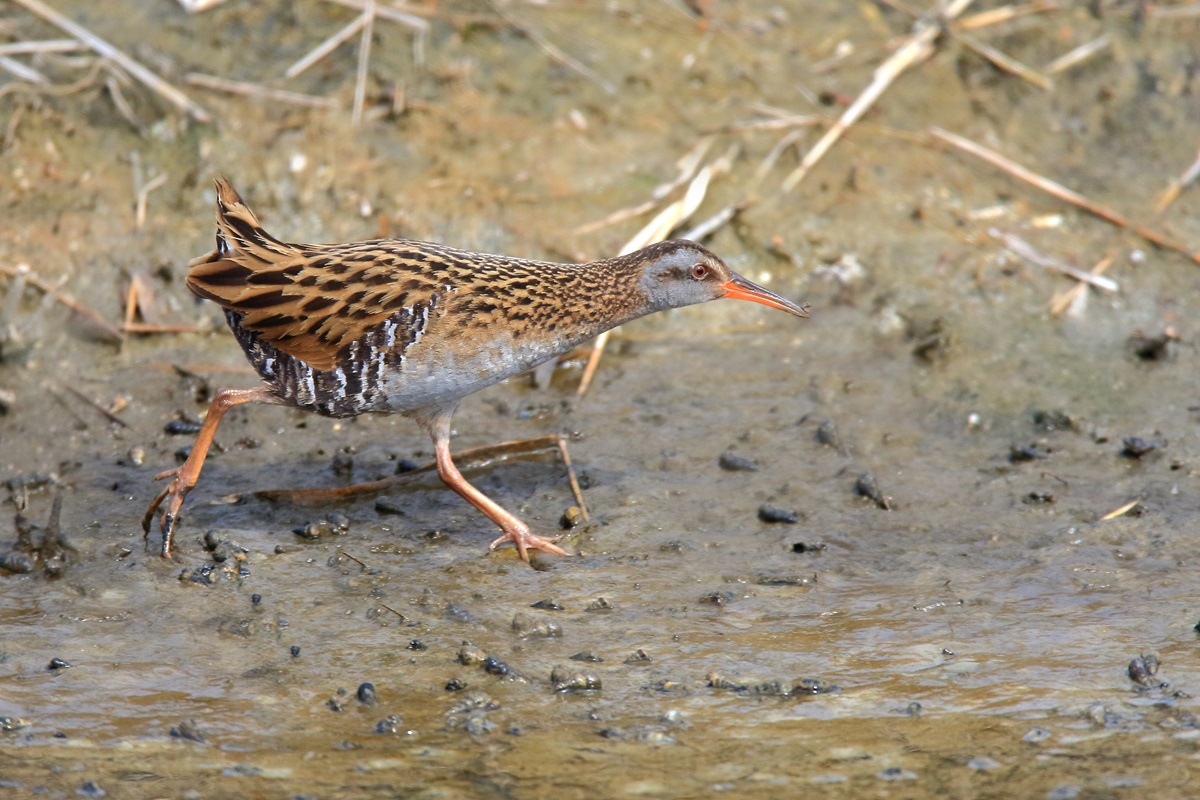 クイナ ( 秧 鶏 ・ 水鶏 ) Rallus aquaticus Water Rail L=29cm W=39cm ( 名前の由来 ) 貝原益軒・新井白石は 「 くい 」 は来て 「 な 」 は鳴くで " くひな " は 「 来鳴く 」 としている 北海道と東北の一部では夏鳥・本州の中部以南では冬鳥で そのため " ふゆくひな " とも呼ばれる こんな説も ノックをするような調子の鳴き声を「くひ、くひ」と聴き それに「鳴く」の語根「な」が加わって「くいな」。