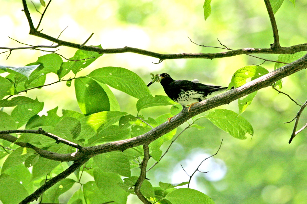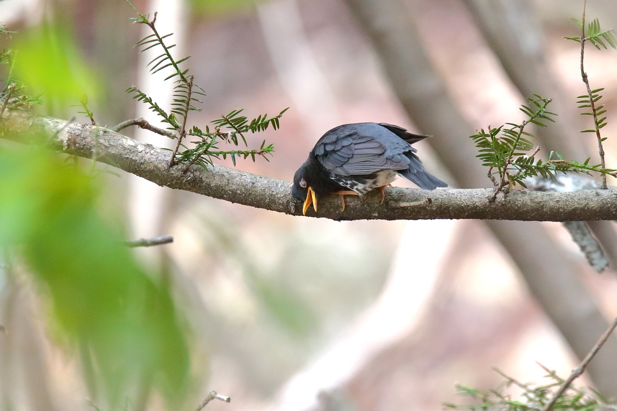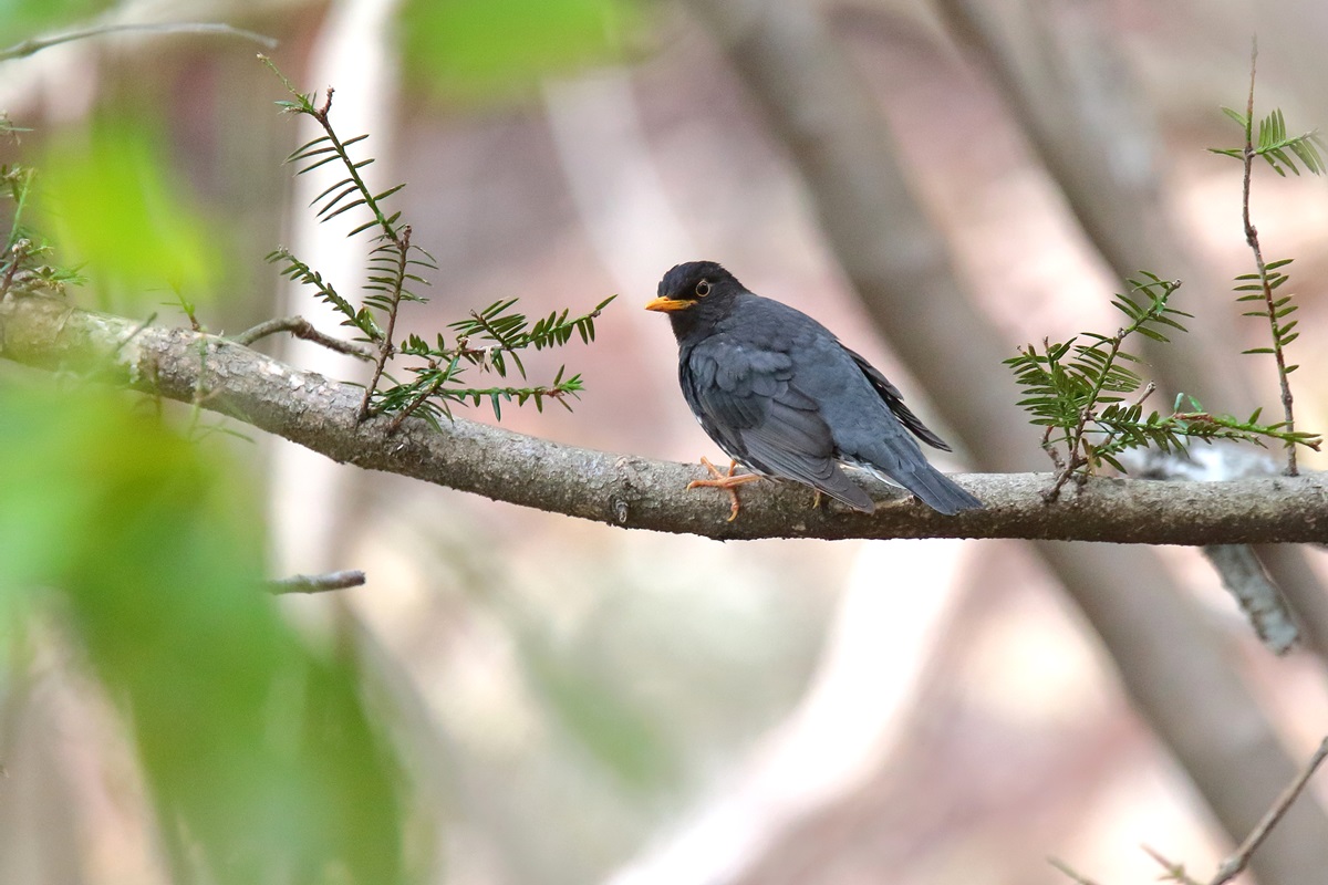 クロツグミ ( 黒 鶫 ) Turdus cardis Grey Thrush L=22cm W=34cm ( 名前の由来 ) 全身が黒く、腹側は白地に黒の斑点が目立つため、 江戸時代初期の 「 大和本草 」 に、 「 黒つぐみ、嘴脚黄也。よく囀る 他鳥の真似をする うぐひす雀などの音をもまなぶ 」と。