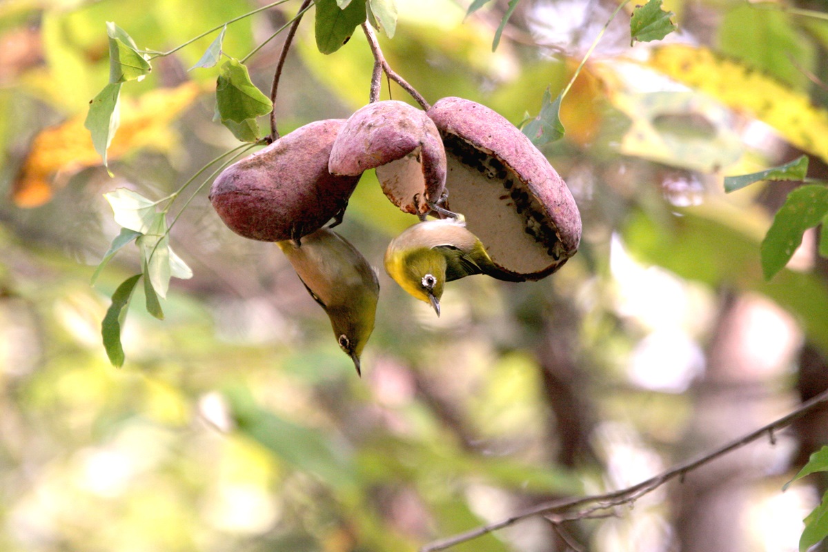 メジロ ( 目 白 ) Zosterops japonica Japanese White-eye L=12cm W=18cm ( 名前の由来 ) 目の周りに白いリング模様があるから。 白色部分は刺繍をしたような質感なので 「 繍眼児 」 とも、 方言では " はなひす " おかまのとり " 等々。