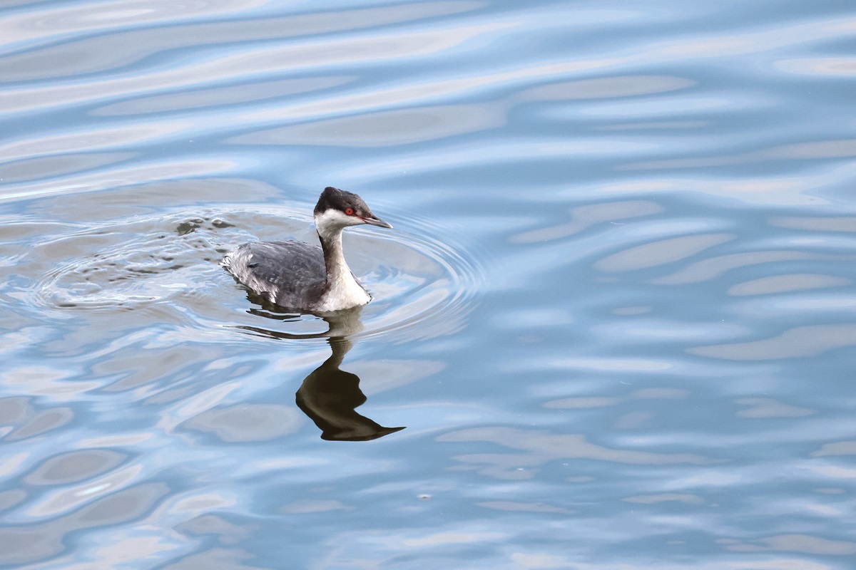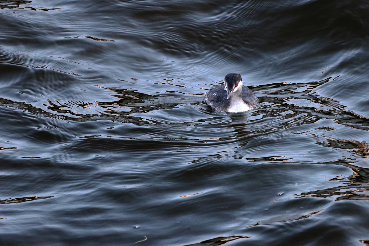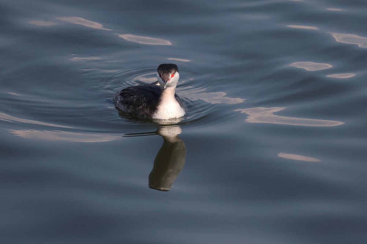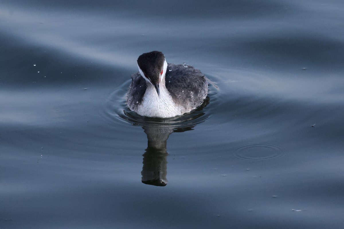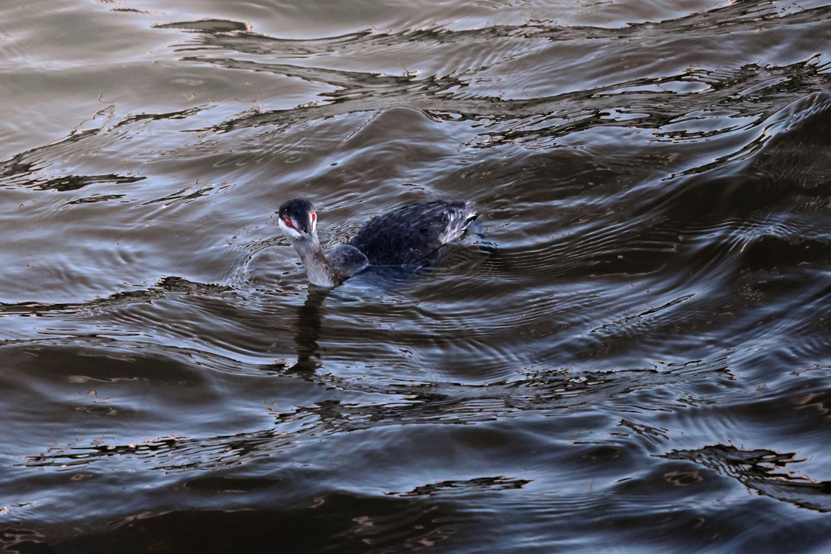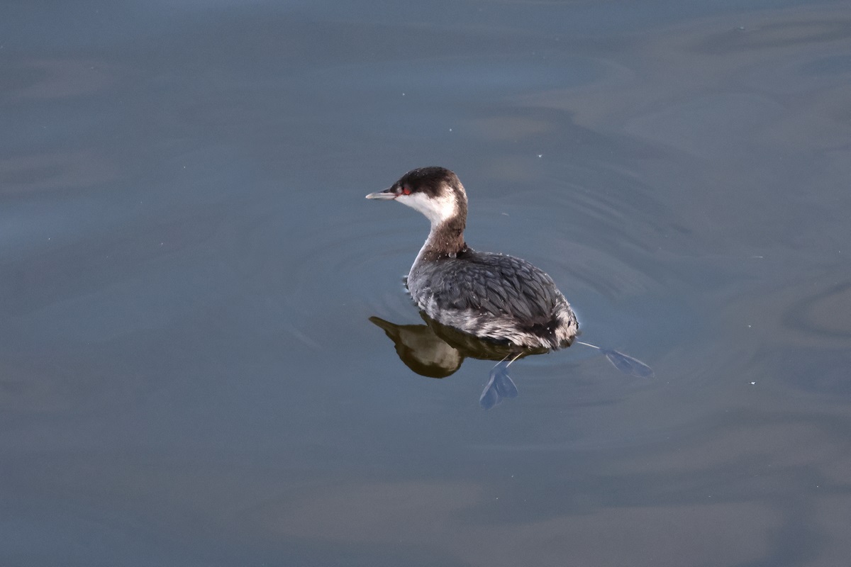 ミミカイツブリ ( 耳 鳰 ) Podiceps auritus Slavonian Grebe L=35cm W=62cm ( 名前の由来 ) 繁殖羽に見られる金色の飾り羽が耳のように見えるからと。 夏羽を見たいねぇ。