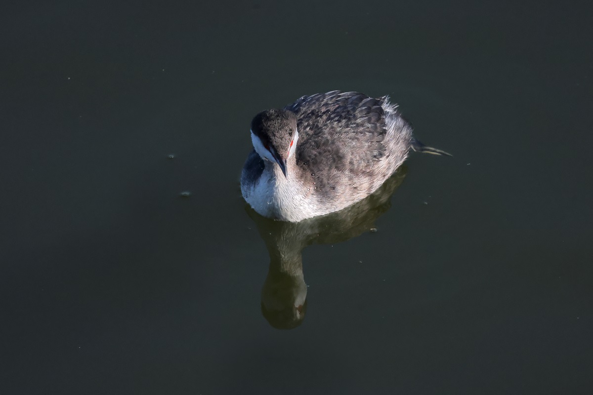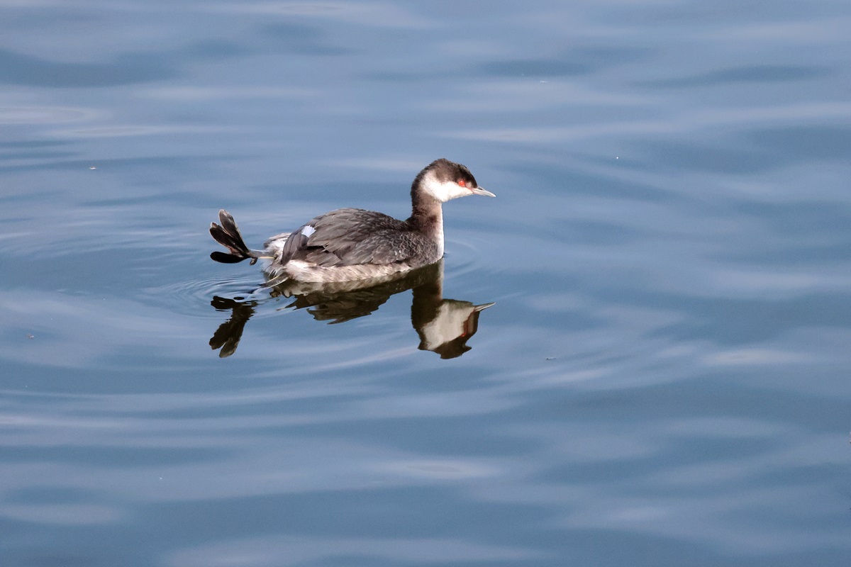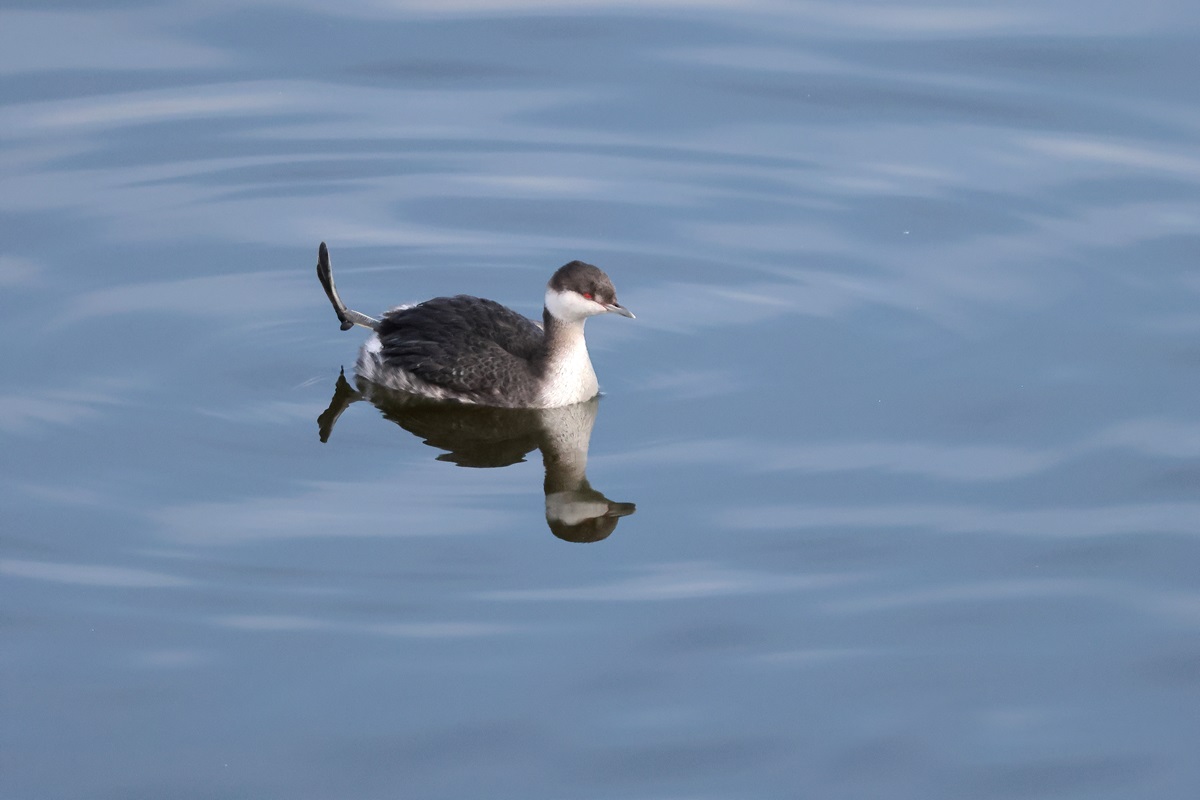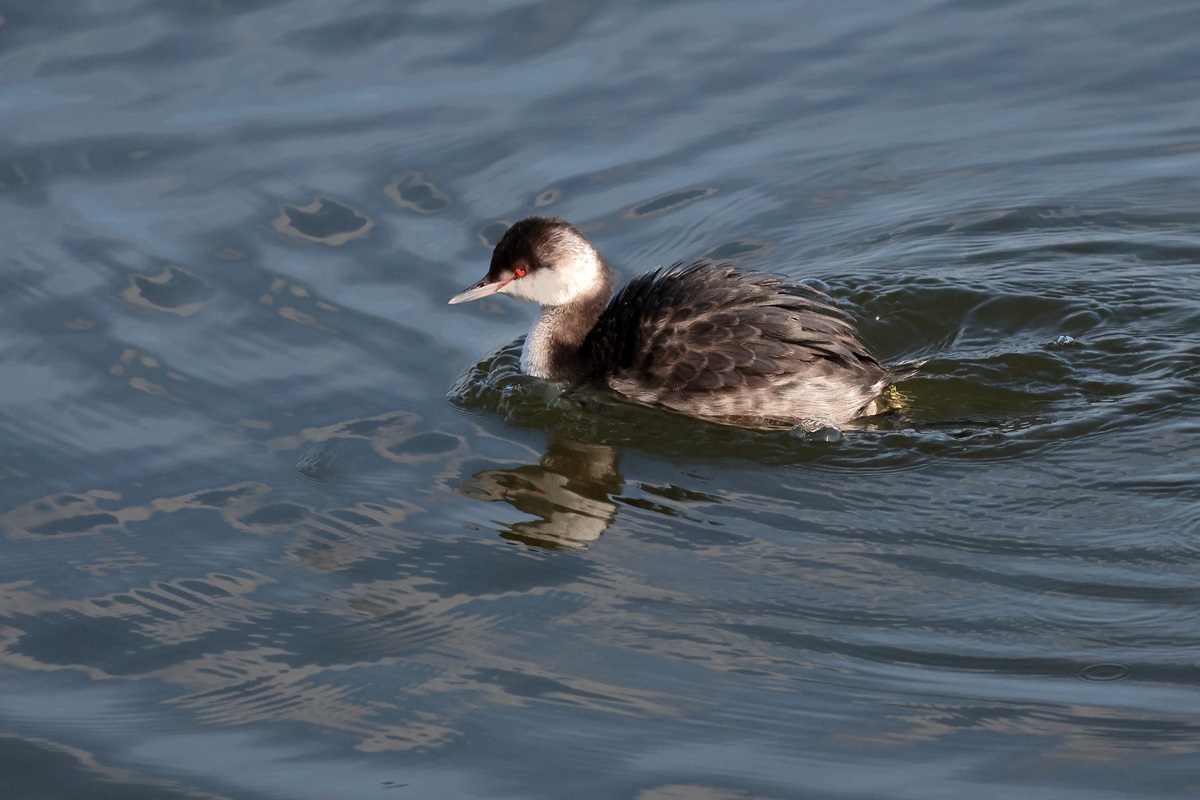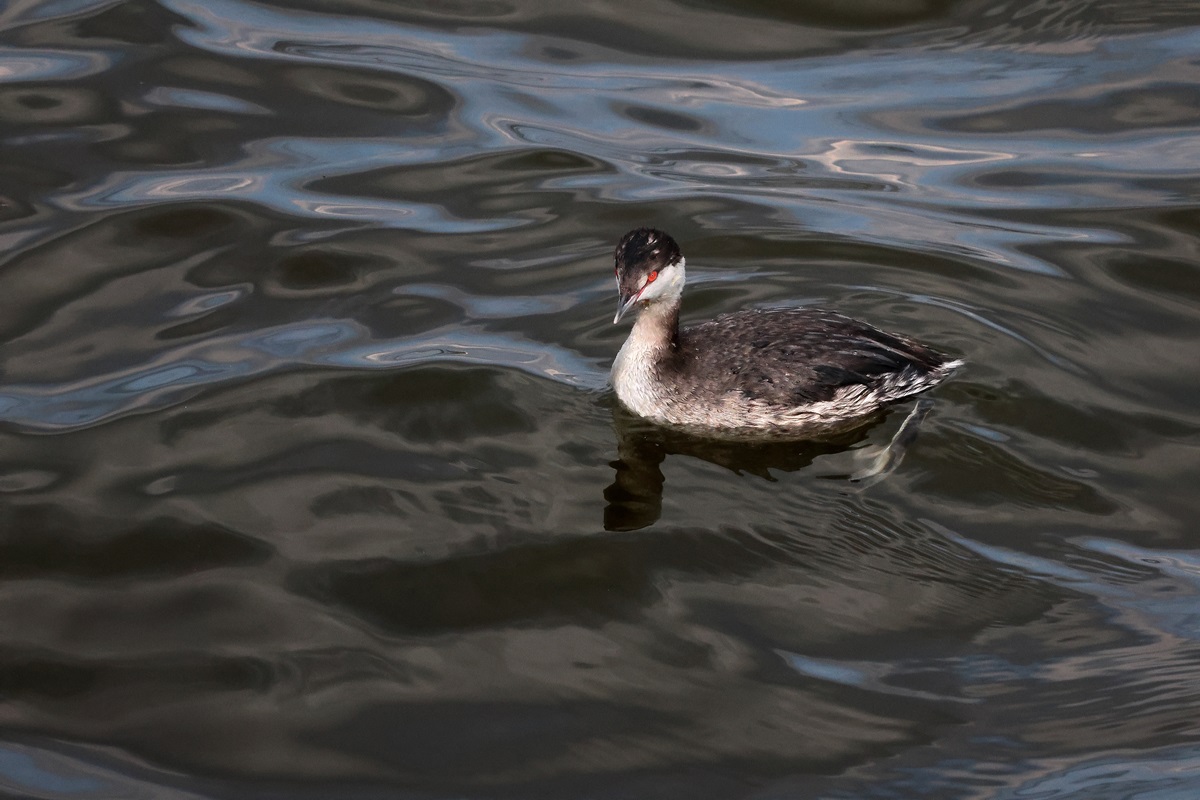 ミミカイツブリ ( 耳 鳰 ) Podiceps auritus Slavonian Grebe L=35cm W=62cm ( 名前の由来 ) 繁殖羽に見られる金色の飾り羽が耳のように見えるからと。 夏羽を見たいねぇ。