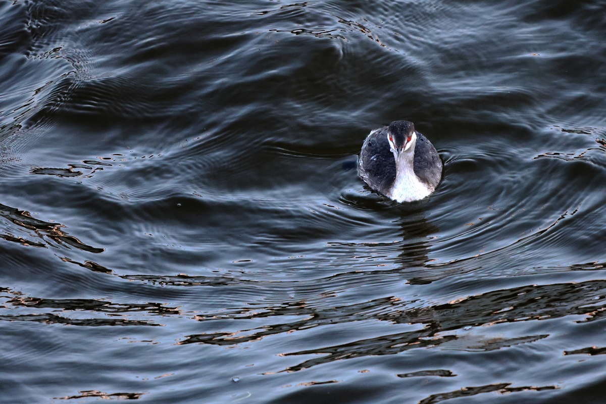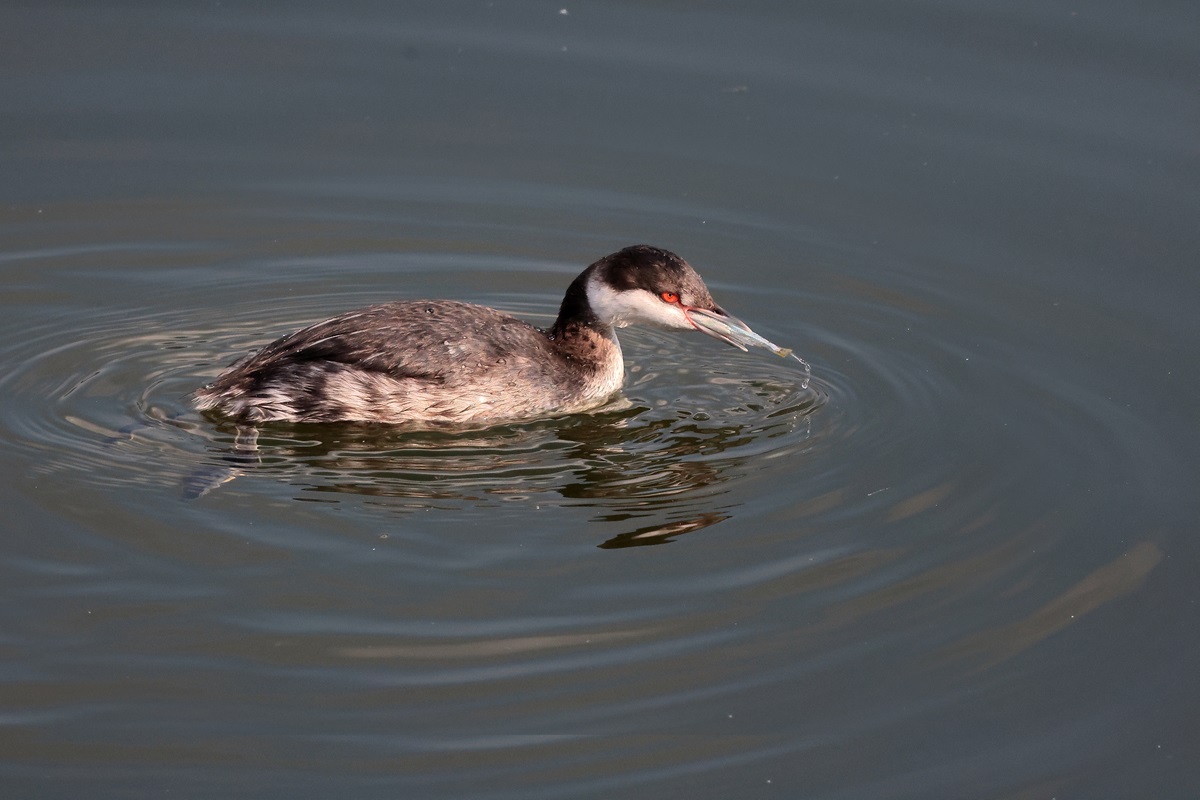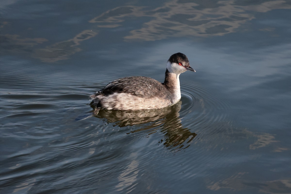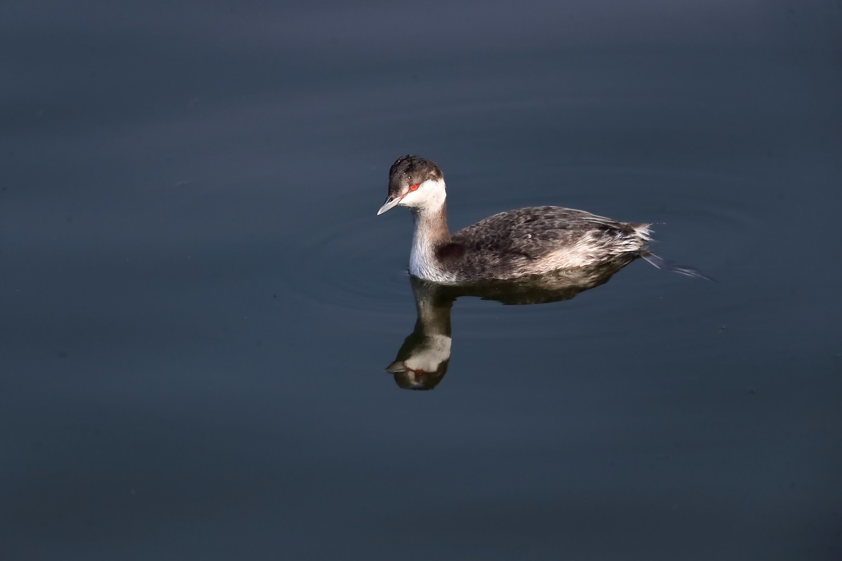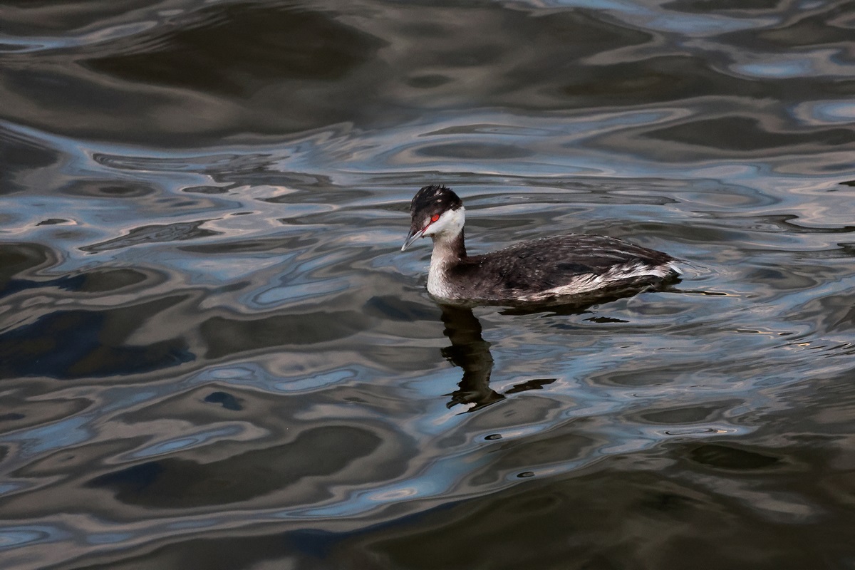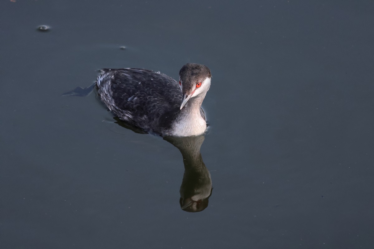 ミミカイツブリ ( 耳 鳰 ) Podiceps auritus Slavonian Grebe L=35cm W=62cm ( 名前の由来 ) 繁殖羽に見られる金色の飾り羽が耳のように見えるからと。 夏羽を見たいねぇ。