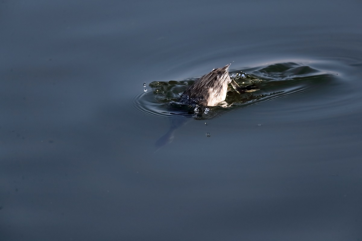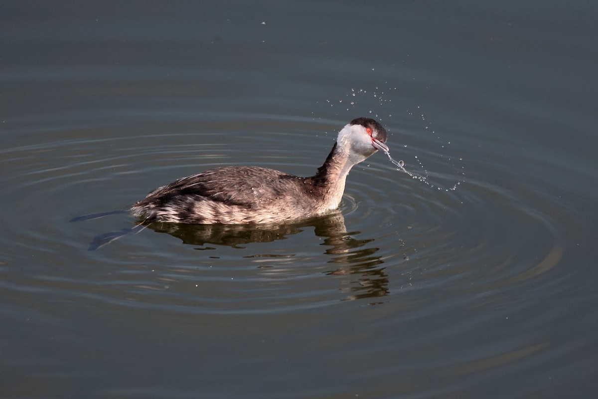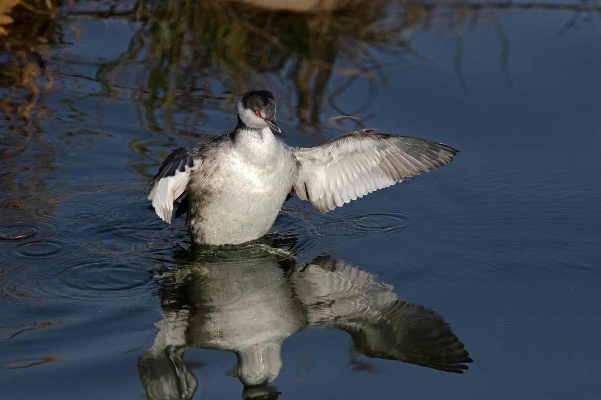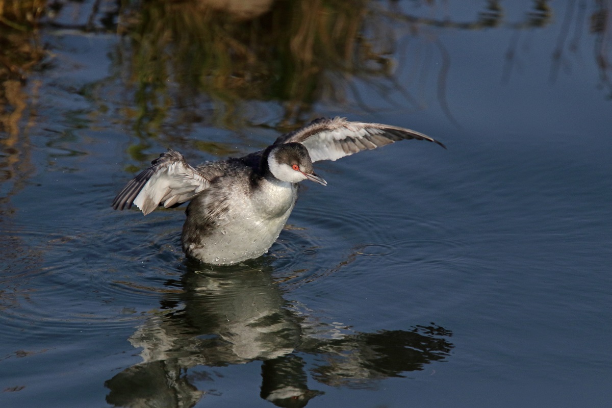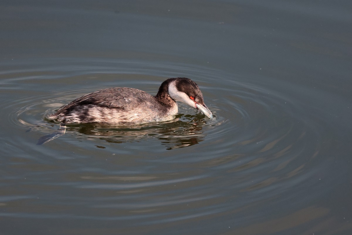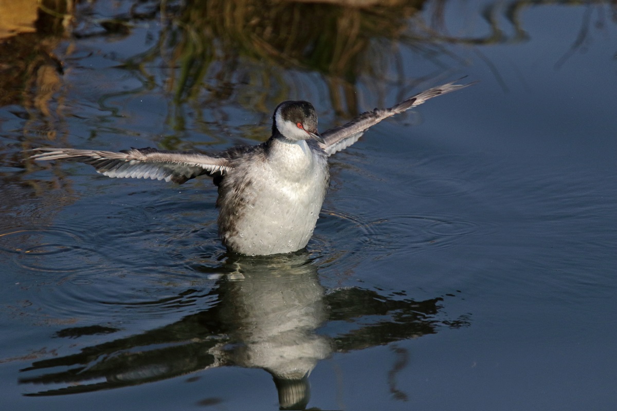 ミミカイツブリ ( 耳 鳰 ) Podiceps auritus Slavonian Grebe L=35cm W=62cm ( 名前の由来 ) 繁殖羽に見られる金色の飾り羽が耳のように見えるからと。 夏羽を見たいねぇ。