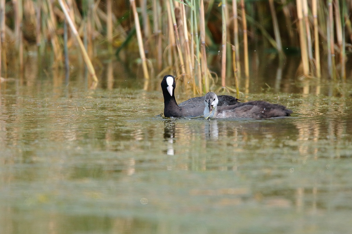 オオバン ( 大 鷭 ) Filica atra Coot L=39cm W=74cm ( 名前の由来 ) バンより大きいので江戸時代前期より ” おおばん ” の名で知られている。 額にはくちばしが延長したような「 額板 」がある。