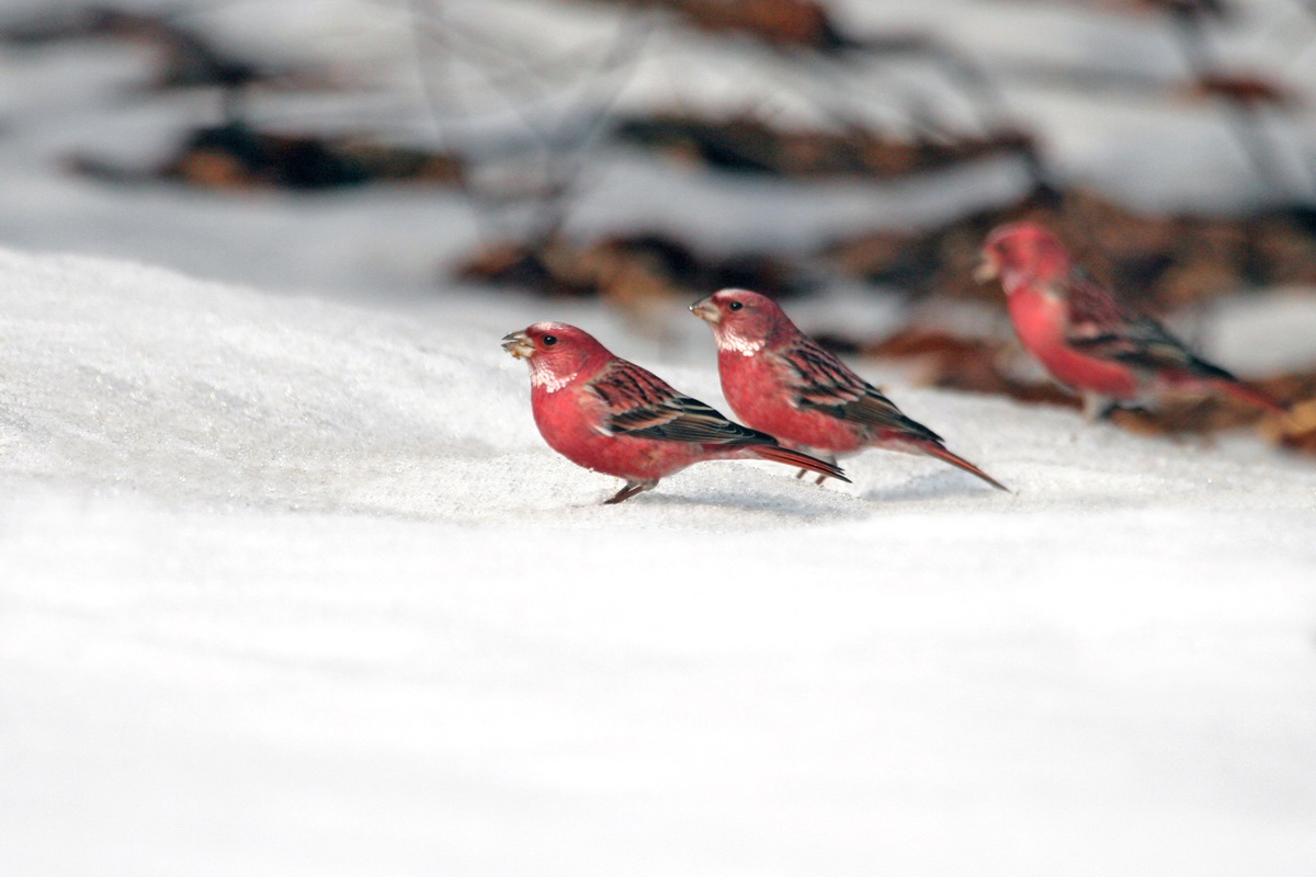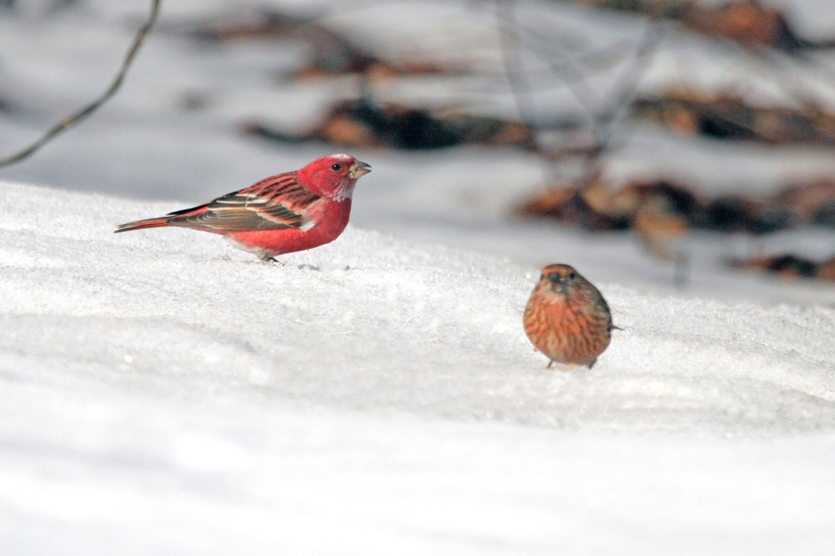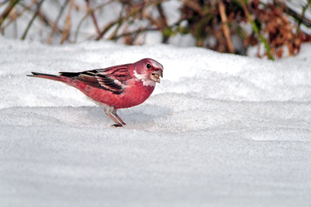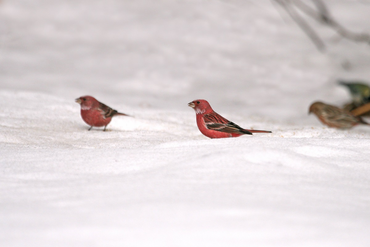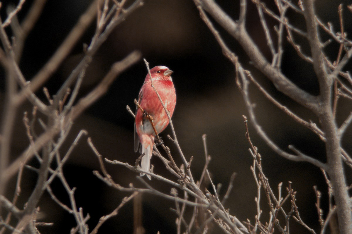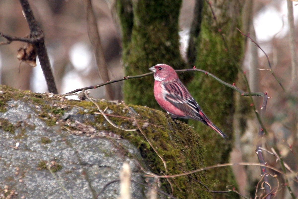 オオマシコ ( 大猿子 ) Carpodacus roseus Pallas' Rosy Finch L=17cm W=27cm ( 名前の由来 ) " 猿の顔のように赤く " ましこ " 又は " さるましこ " と呼ばれたが、 ベニマシコより大型なのでオオマシコと呼んだ 。