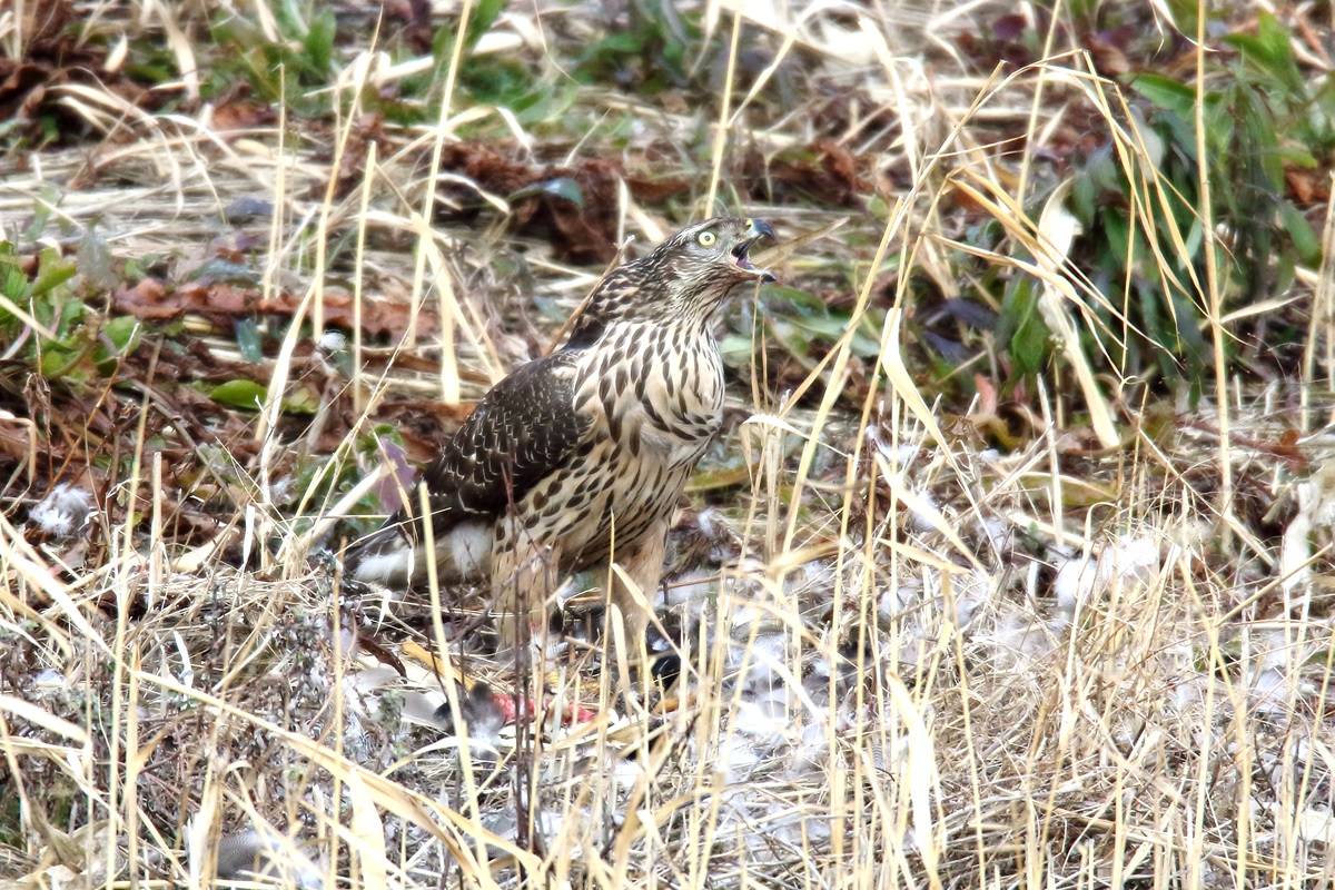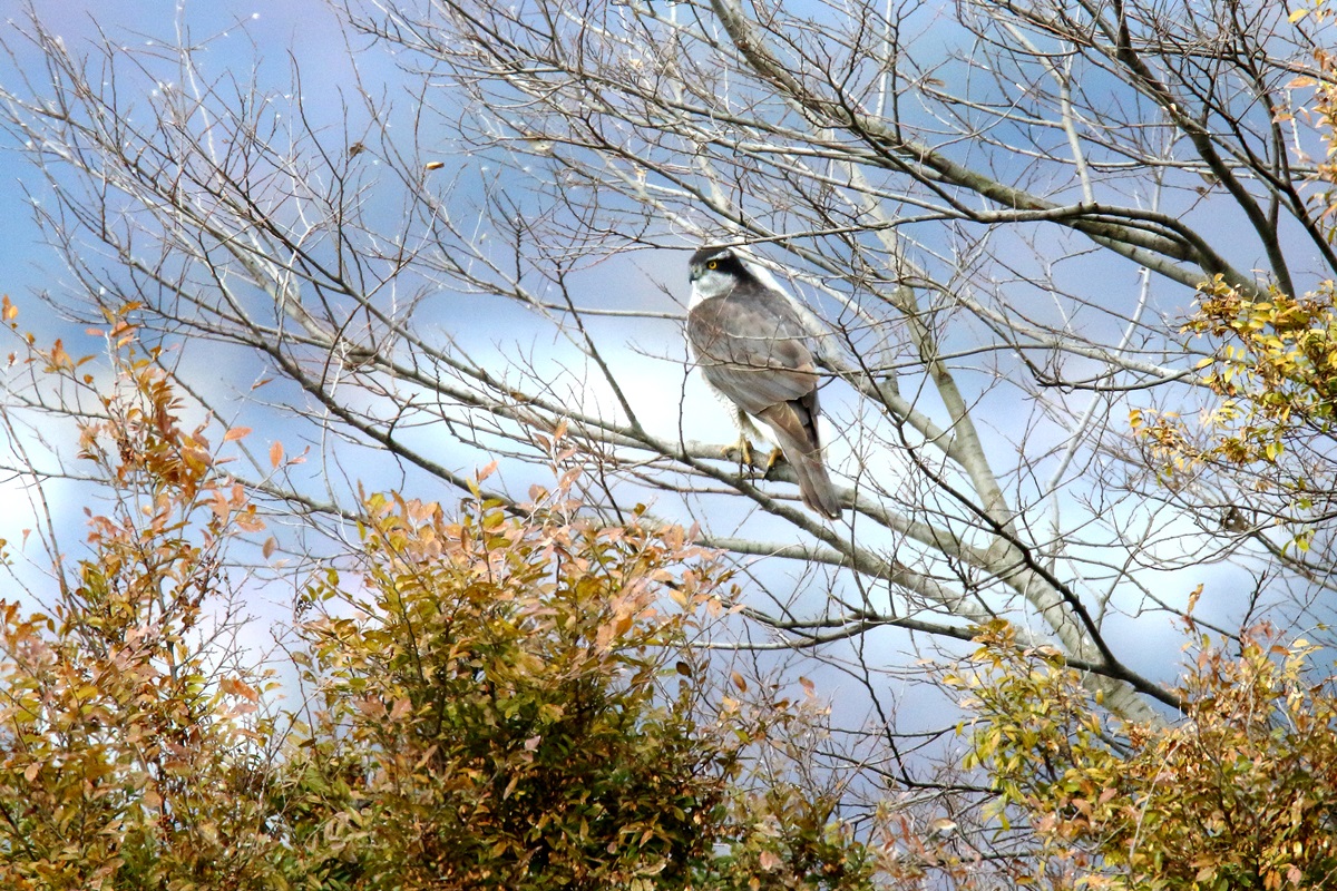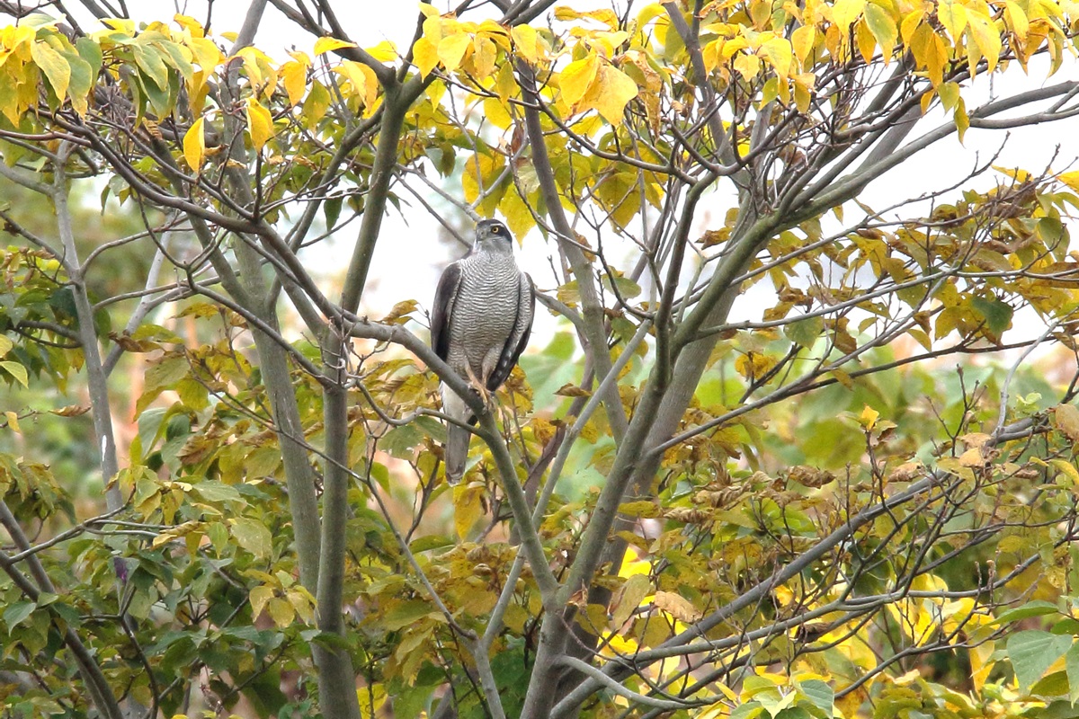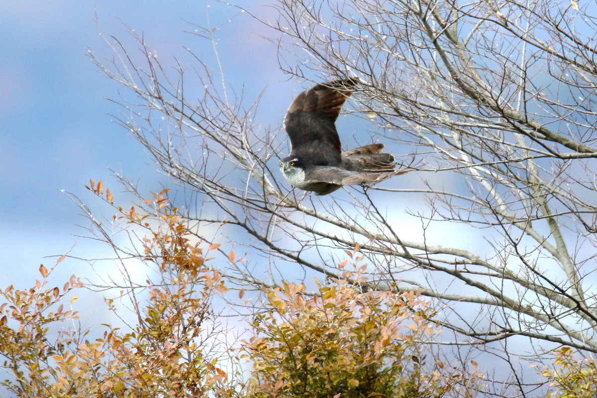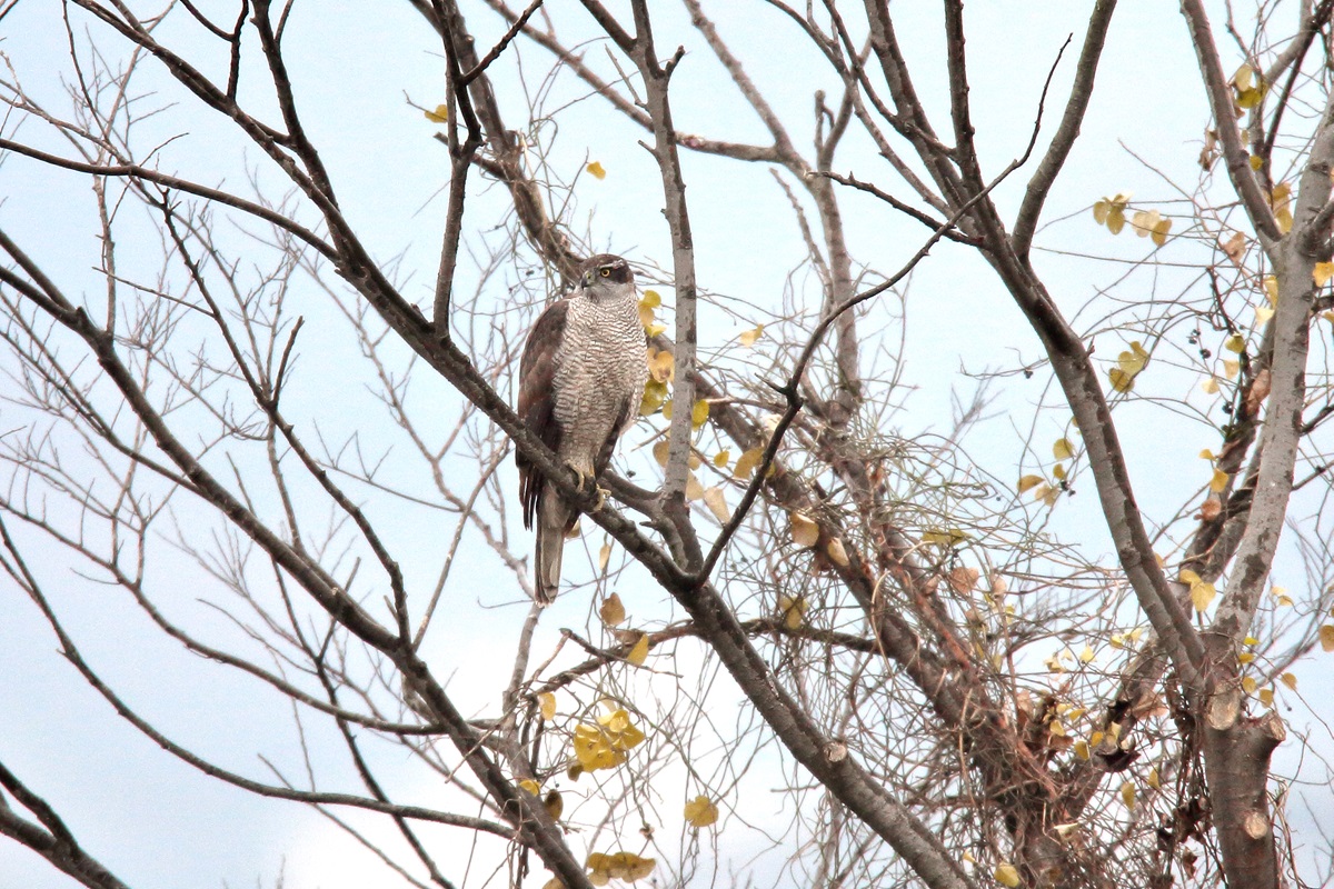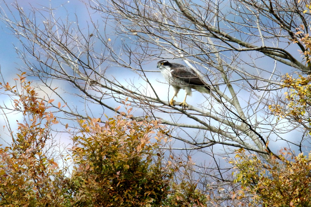 オオタカ ( 蒼 鷹 ) Accipiter gentilis Goshawk L=♂50cm ♀56cm W=106〜131cm ( 名前の由来 ) 成鳥の羽色が主に暗青灰色であるのを、 他のワシ・タカが褐色なのに比べて蒼色としたのであろう。 体が大きく鷹狩りで活躍したメスが「オオタカ」 オスはメスより小さく「勢宇」と呼ばれていた。