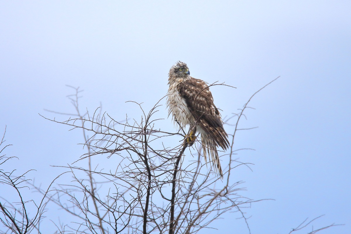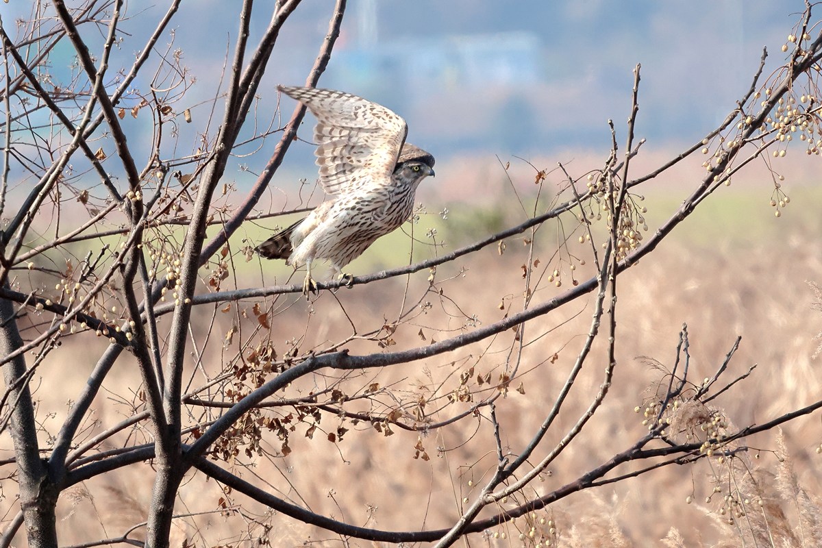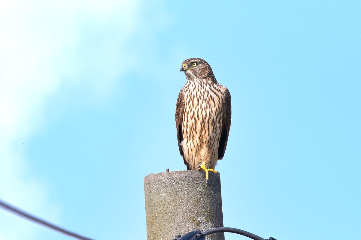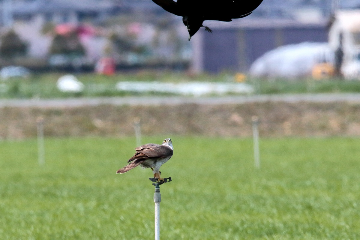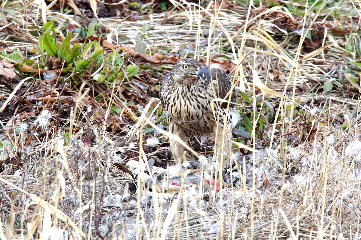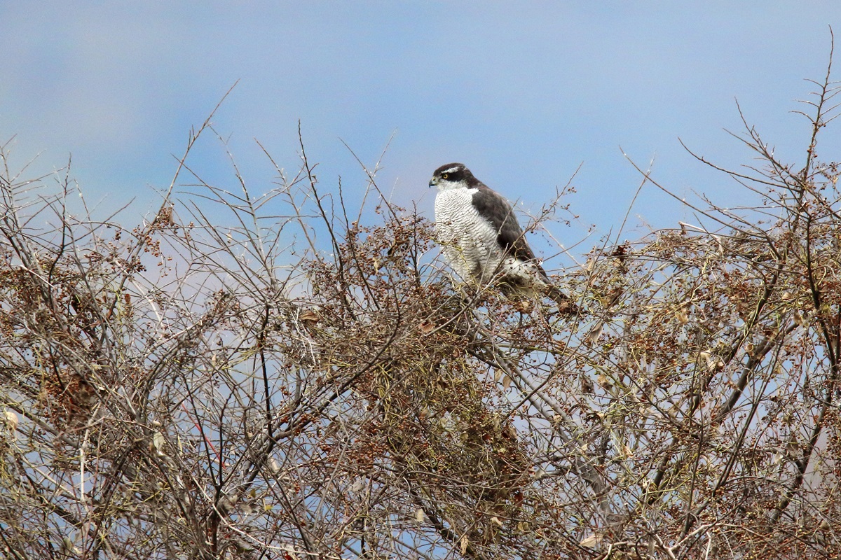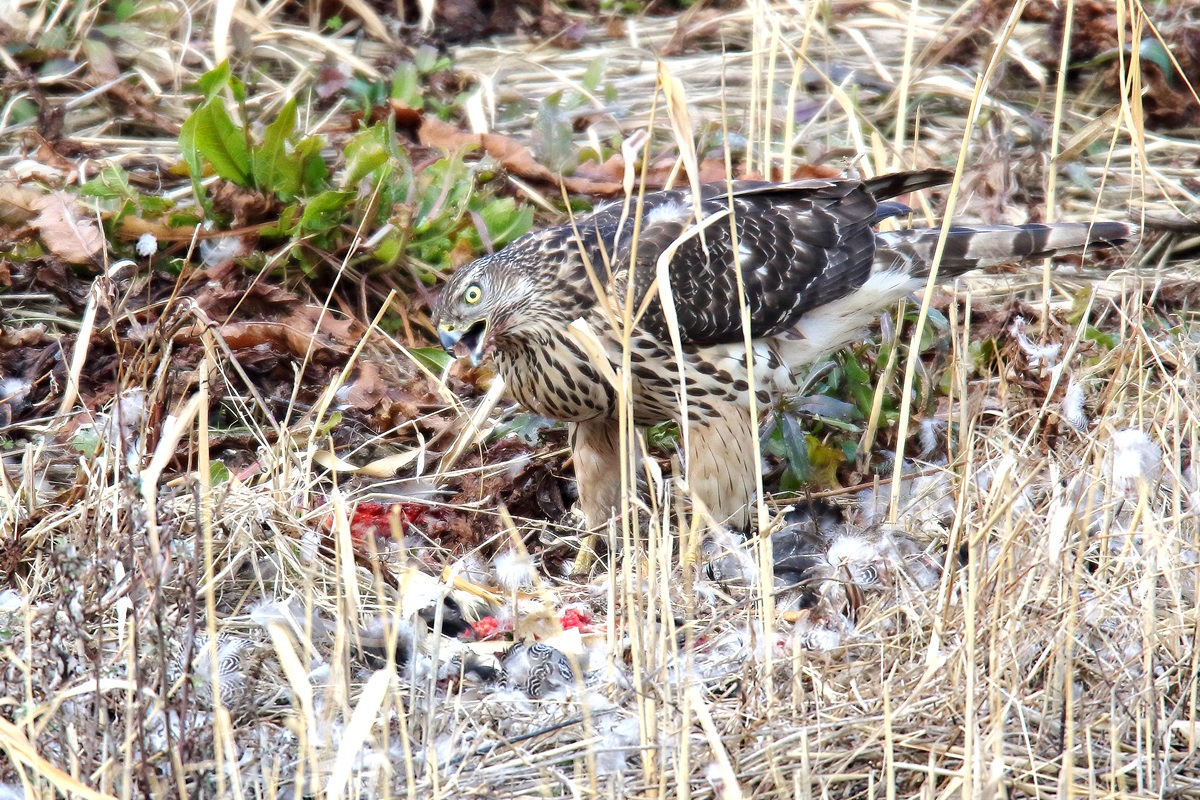 オオタカ ( 蒼 鷹 ) Accipiter gentilis Goshawk L=♂50cm ♀56cm W=106〜131cm ( 名前の由来 ) 成鳥の羽色が主に暗青灰色であるのを、 他のワシ・タカが褐色なのに比べて蒼色としたのであろう。 体が大きく鷹狩りで活躍したメスが「オオタカ」 オスはメスより小さく「勢宇」と呼ばれていた。