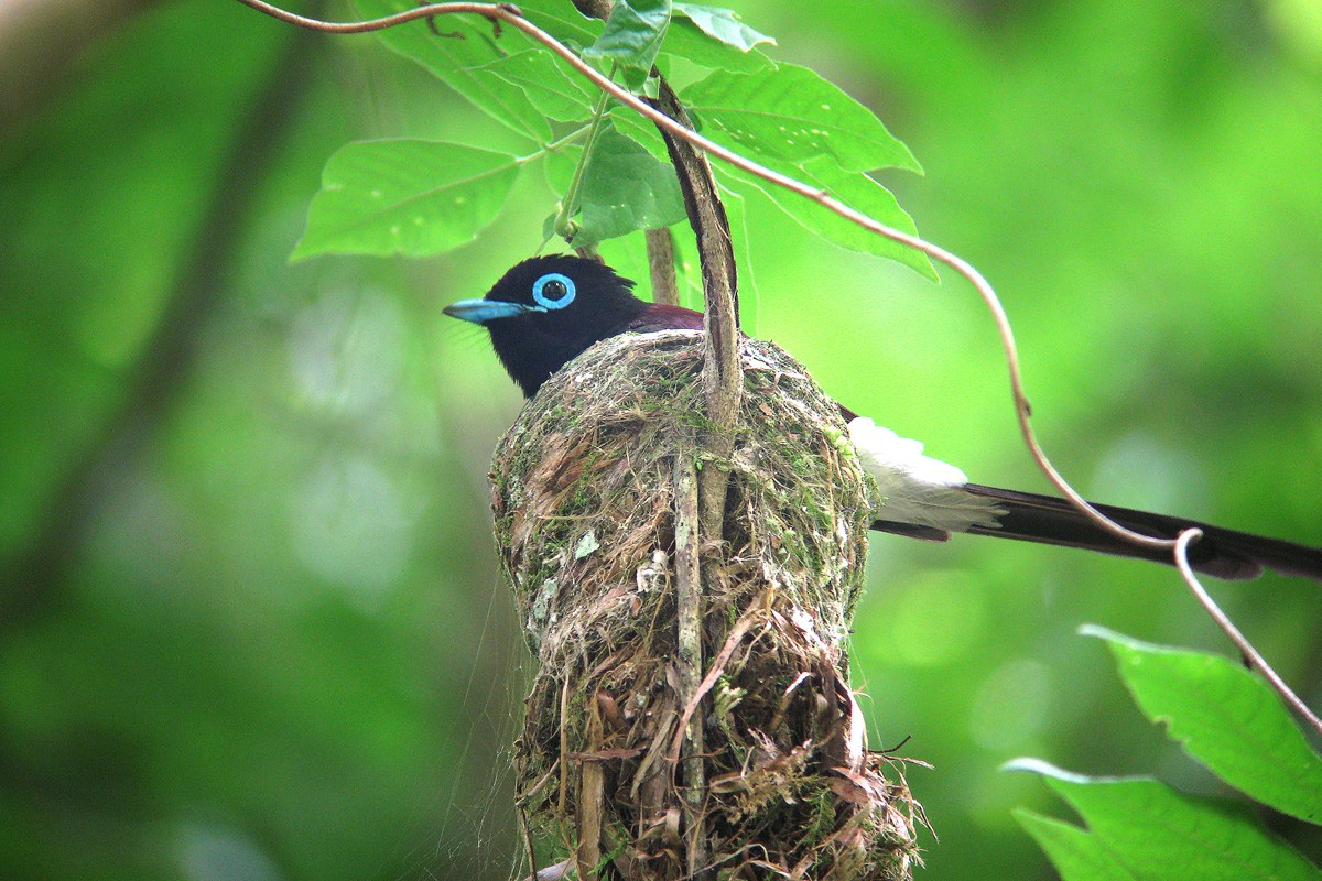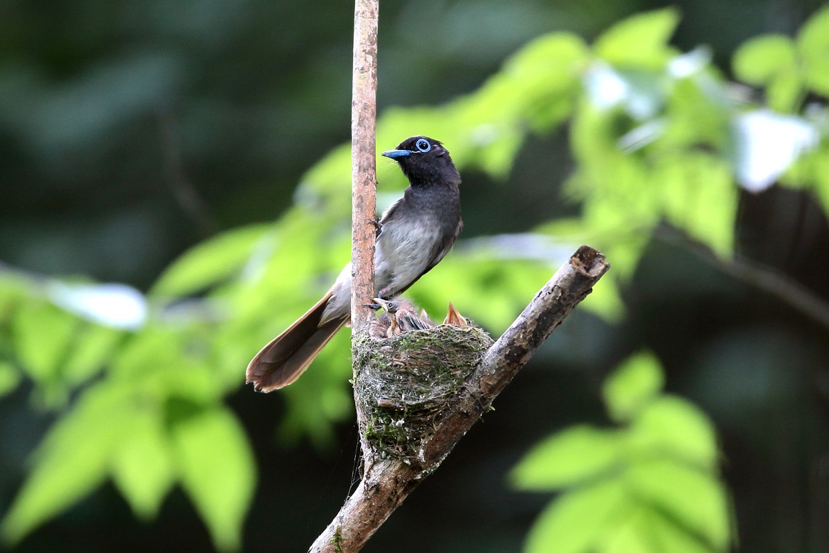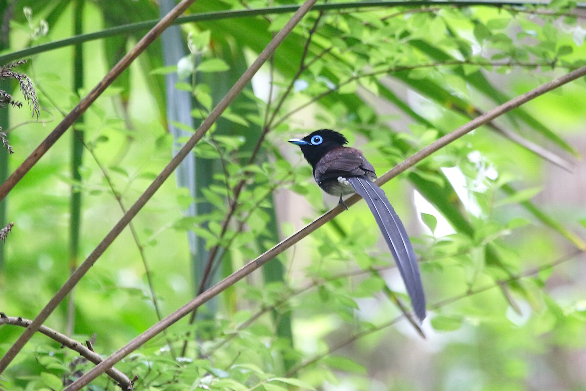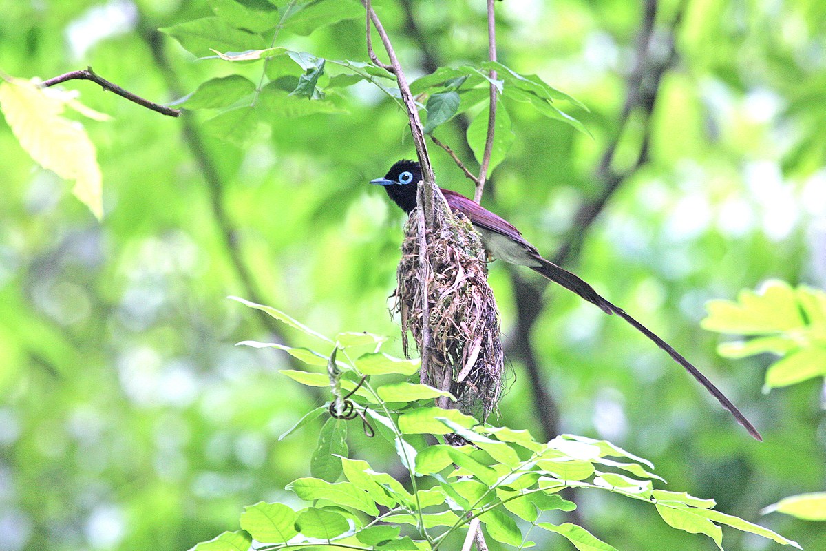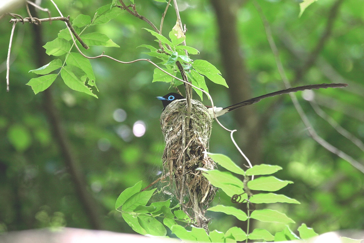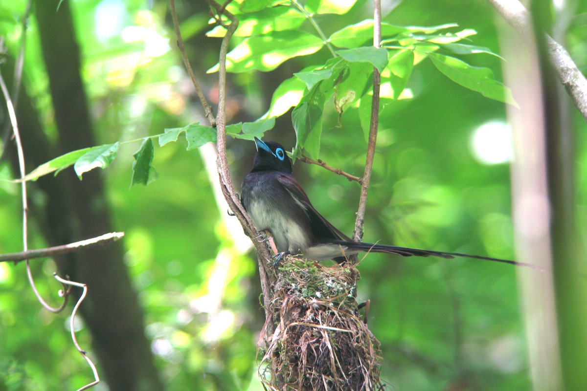 サンコウチョウ ( 三光鳥 ) Terpsiphone atrocaudata Black Paradise Flycatcher L=♂45cm ♀17cm W=28cm ( 名前の由来 ) ” ツキ 「 月 」 ヒー 「 陽 」 ホシ 「 星 」・・・ ホイホイホイ ” と 三つの光を表す音で囀るから。