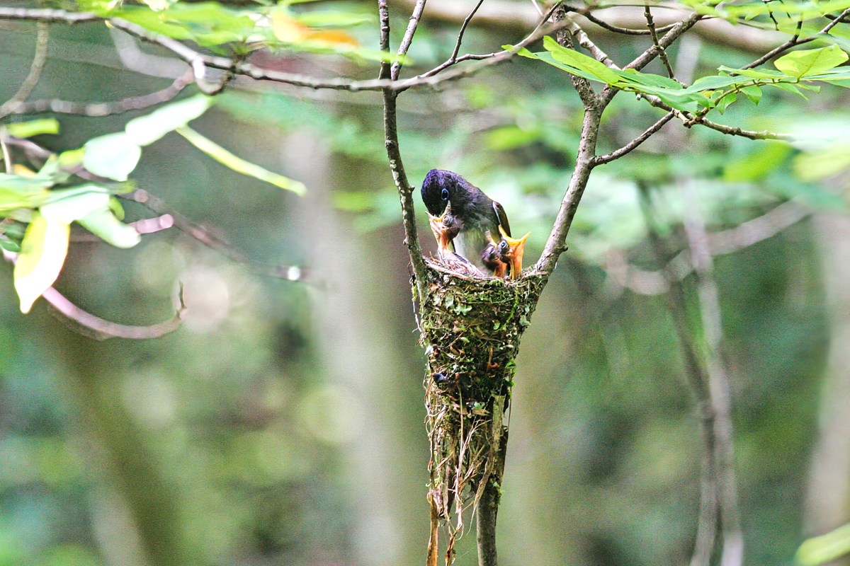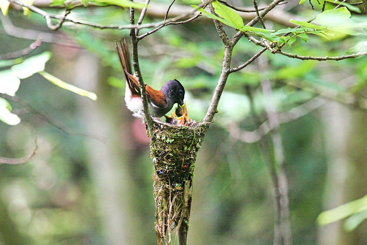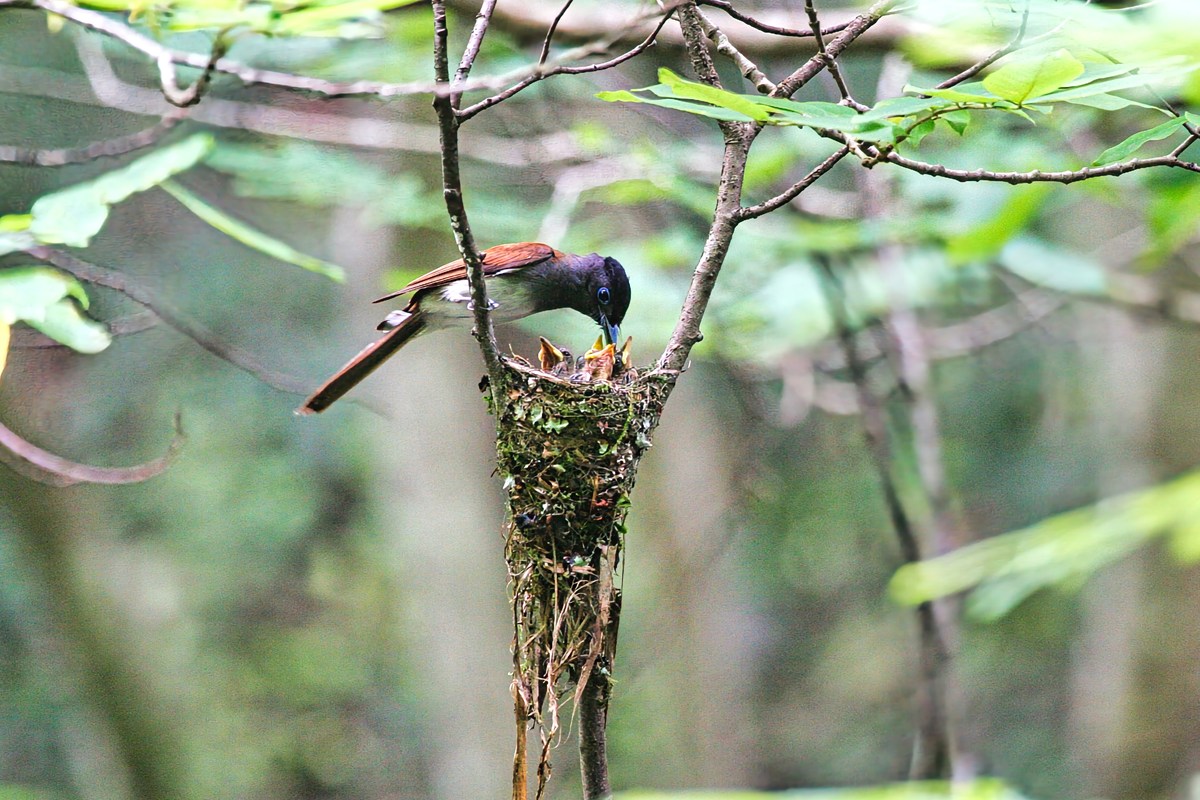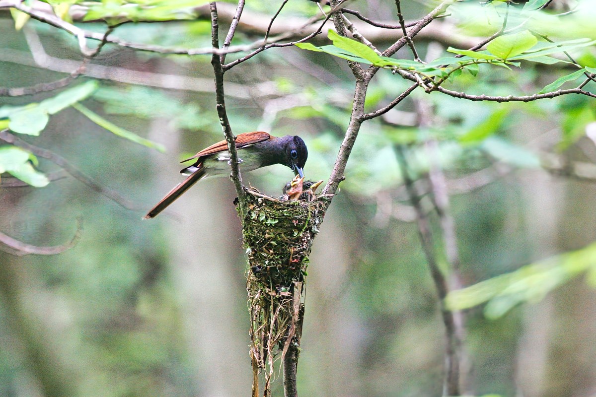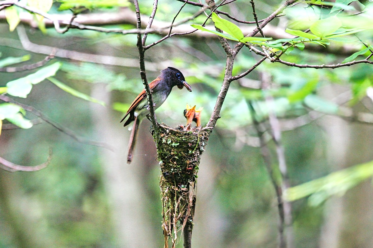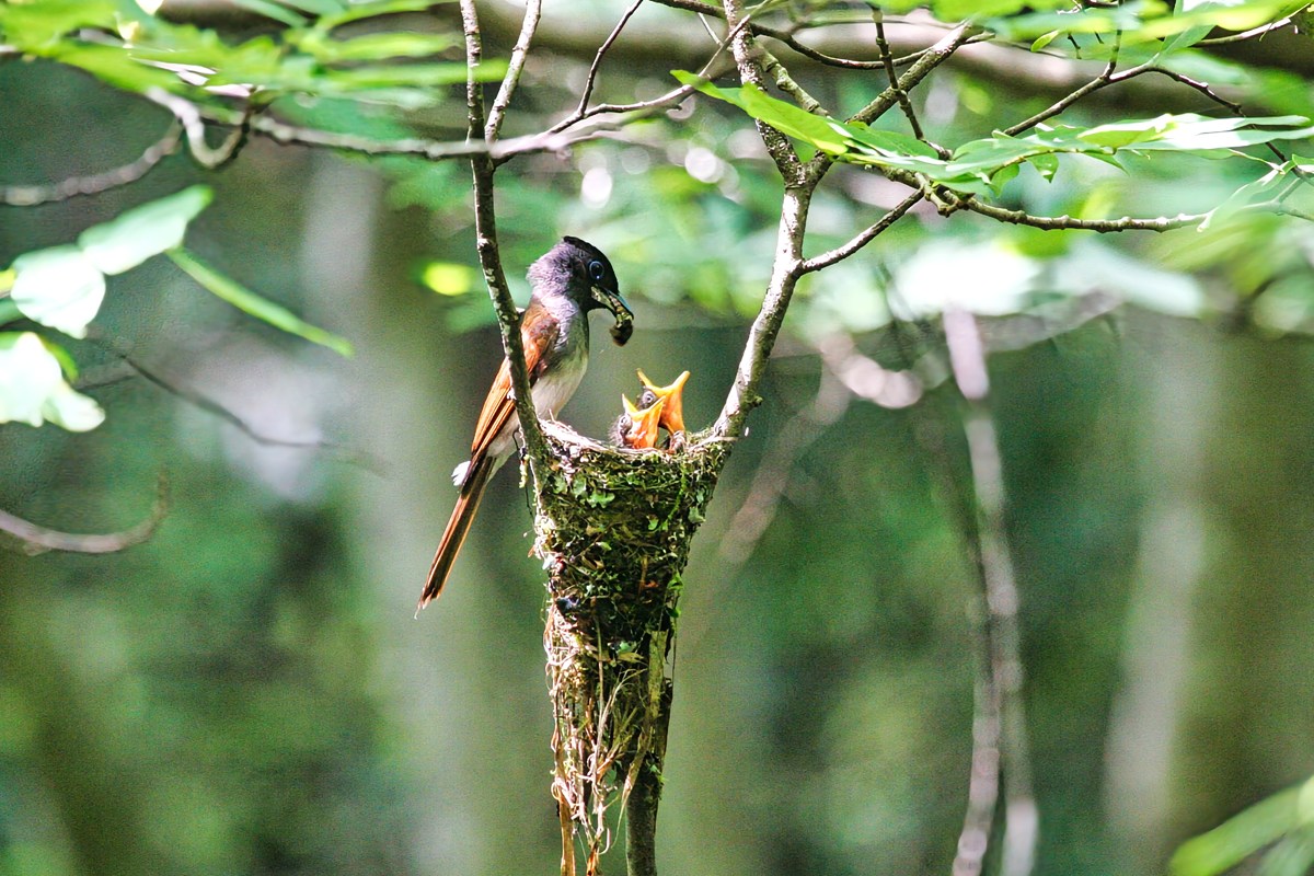 サンコウチョウ ( 三光鳥 ) Terpsiphone atrocaudata Black Paradise Flycatcher L=♂45cm ♀17cm W=28cm ( 名前の由来 ) ” ツキ 「 月 」 ヒー 「 陽 」 ホシ 「 星 」・・・ ホイホイホイ ” と 三つの光を表す音で囀るから。