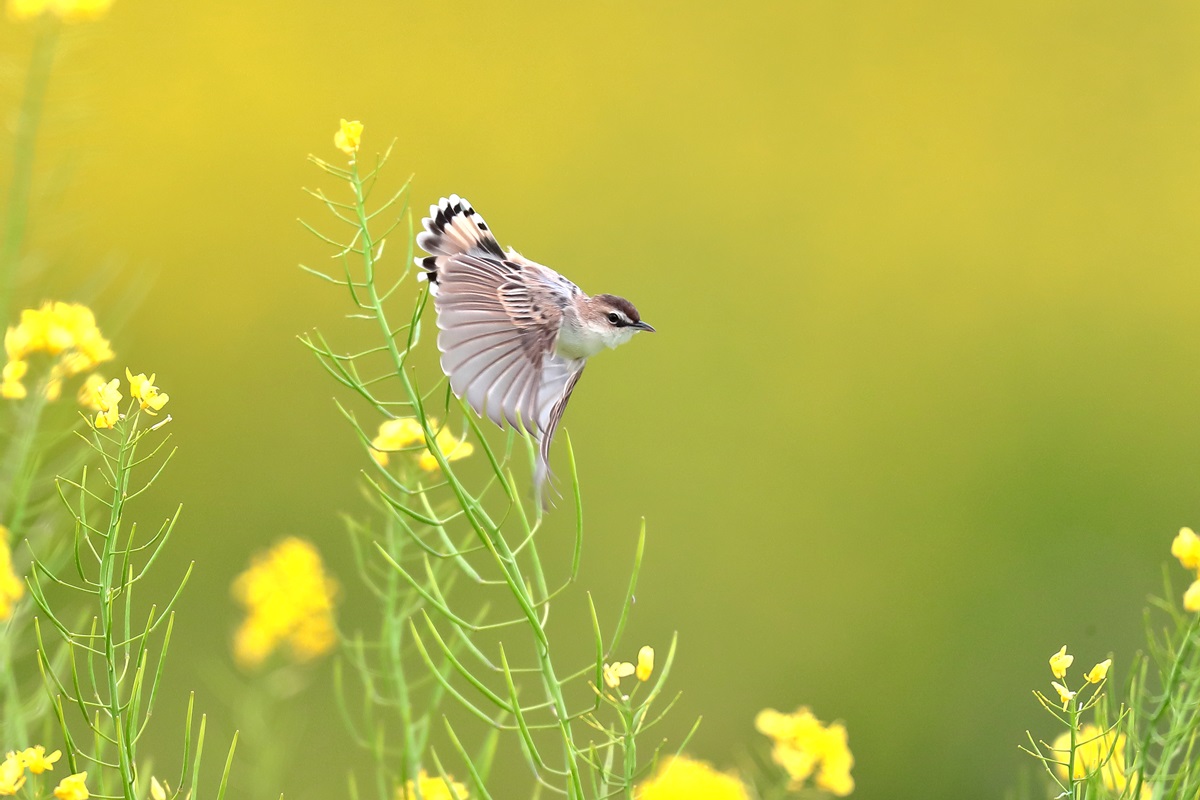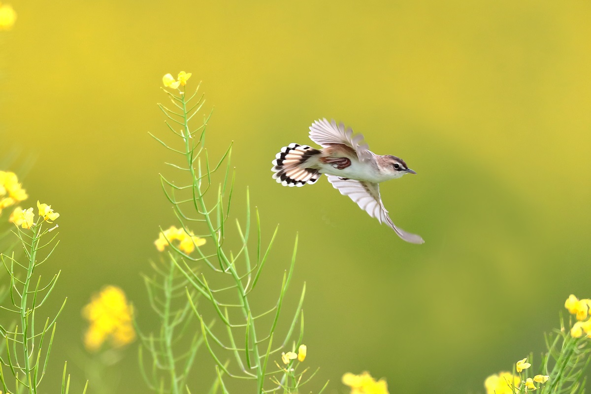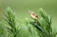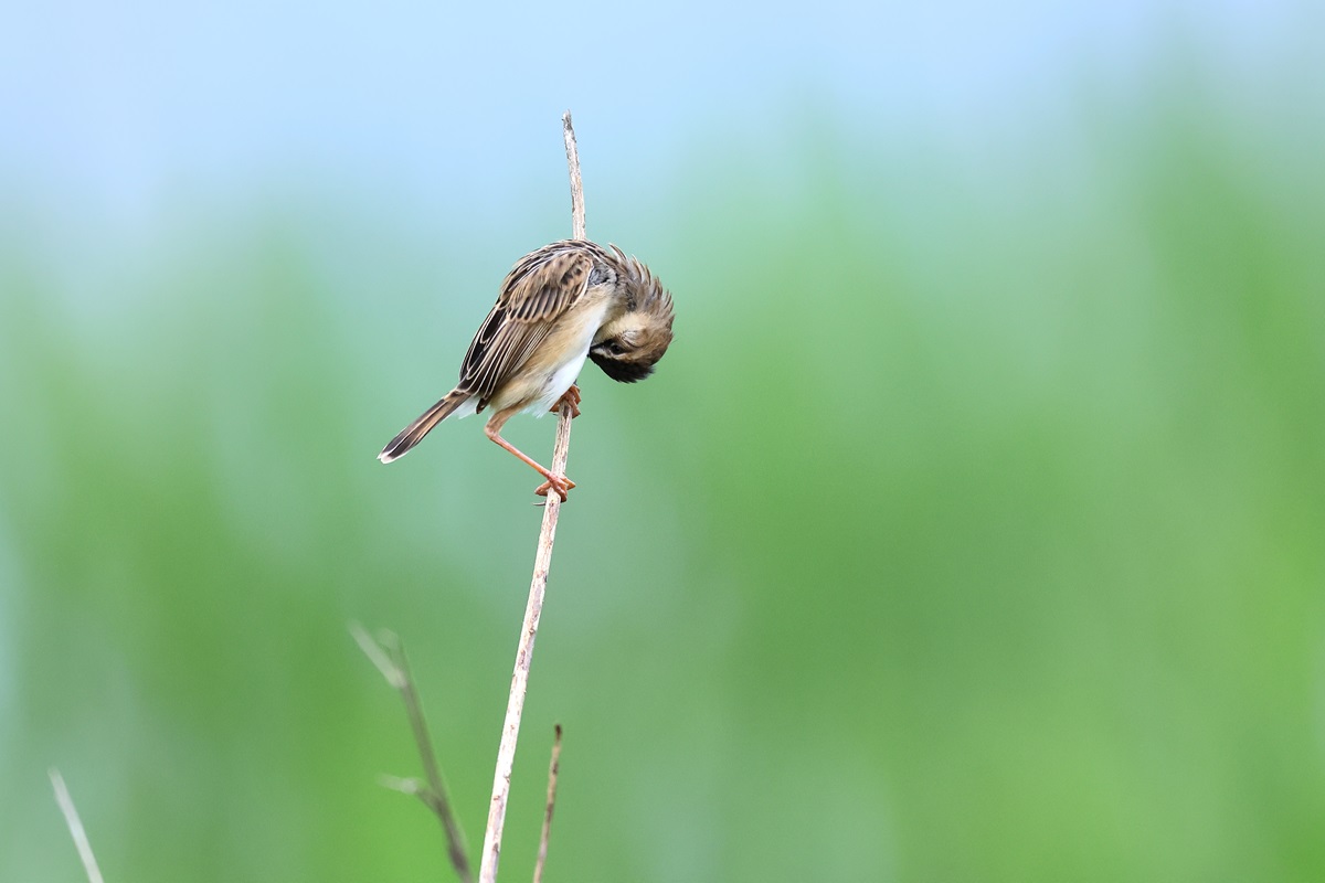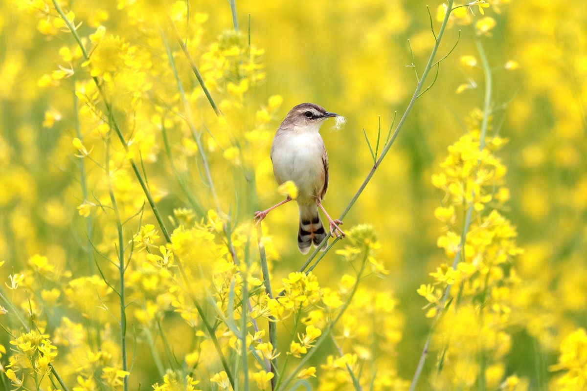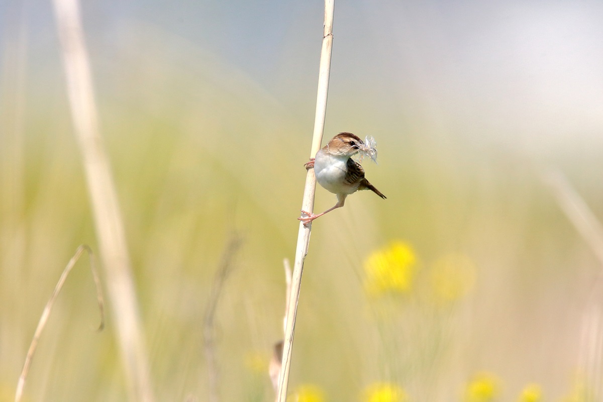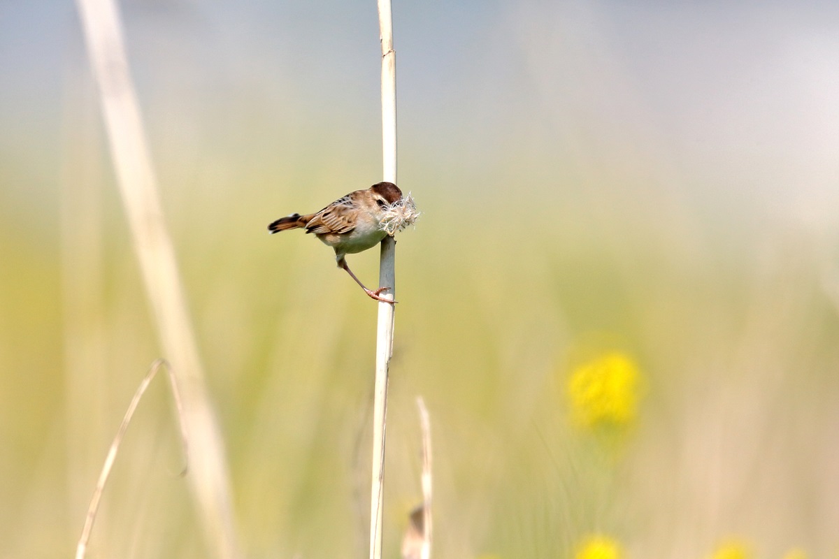 巣作り中にチガヤの白い穂をくわえて飛ぶことから