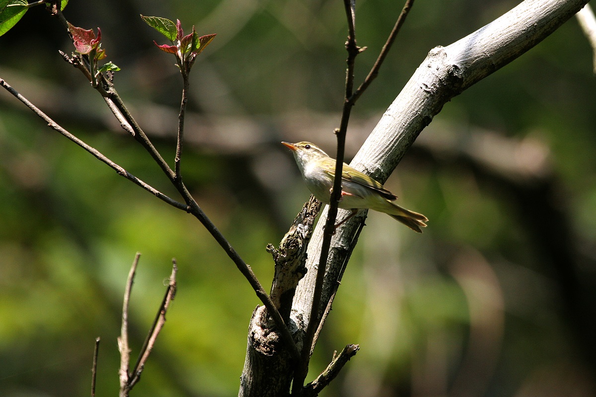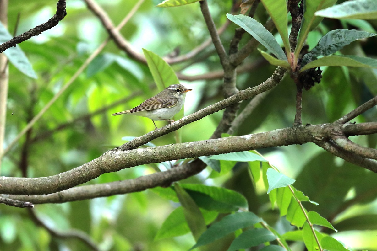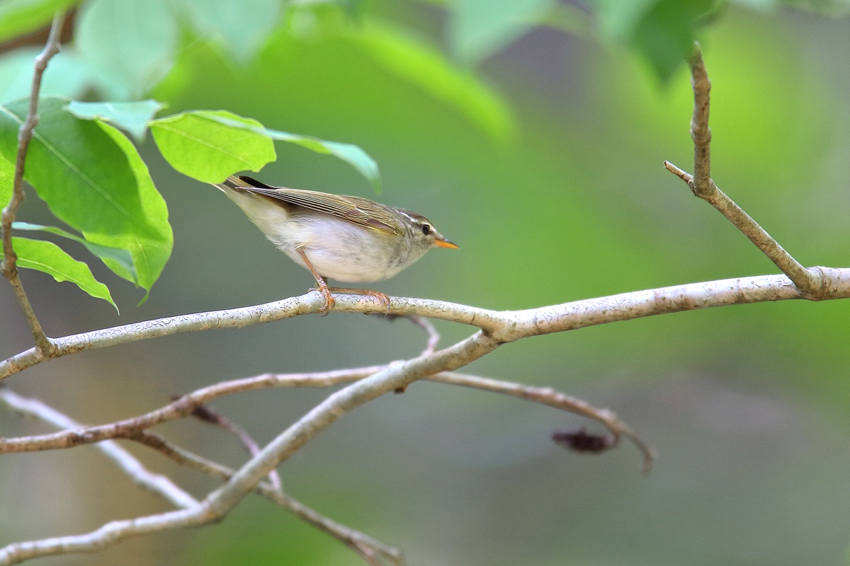 センダイムシクイ ( 仙台虫喰 ) Phylloscopus occipitalis Crowned Willow Warbler L=13cm W=19cm ( 名前の由来 ) 鳴き声から " ちよ( 千代 )むしくひ " と呼ばれたのが、 " せんだい( 千代 )むしくひ " と呼ばれるようになった。