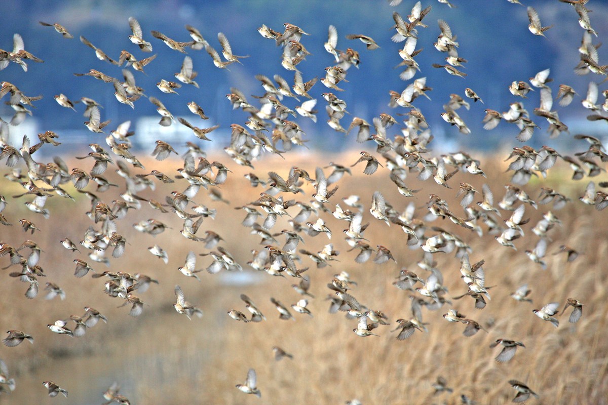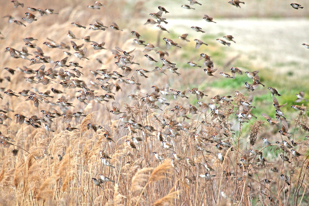 スズメ ( 雀 ) Passer montanus Tree Sparrow L=14cm W=23cm ( 名前の由来 ) 鳴き声が シュ、シュ ( ジュ )、と聞こえることから 「 スズ 」 「 メ 」 は群れる鳥ということ 。