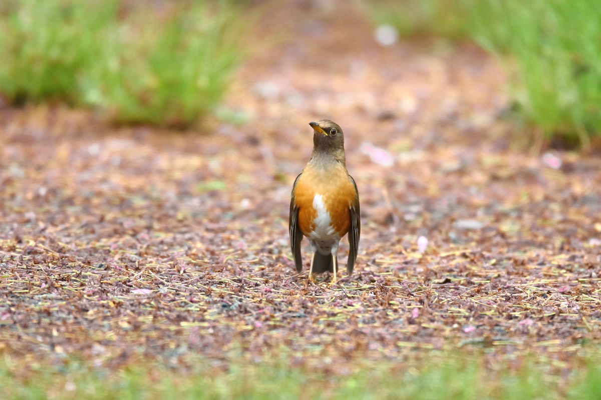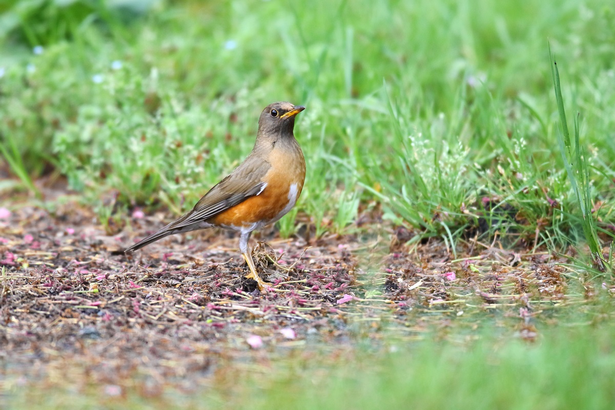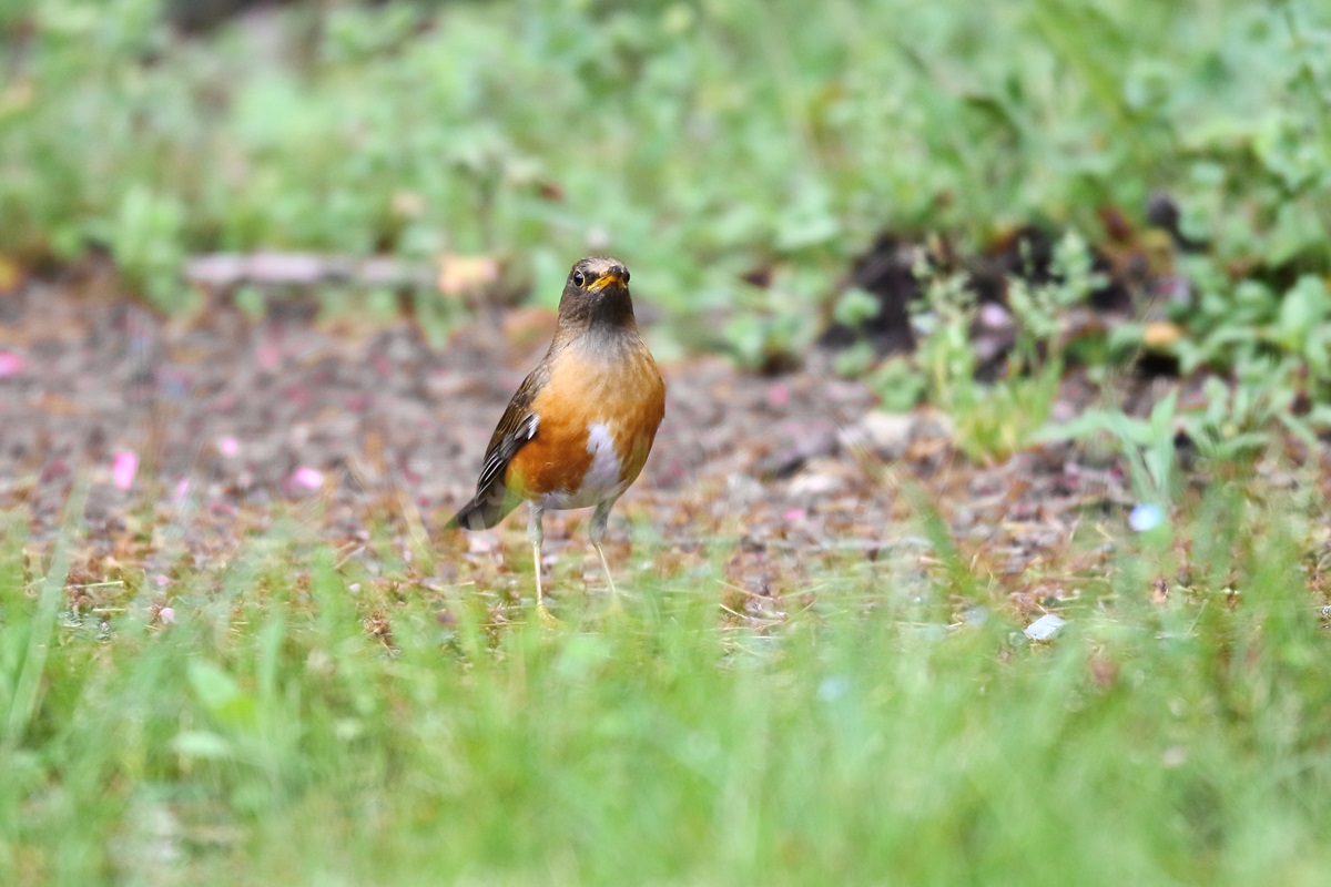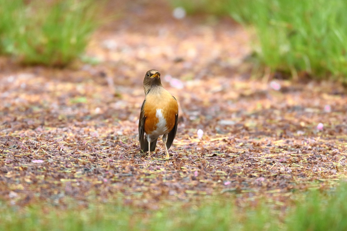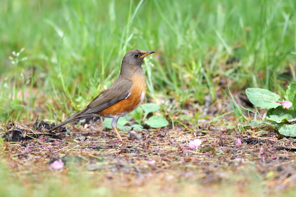 アカハラ ( 赤 腹 ) Turdus chrysolaus Brown Thrush L=24cm W=37cm ( 名前の由来 ) 胸腹の両脇が赤褐色であるため、 多くの異名がある、 あかじなひ ・ あかじなへ ・ あかはらしなひ ・ ちゃじない ・・・ 等々。