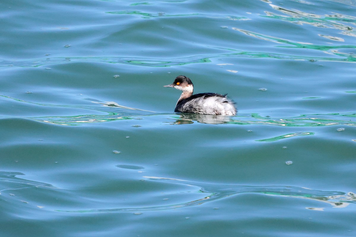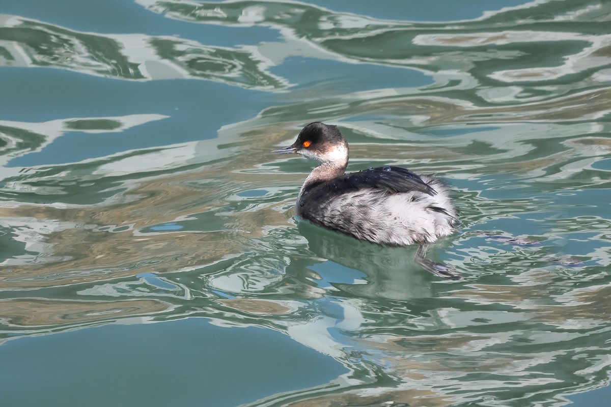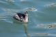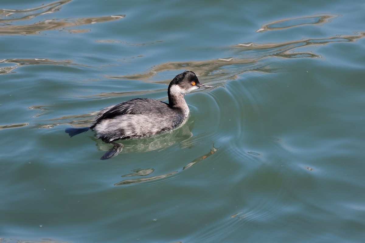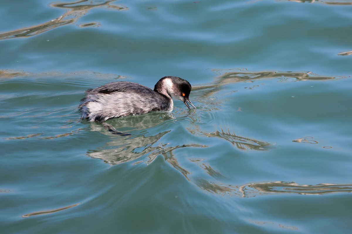 ハジロカイツブリ ( 羽白鳰 ) Podiceps nigricollis Black-necked Grede L=33cm W=56cm ( 名前の由来 ) 飛びたつと羽の内側に白い部分が見え、これが名前の由来になっている。 カイツブリとは その昔 動きを見て・・・掻き頭潜り( かきつぶり )と名付けた。