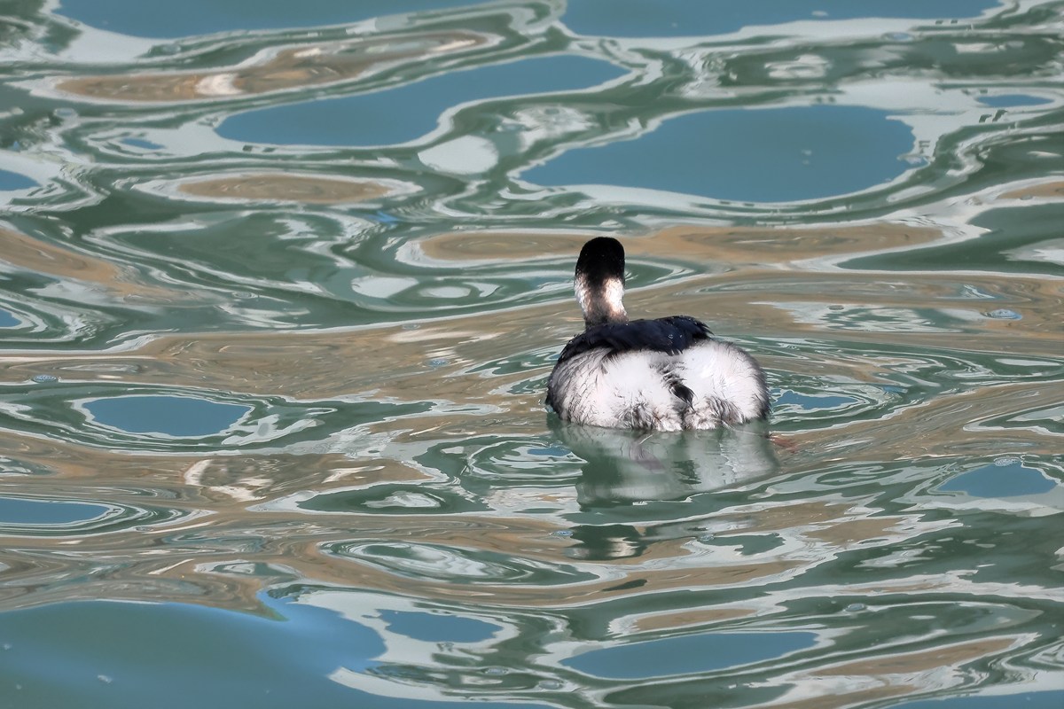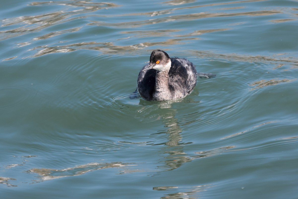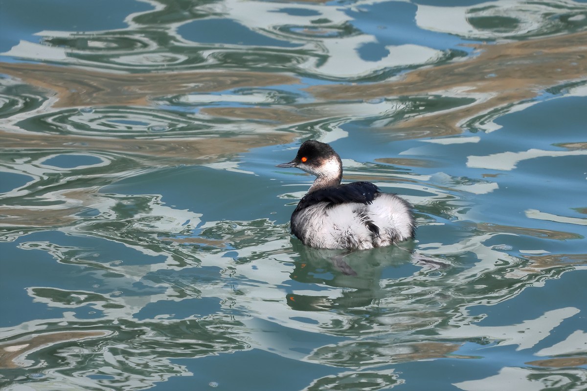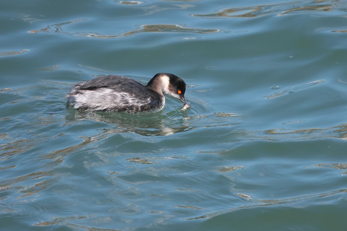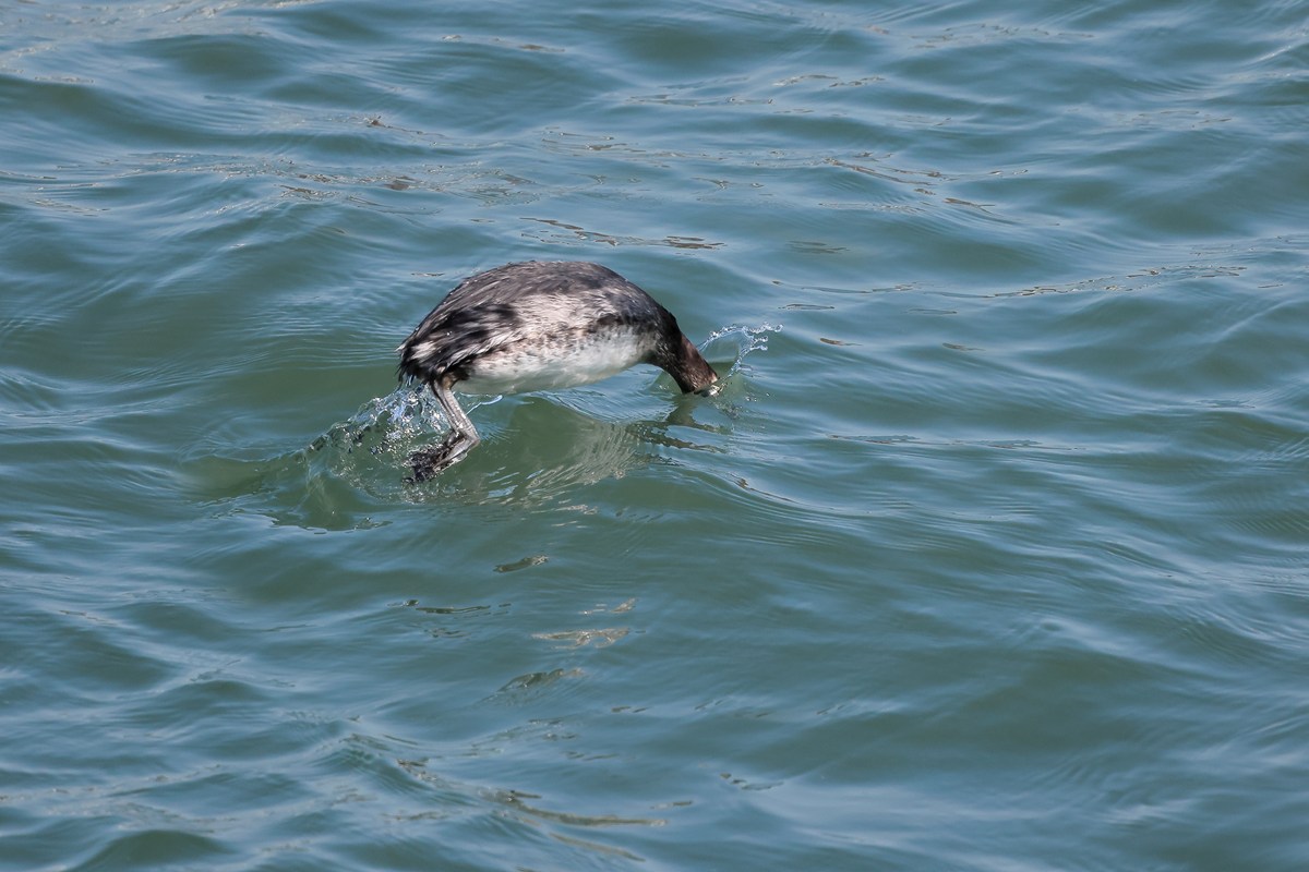 ハジロカイツブリ ( 羽白鳰 ) Podiceps nigricollis Black-necked Grede L=33cm W=56cm ( 名前の由来 ) 飛びたつと羽の内側に白い部分が見え、これが名前の由来になっている。 カイツブリとは その昔 動きを見て・・・掻き頭潜り( かきつぶり )と名付けた。